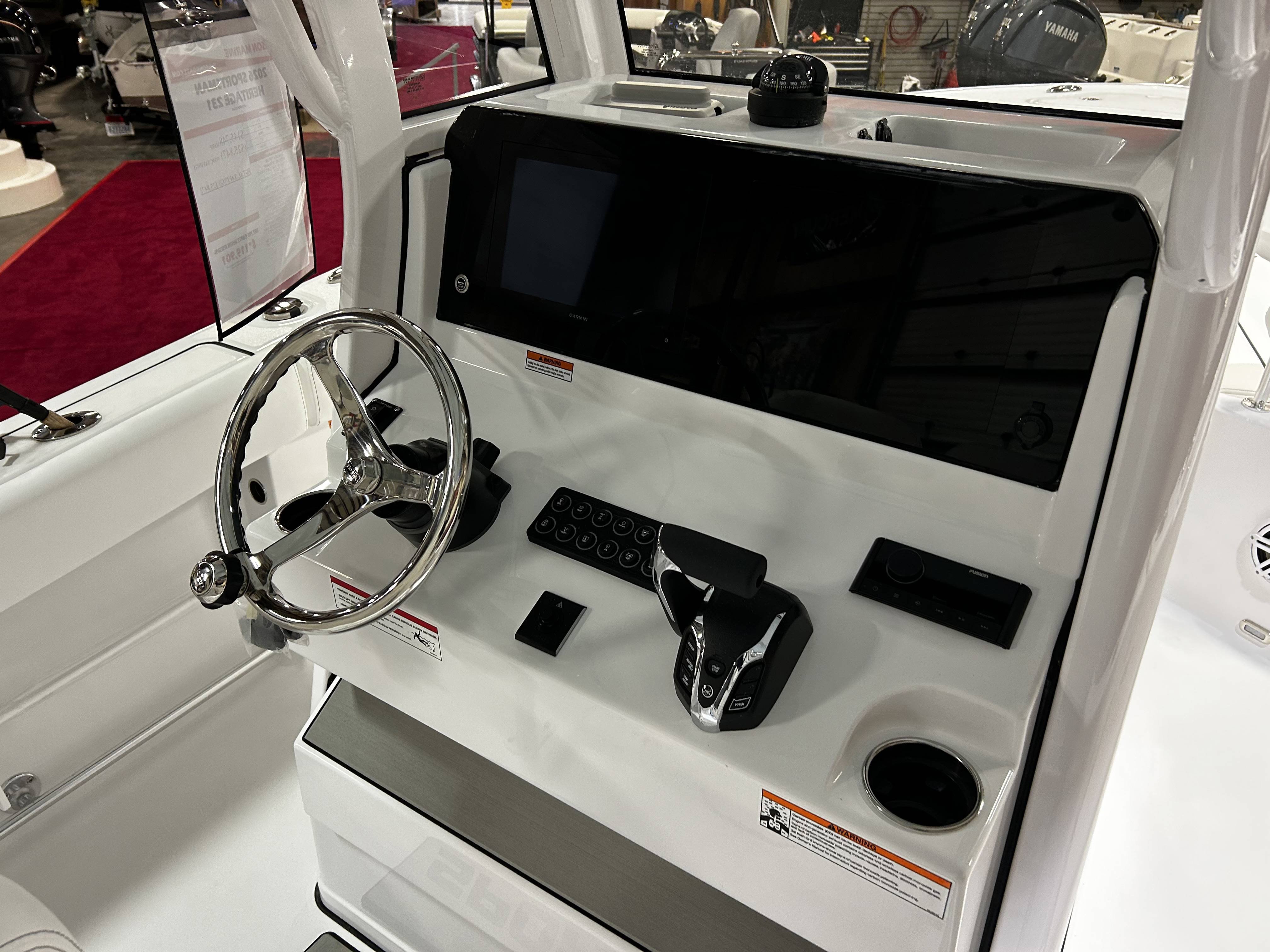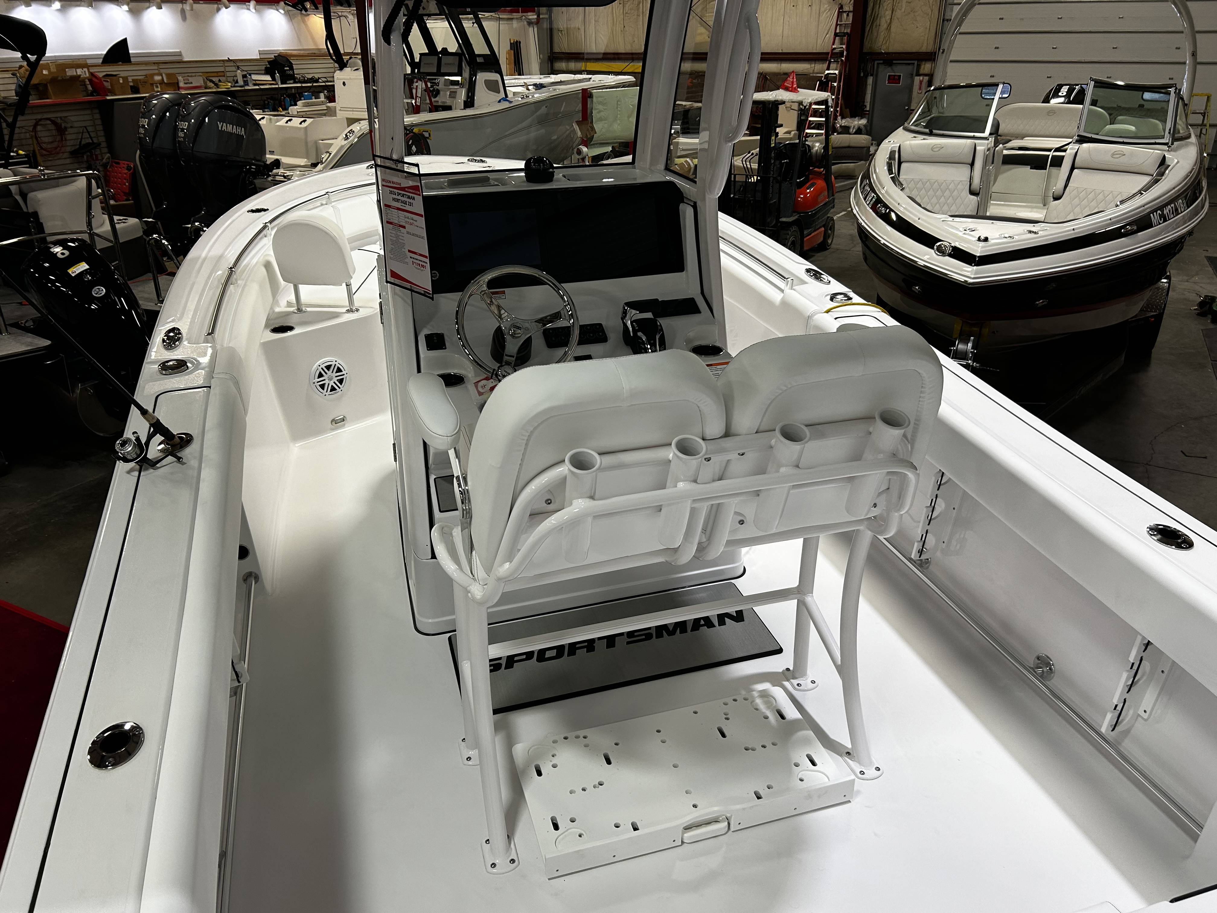 2026 Sportsman Heritage 231 powered by a Yamaha F250XSB2!Factory Installed Options:Exterior- hull sides & bottom ice blueInterior- serenity sileather icecap whiteFiberglass console with footrest and storageFiberglass hard top with LED lightingHardtop underside color ice blueWhite powder coatingPremium dual chair leaning post with flip up bolstersSlide out track for Yeti coolerGarmin 12" GOS screen with built in WIFIGarmin Apollo RA670 stereo with SporttunEdson 13SS comfort grip steering wheel with power knobPromariner Protournament Elite 3 battery charger- 2 bankTrolling motor plug, harness and adapterWindlass with anchor, roller and 300ft of lineVenture trailer included