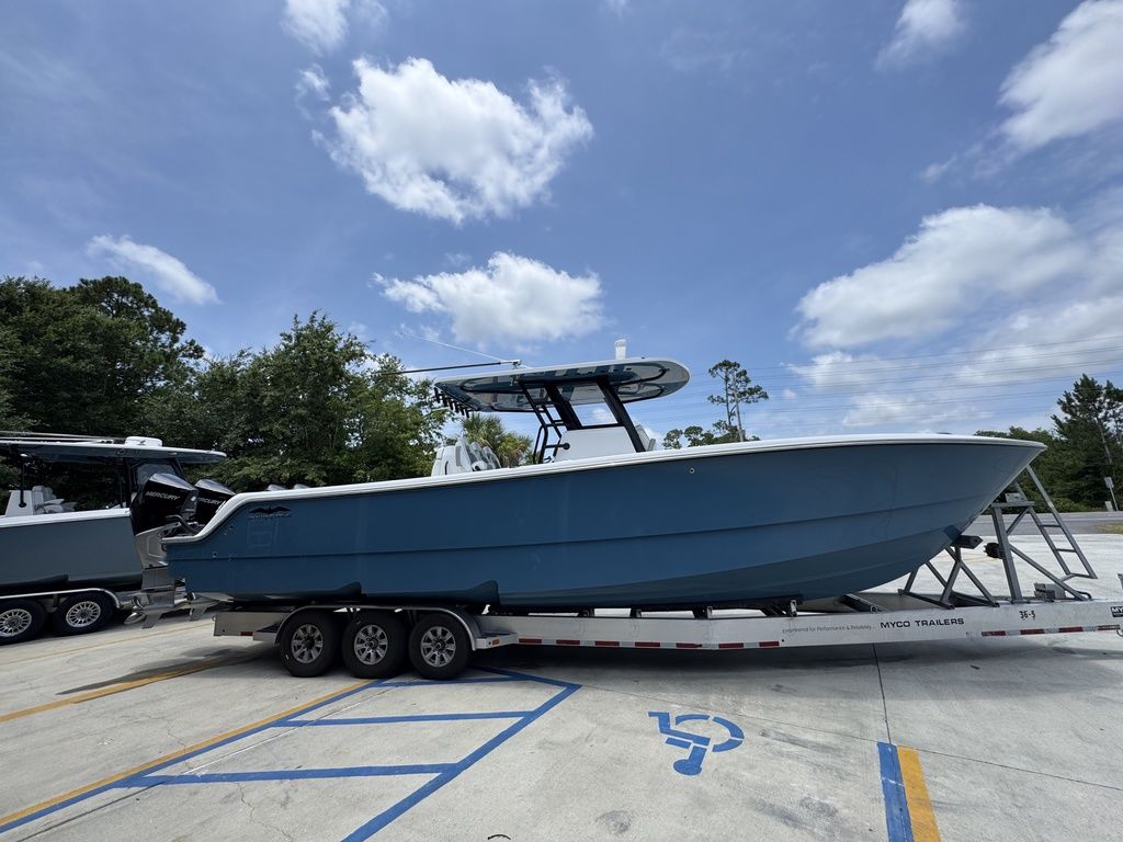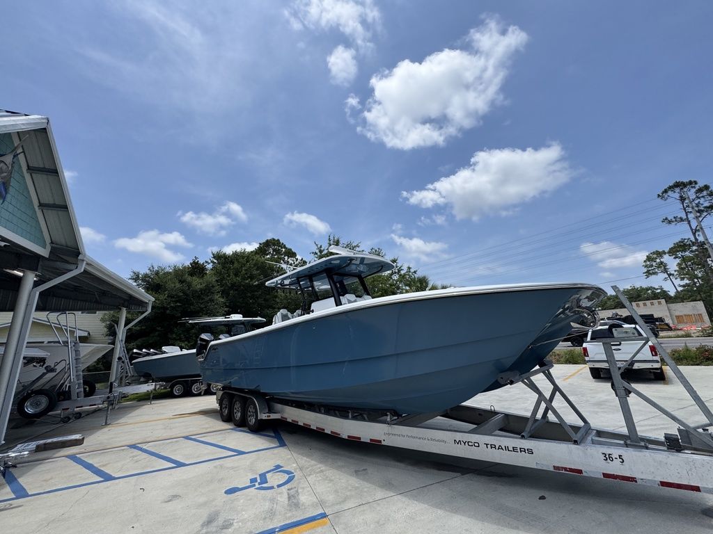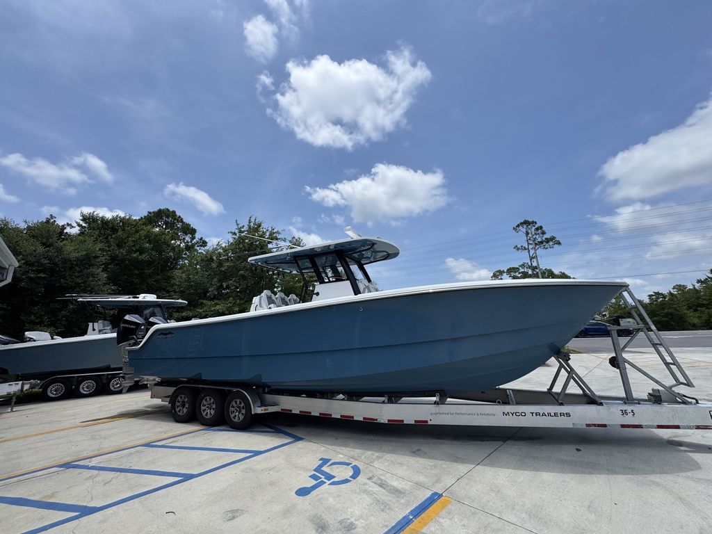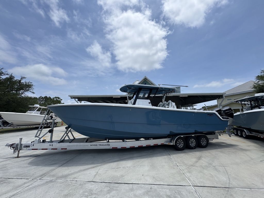 Introducing the latest member of the fleet: The 36' Cat. Purpose-built for serious offshore fishing, our latest center console represents a complete reimagining of what's possible in a premium fishing vessel. Its innovative hull design features a raised chine and aggressive style lines that actively deflect spray, ensuring a remarkably dry, soft ride in all sea conditions.