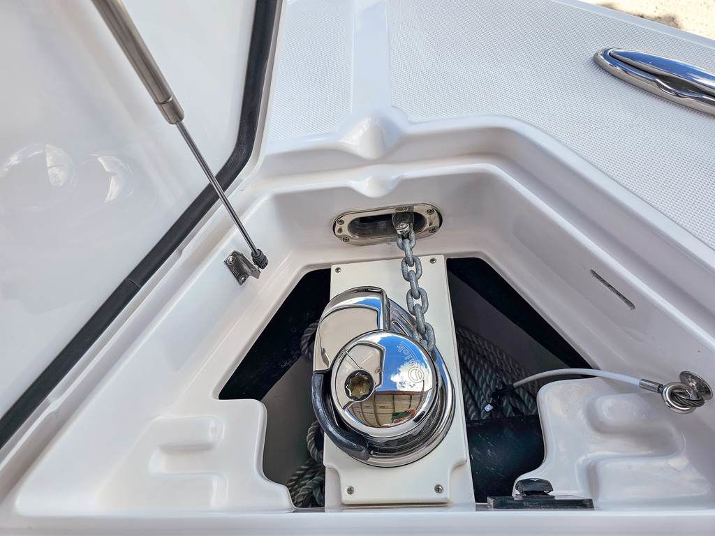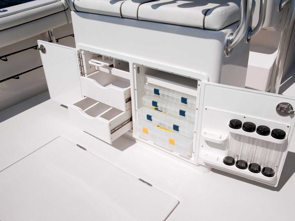 The thoughtful deck layout blends serious fishing capability with comfort and convenience for family and friends. A spacious cockpit offers plenty of room for casting and gear management, supported by integrated rod storage, a livewell, and strategic storage lockers to keep tackle and gear organized. Comfortable seating in the bow and helm areas ensures passengers enjoy the ride just as much as the captain, and the inclusion of premium upholstery and finishes elevates the onboard experience.