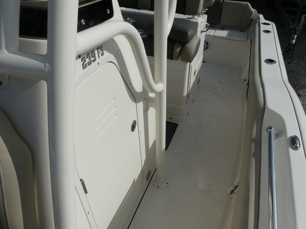 The 239FS is the answer to the question of whether a boat can fish hard on Saturday and then capture family fun on the water on Sunday.It provides plenty of roominess and fishing features to bring home the big catch while also providing the comfort features of a relaxing bow lounge and an aft bench seat that can easily accommodate five across.