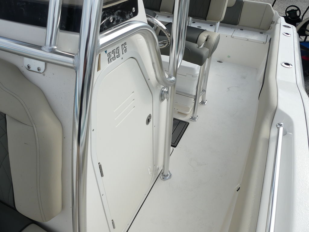 The 239FS is the answer to the question of whether a boat can fish hard on Saturday and then capture family fun on the water on Sunday.It provides plenty of roominess and fishing features to bring home the big catch while also providing the comfort features of a relaxing bow lounge and an aft bench seat that can easily accommodate five across.