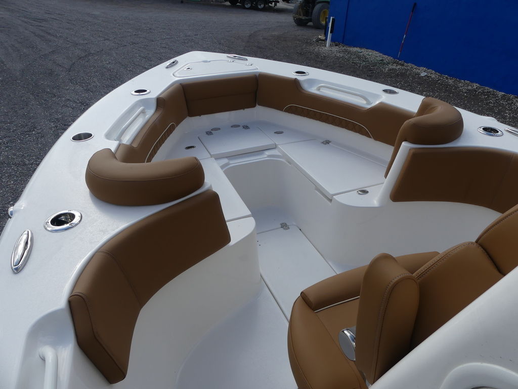 High-End Seating: Plush bow seating with removable backrests and a full-width integrated transom bench provide comfortable spots for the whole crew.