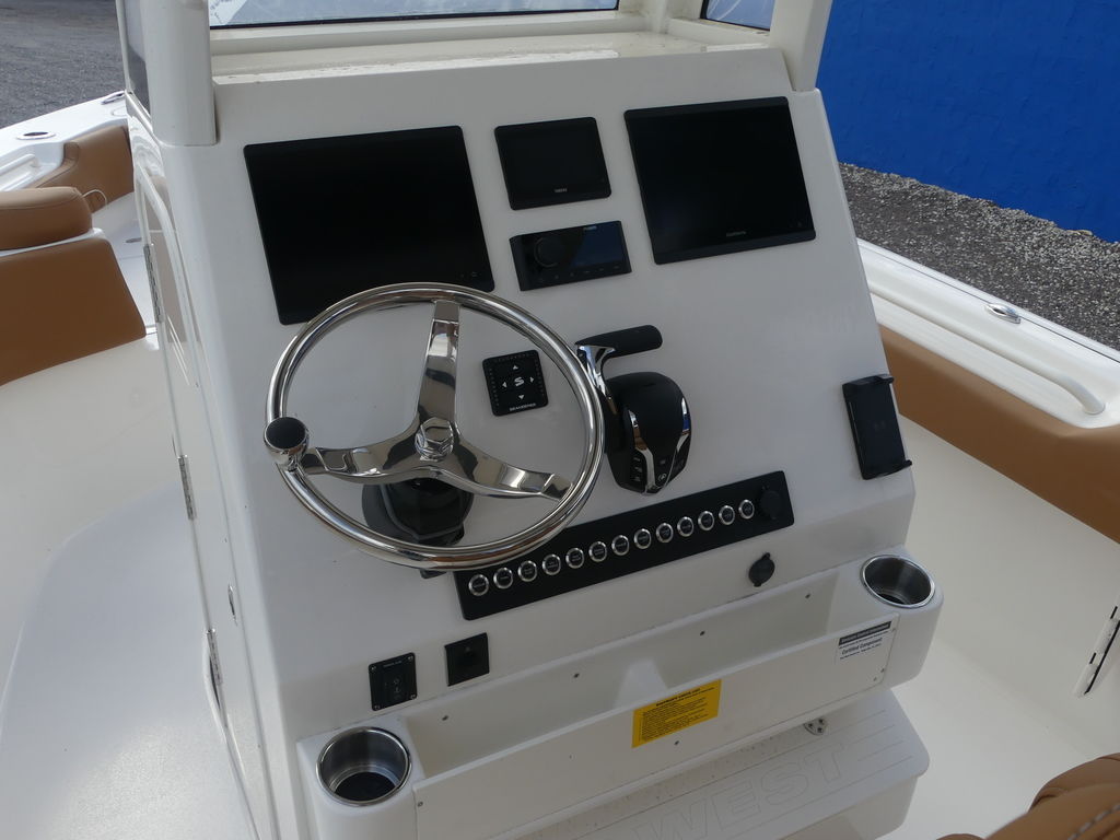 Modern Tech: The helm is centered around a massive Garmin touchscreen MFD with digital switching, wireless phone charging, and a premium Fusion audio system.