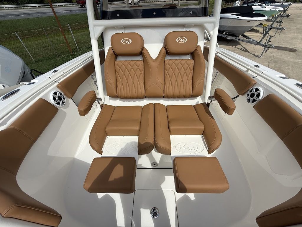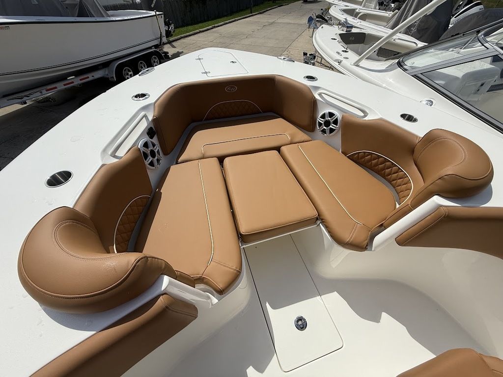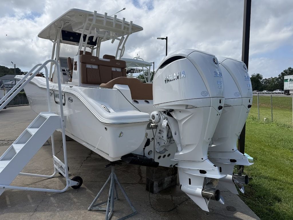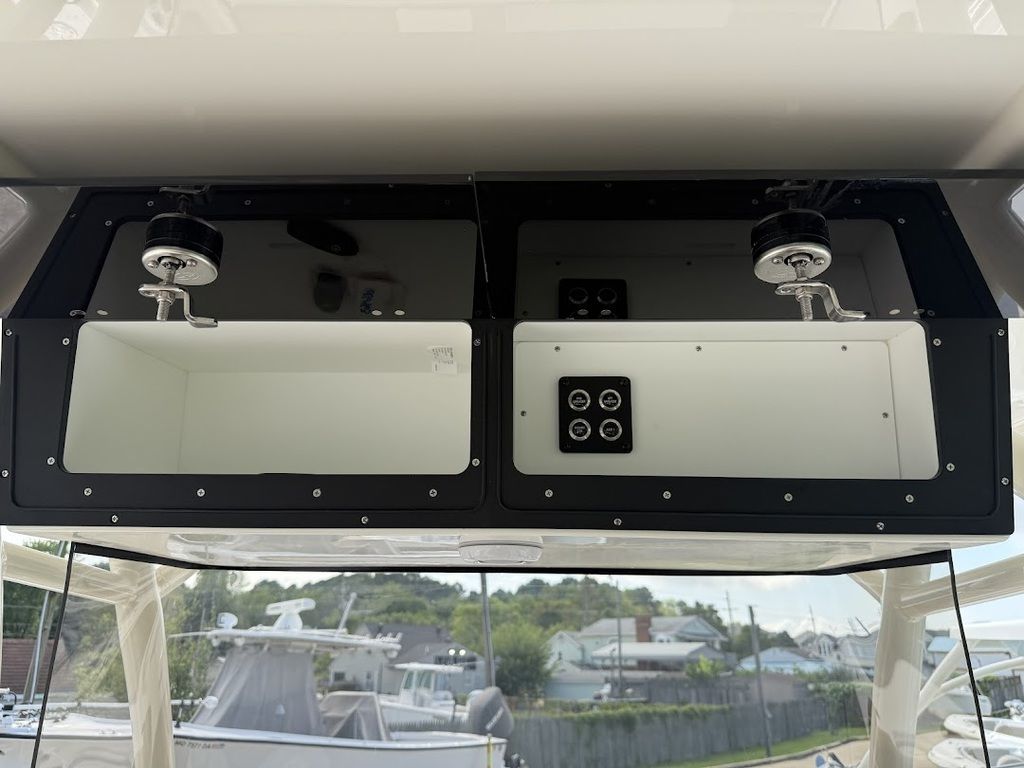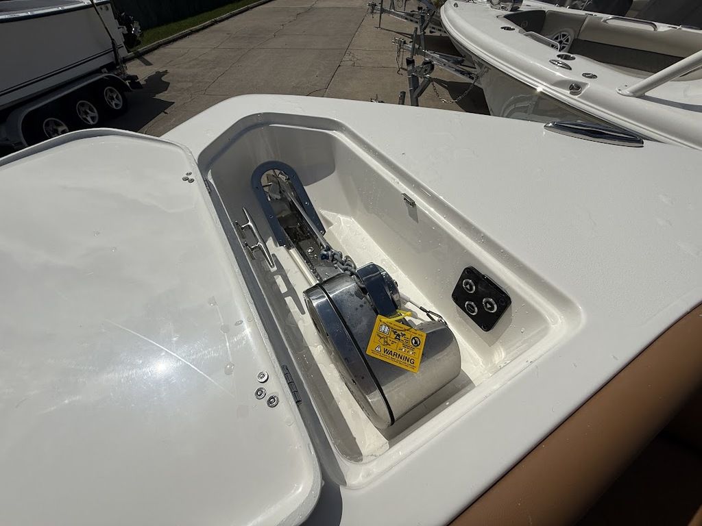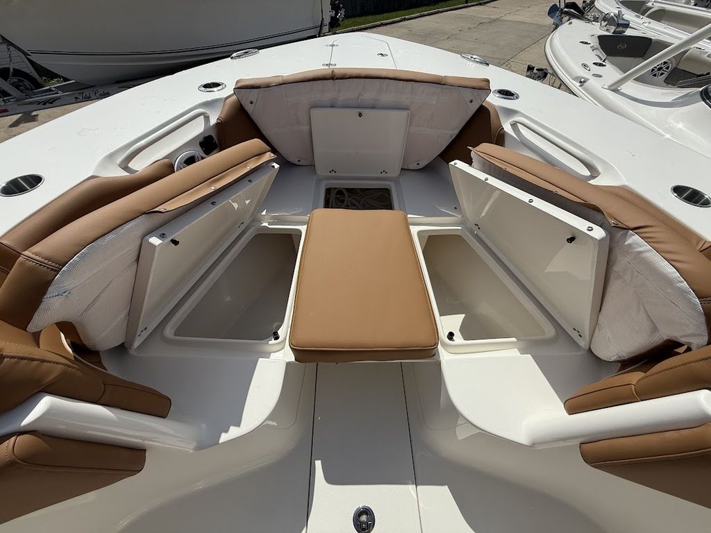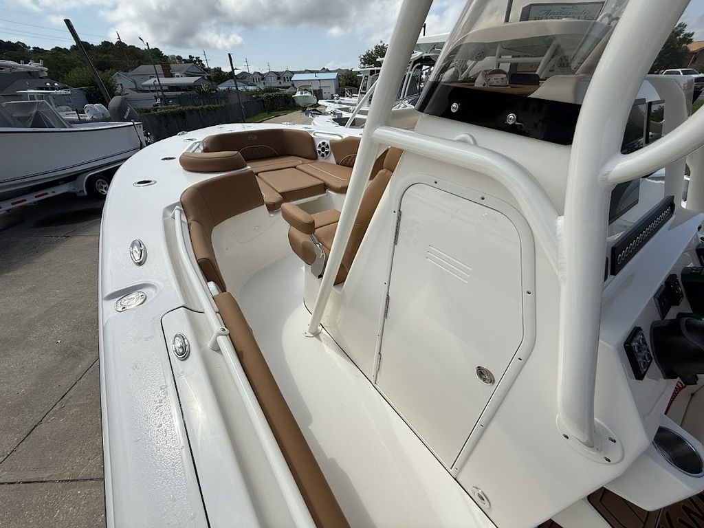 The 291FS represents the largest of our fleet of Family Sportsman Boats.The vessel comes standard with an underdeck windlass, fuel fills on both sides, and side entry doors on each side; one with a hidden ladder and one with a beach anchor. For creature comforts, it is outfitted with wraparound bow seating, slide-out lounge seats on the console front, a lined console interior with a freshwater sink, and a huge dash space for a custom instrument layout. For fishing, it offers dual live wells, large molded-in rod storage racks, plenty of rod holders, an under-deck macerated fish box, and even a Seakeeper option.