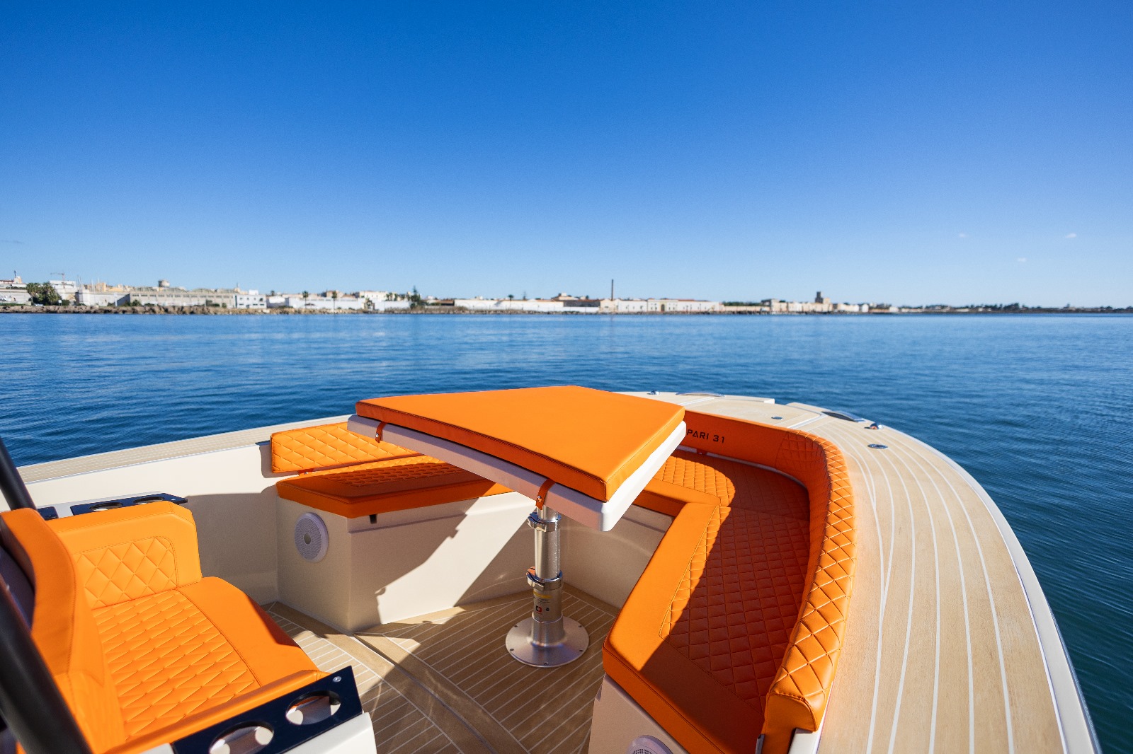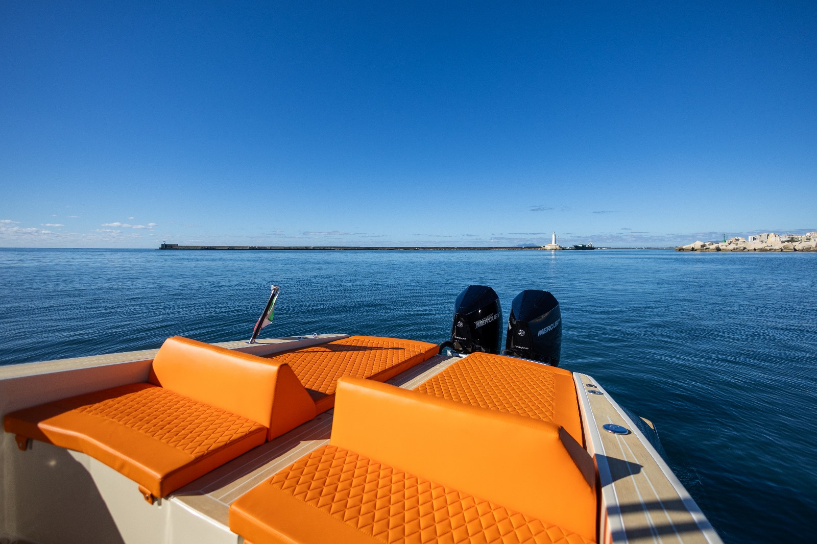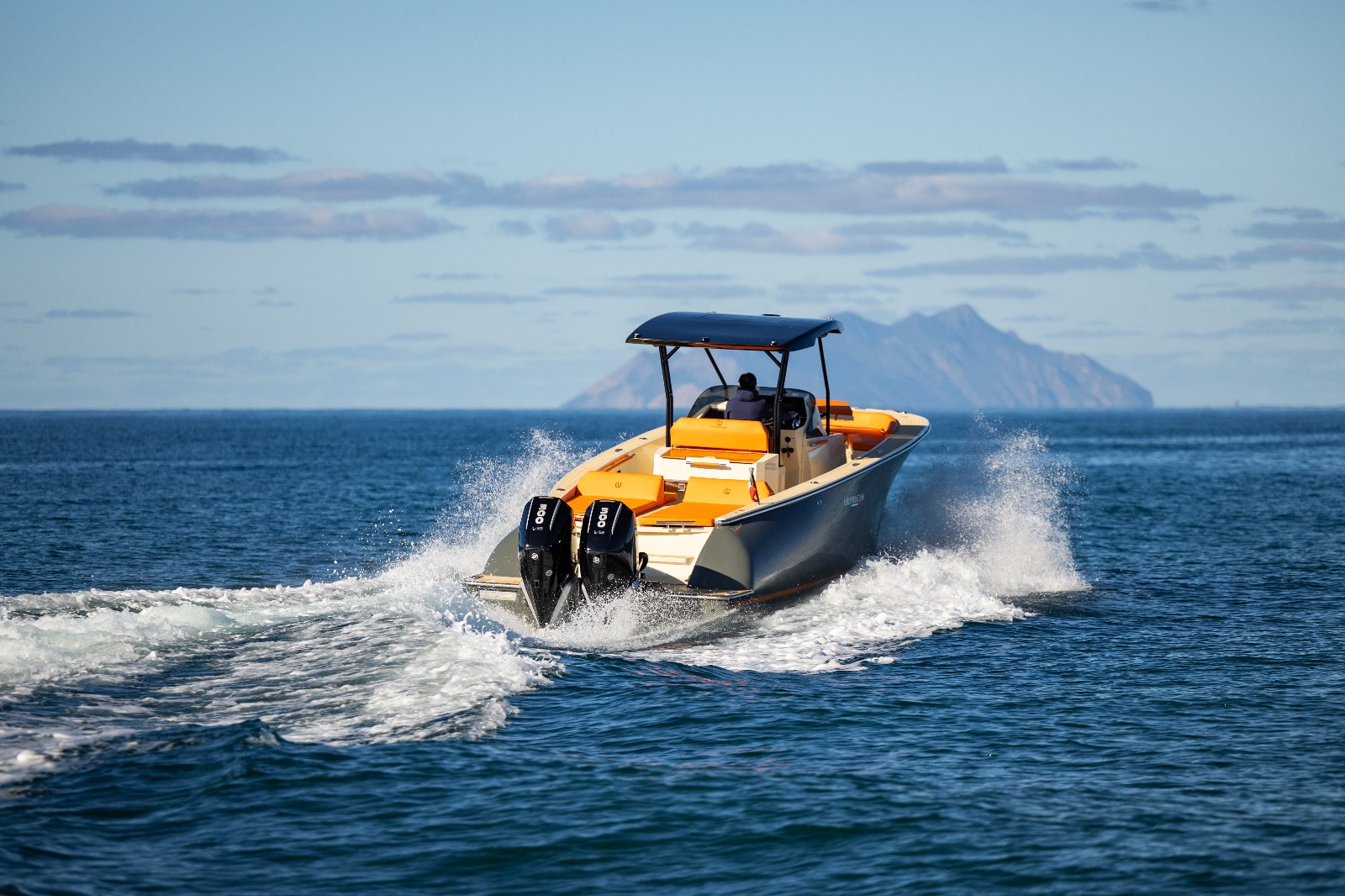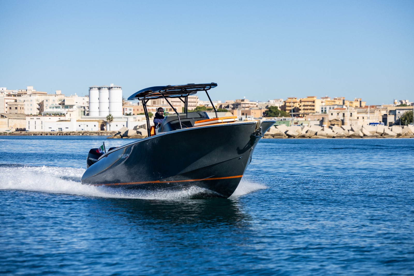 Meet the all-new Lipari 31! This Lilybaeum follows the same philosophy and elegant lines as the now famous Levanzo 25 but features extra space. For example, the Lipari 31 is characterized by a windward bow which allows the boat to sail completely dry, even with lots of wave action, and a stable underwater hull. This Lilybaeum can be equipped with engines of up to 700 hp and reaches a top speed of 51 milles. Standard features include an electric windlass, luxurious upholstery, Flexiteak on the gangways, an electric toilet under the console, a stern shower, etc.