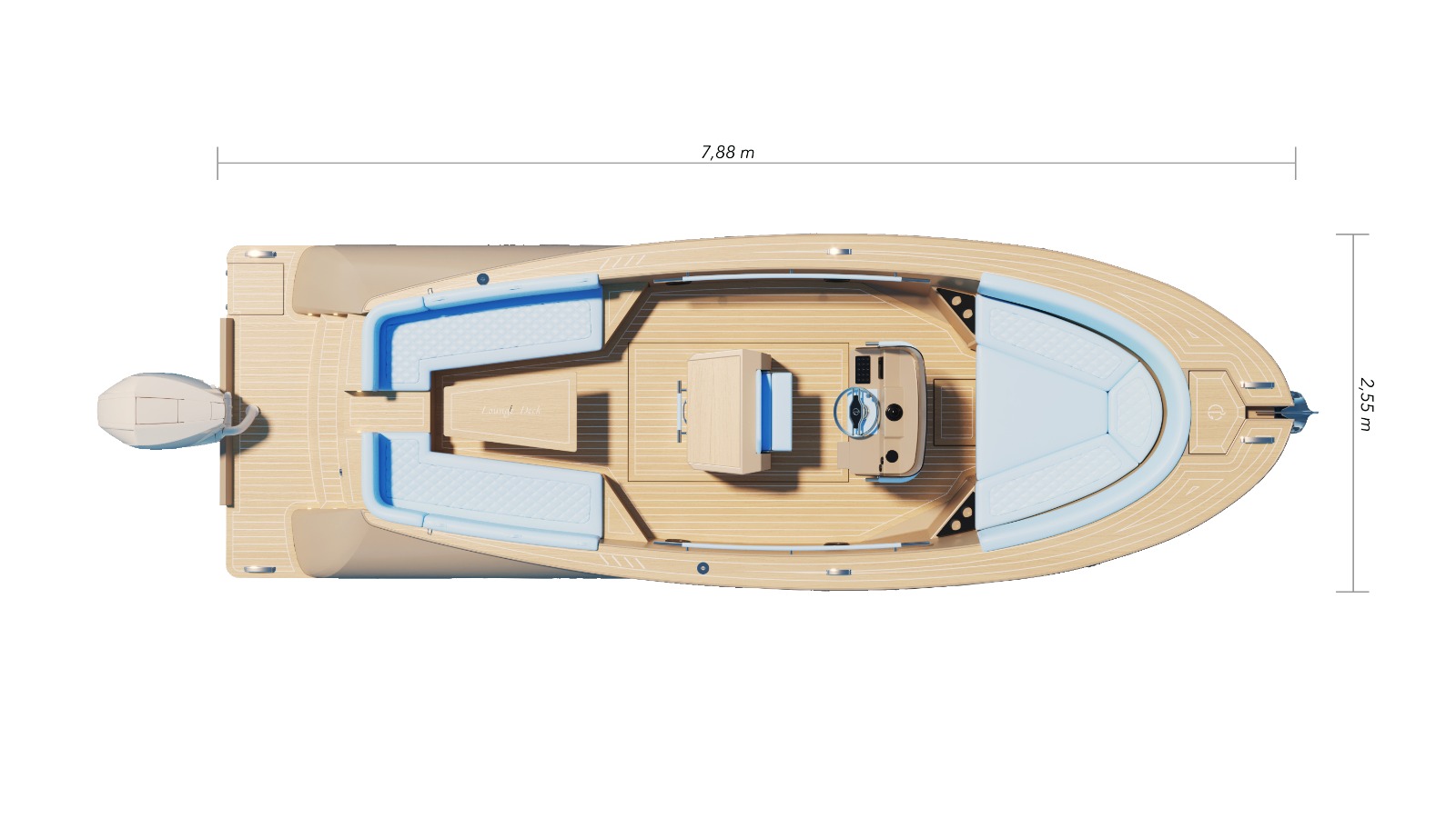 This luxury day boat has a deep v-hull that provides optimal stability and maneuverability, even on rough waters it feels very comfortable to sail. The design is compact and stylish, with great attention to detail. This is the ultimate boat for a day of sailing fun, where the also equipment can be called very complete. For example, the boat is equipped as standard with high-quality upholstery, flexiteak, recessed aluminum frogs, electric windlass, leather-finished stainless steel handles, a "wet bar", hydraulic steering, stern shower and very much storage space.