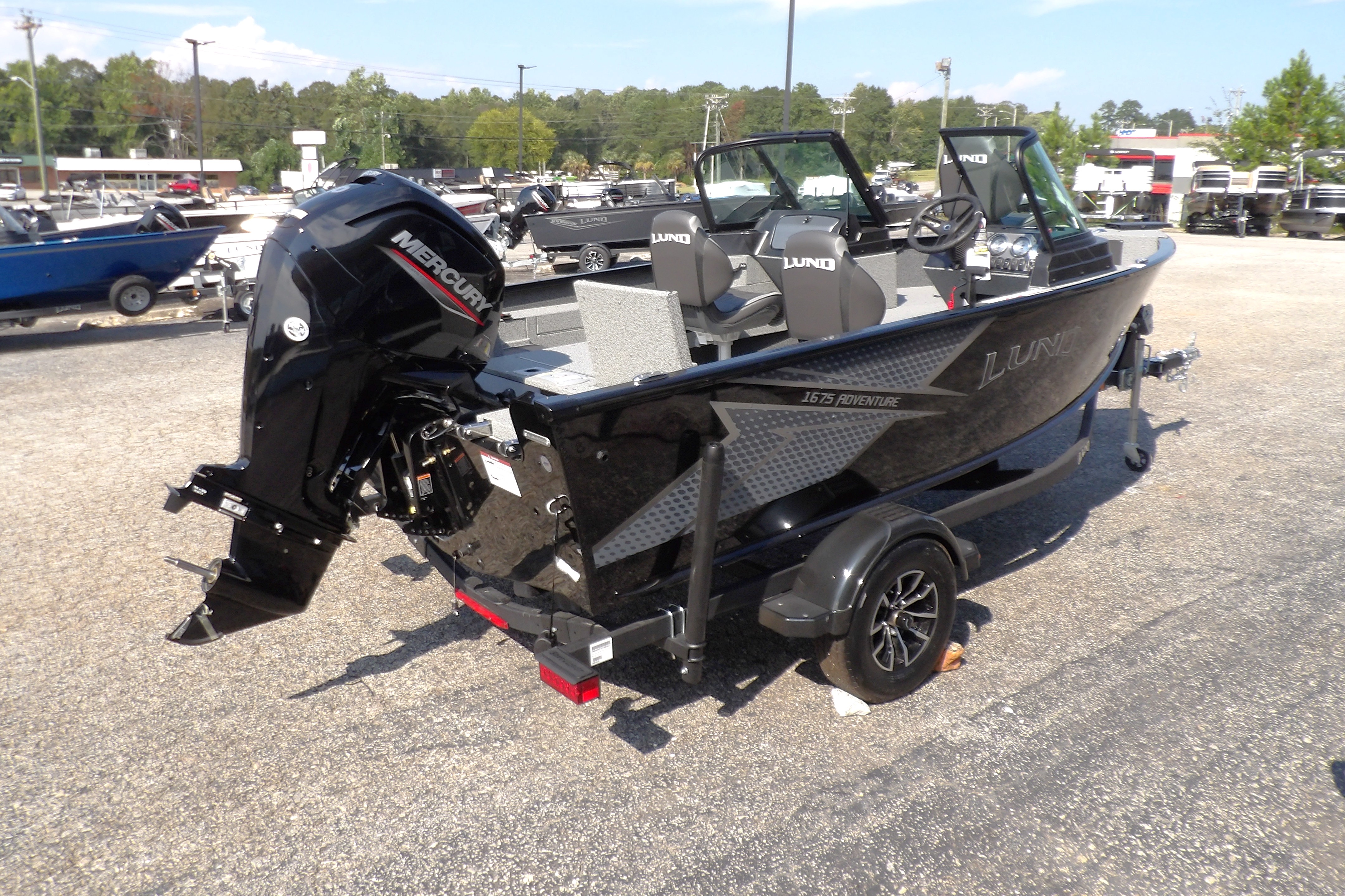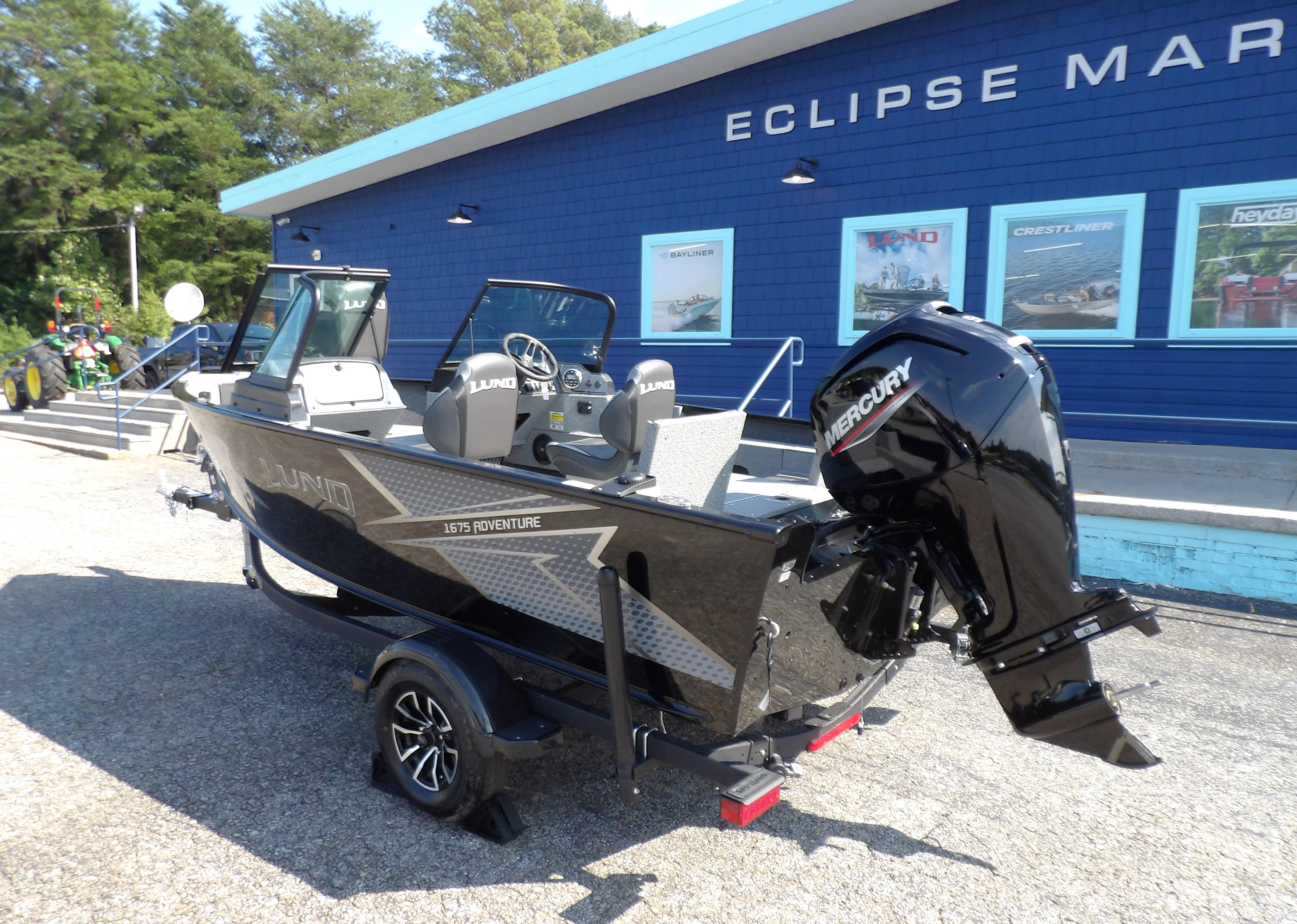 New 2026 Lund 1675 Adventure Sport in black comes with all the standard features of the Adventure series including: max power from a Mercury 90 HP Four Stroke outboard, graphics upgrade, the Advenure XLT package, on the go rod storage-port side, 3 bank Minn Kota onboard charger, Humminbird Helix 7, Minn Kota 24V Powerdrive with remote & 1 additional pro ride seat all sitting on a matching bunk trailer with guides. Perfect for family fishing and fun any time of the year. For more details, the latest in pricing and incentives give us a call at Eclipse Marine Seneca (864) 670-2270 or stop in and see us at 305 US Hwy 123 Seneca, SC. Length Overall: 202 in. (5100 mm)