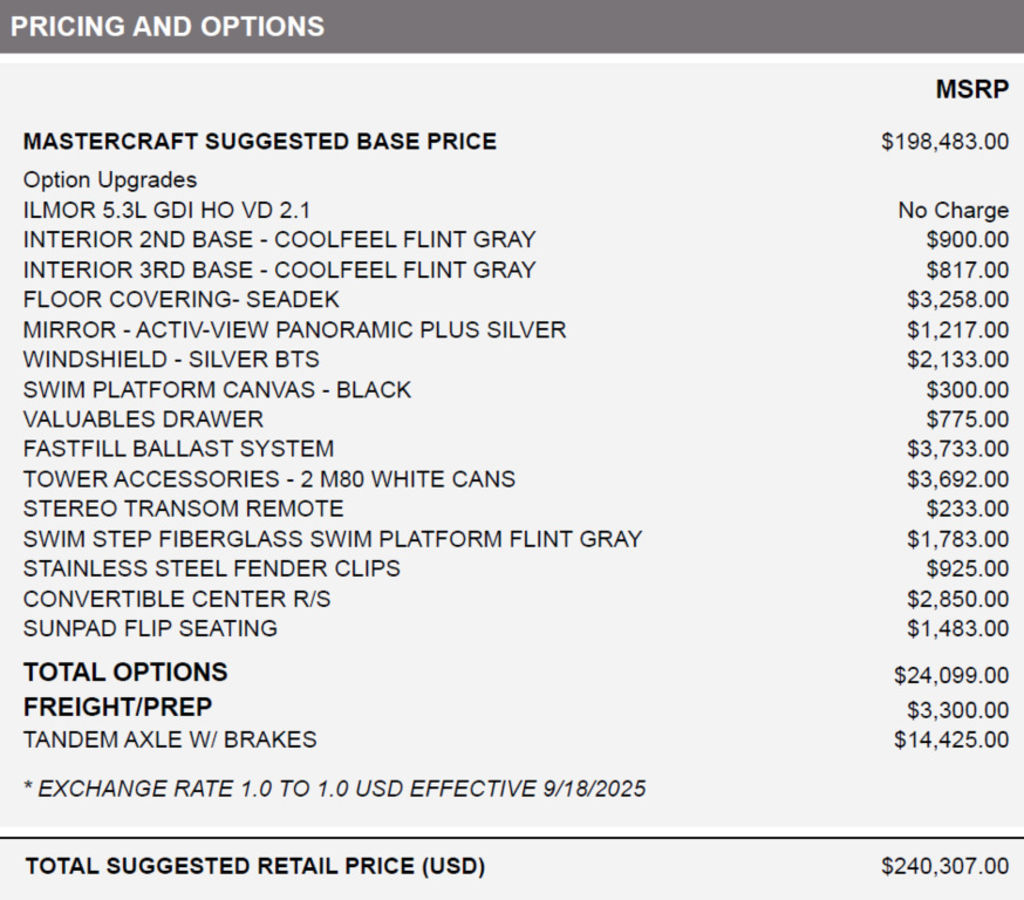 SeaDek Floor Covering-Cockpit, Activ-View Panoramic Ski Mirror, Fiberglass Swim Platform w/Flip-Down Swim Step, Swim Platform Canvas, (2) M80 Tower Speakers, Convertible Rear Seat, Coolfeel Interior, BTS Windshield, Fastfill Ballast System, Transom Stereo Remote, Stainless Fender Clips, Sunpad Flip Seating and Tandem Trailer w/Disc Brakes.