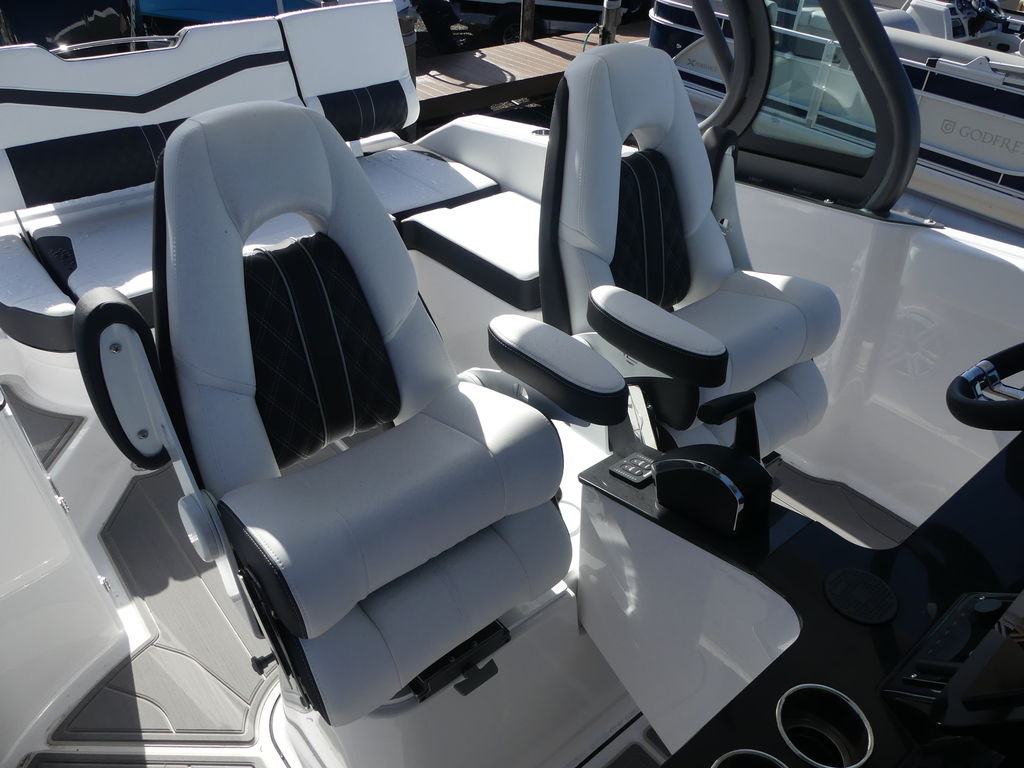 - Port & Starboard Helm Seats, w/Swivel Base, Slider & Flip-Up Thigh Rise, Fold Down Armrest