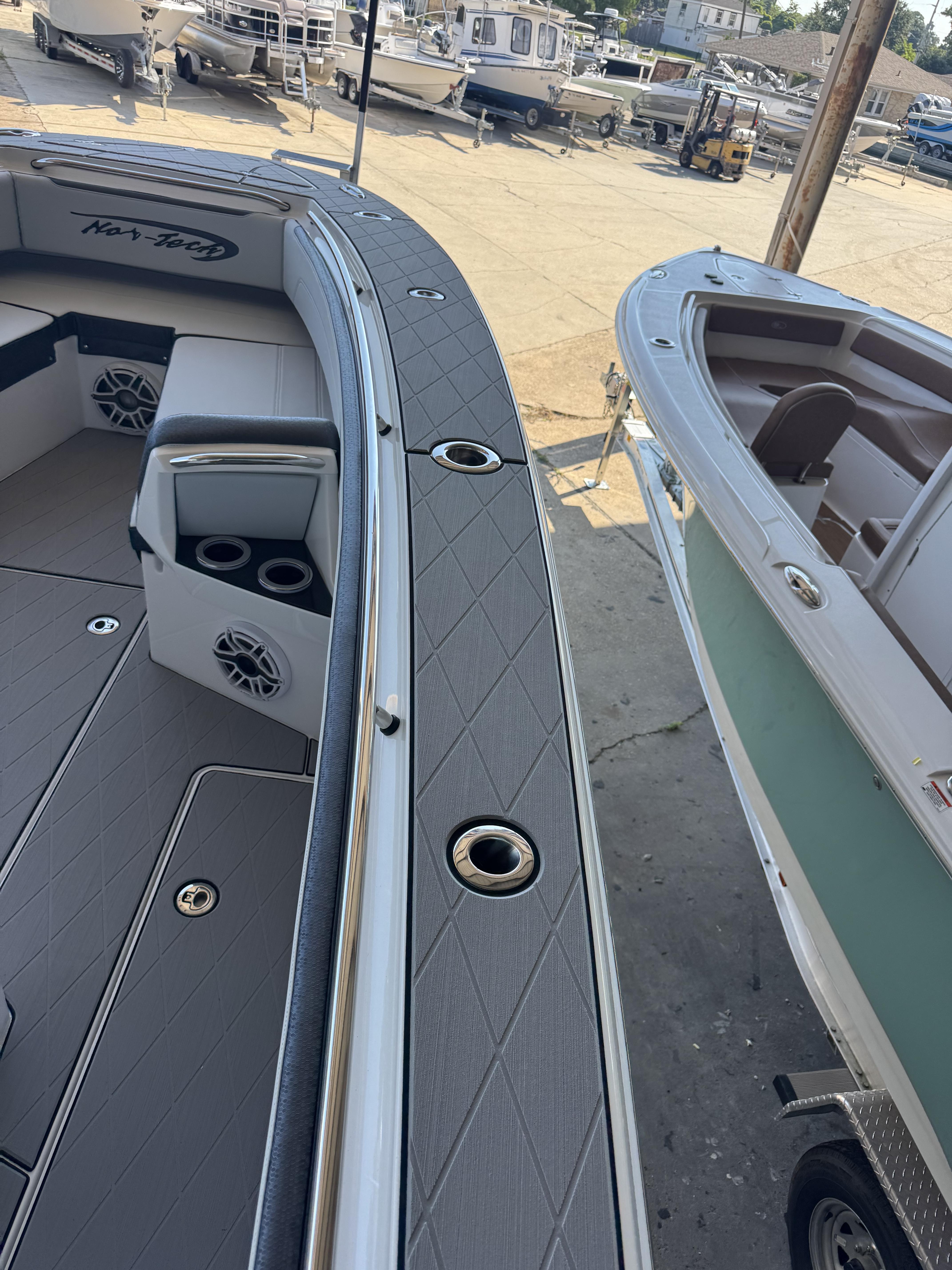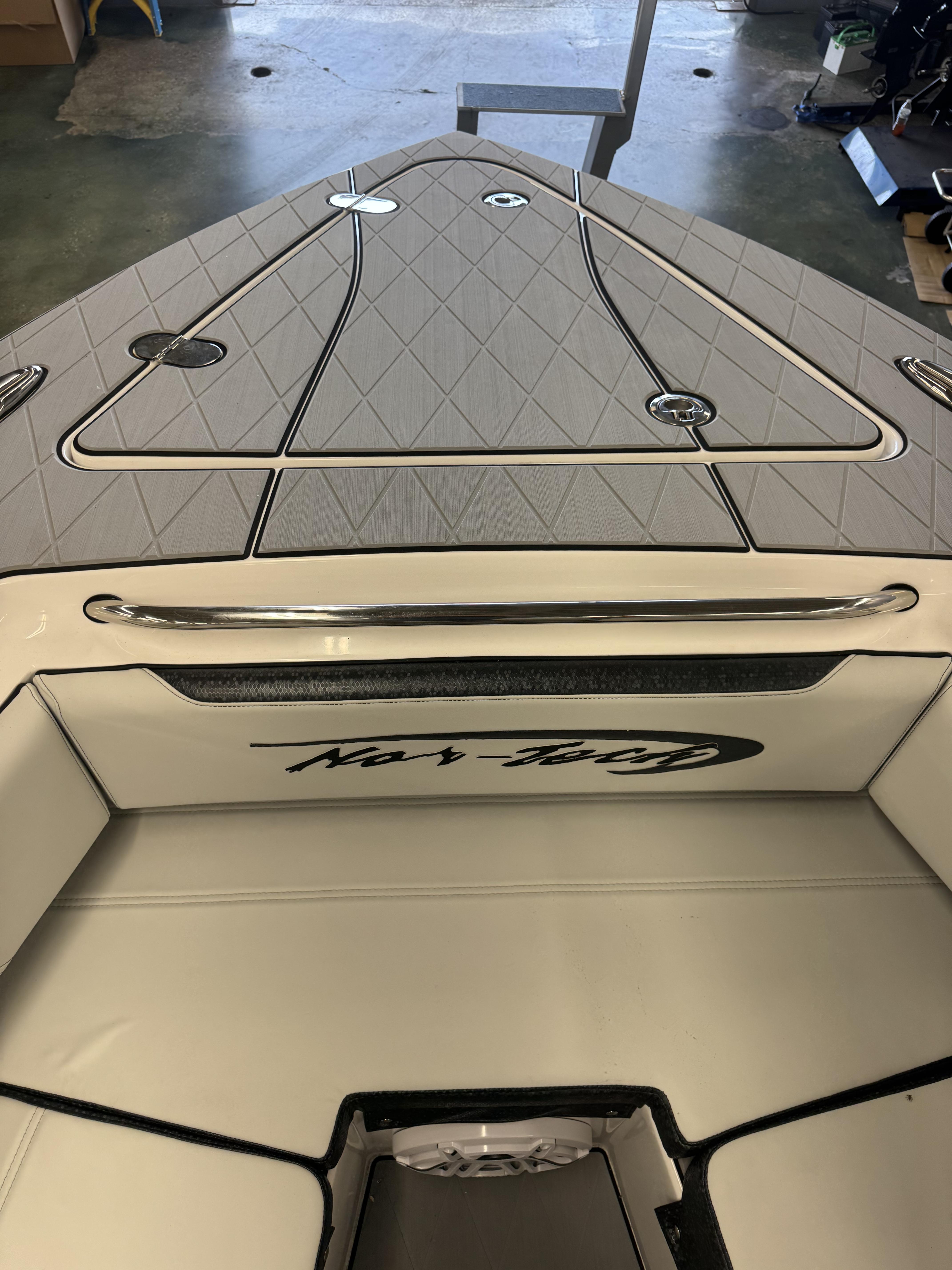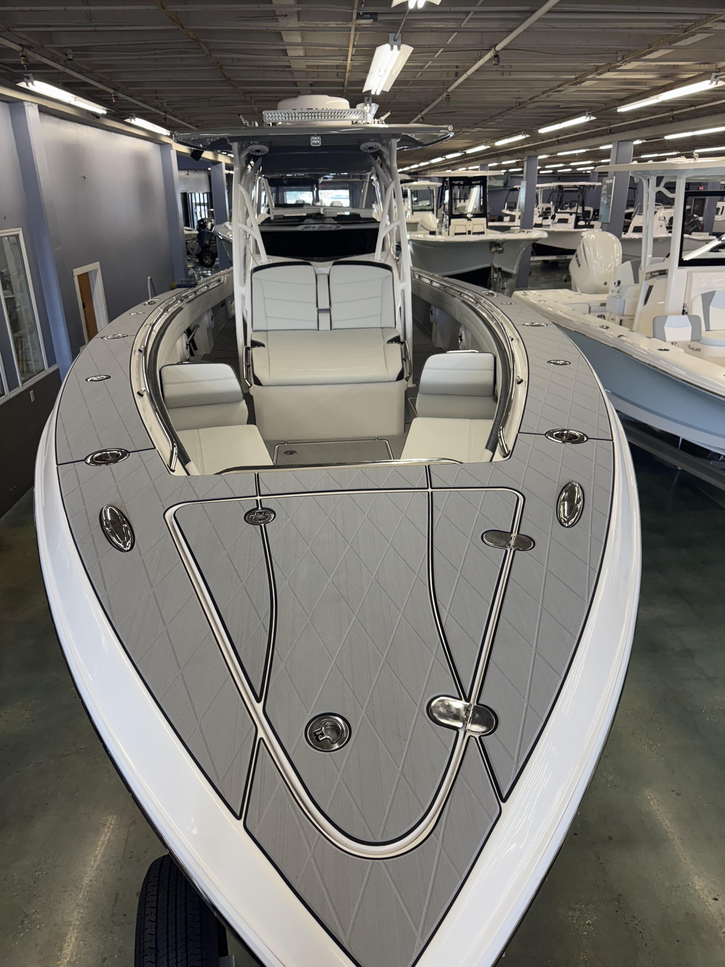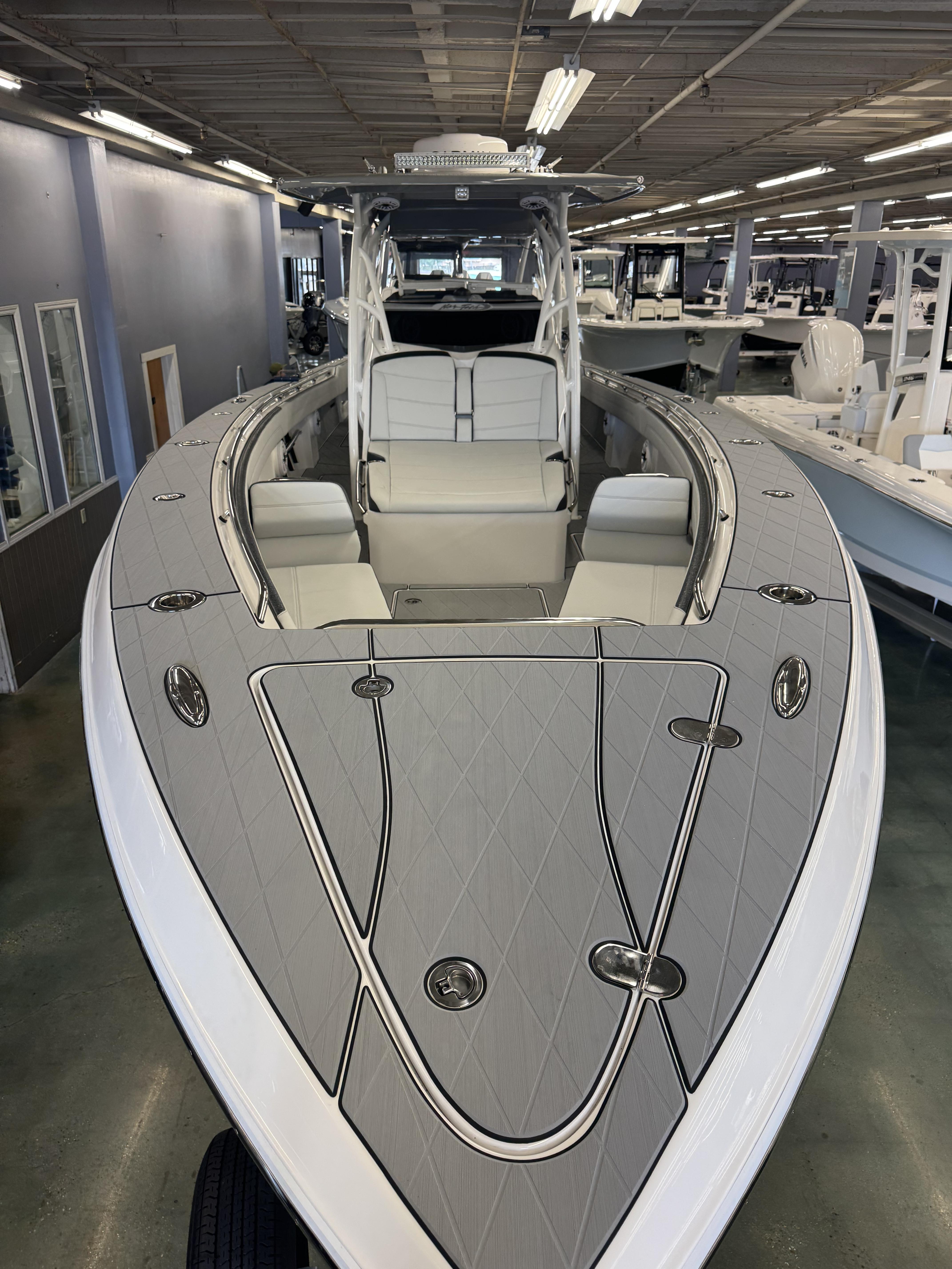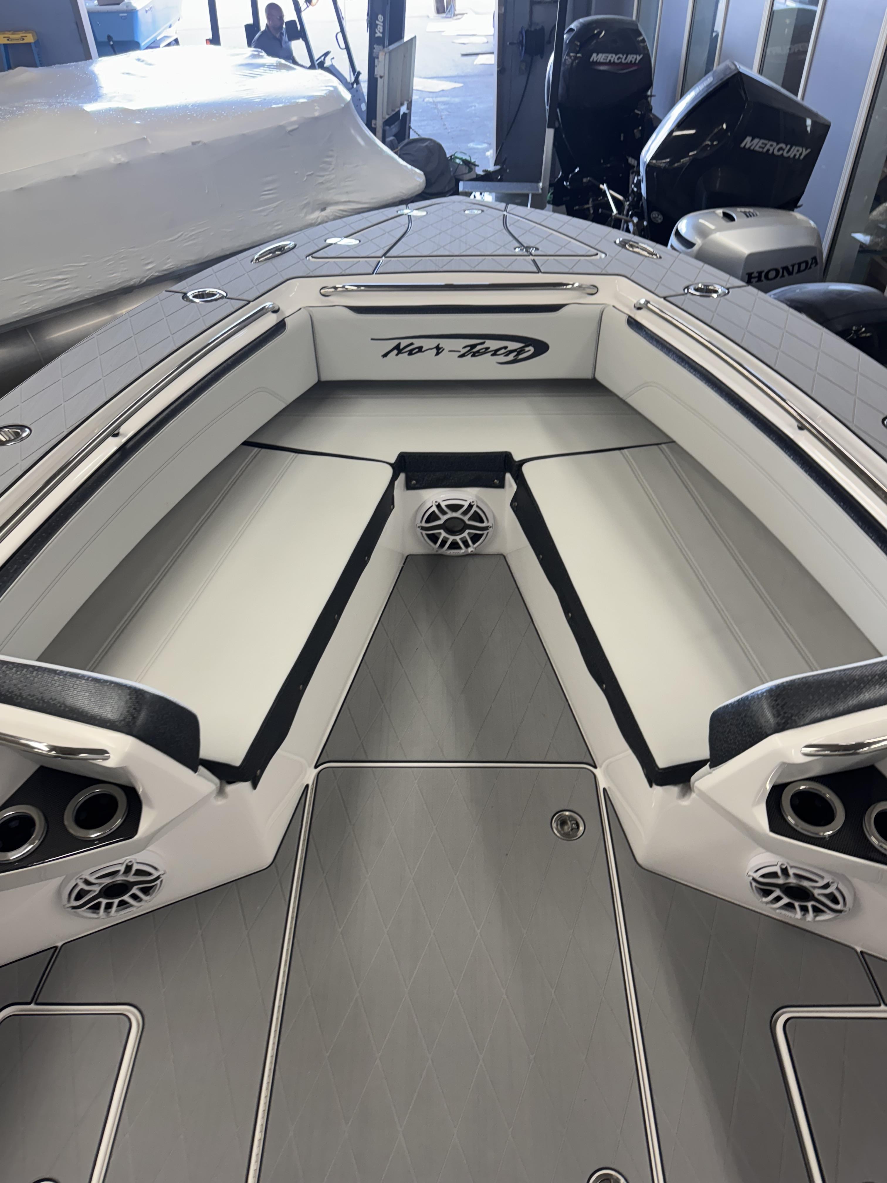 This is the brand new boat we have all been waiting for. It is the perfect combination of a comfortable sport boat with plenty seating for all of your crew and the 392 Nortech which is a super stable, smooth and dry, tough as nails Carbon Fiber and Kevlar reinforced hull that has 5 stringers, and 535 gallon of fuel capacity. The liner that is completely bonded all the way up both hullsides and across the top of all 5 stringers gives you peace of mind when the weather kicks up. It also has a huge fish box and under deck storage compartments. Whether you are tournament or recreational fishing, diving, hanging out on a beach, or running Poker Runs, this one is specially built for it all. To keep it all in Nor-Tech fashion we started with selecting Four 400R V-10 Mercury Engines in Cold Fusion White with Shadow controls and fresh water engine flush. Af the dash there are twin 22” Garmin multifunction glass screen displays flush mounted in the carbon fiber dash panel, XM Weather, sounder with dual chirp transducers, autopilot and GMR XHD Radar. There are 2 VHF Radios and a Sound system that surrounds you with JL Audio Speakers with the cleanest highs and the deepest lows. Here is the rest of the list that sums up the build. -Lumishore SMX 154 LED RGB Underwater lights -Second Row Helmseat-Molded Bow seating with Forward facing backrests-Upholstered Dash Panel with net-Cabin AIr Condition with Dash Vents-Cockpit Coaming pads-8 Group 31 AGM Batteries-2 Battery Chargers-Joystick Bow Thruster Control-Tackle Center Helmseat with Salt and Fresh water Sink-Frigid Rigid Cooler on Slides-Rod holder Cup Holders-Gunnel Rod Holders-Transom Rod Holders (13) With tilted center trolling rod-Extra Large Hard Top with Rod Holders and welded rear legs-Marine White Powder Coat-Hard Top Upper Storage Box-Gemlux Outrigger Bases with Carbon Fiber Telescopic Poles-Windlass, Anchor, Chain and Rope-Electric Head with tank and overboard Discharge-Side Dive Door with Ladder-Light Blue Gelcoat in Livewells andFishboxes-30” LED Light Bar-4 Electric Reel or Downrigger Outlets-Storm Grey Sea Deck with Ghosted Diamonds on -Light Grey Hull Sides and Bottom-2 Washdown pumps with 4 Hose Spigots-Fresh Water system with 2 Spigots and Fresh Water Shower-Forward and Rear Spreader Lights-Lighted Storage Boxes-Port side Steering Wheel for driver mobility-Tilt Steering Helm