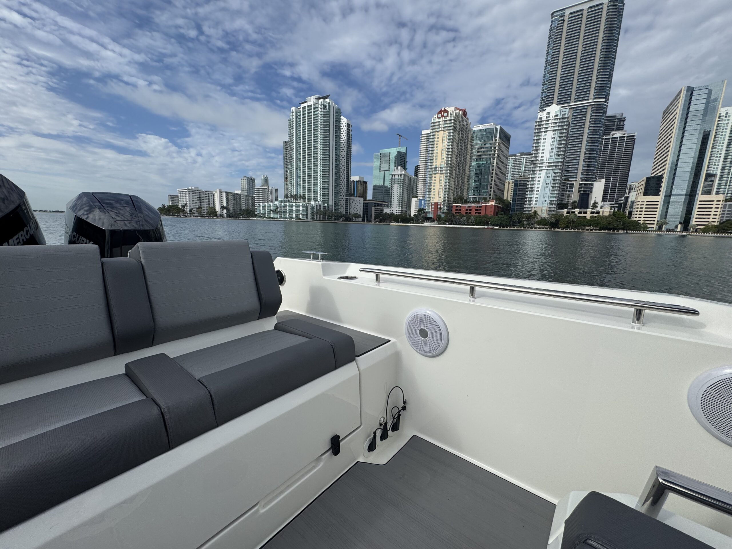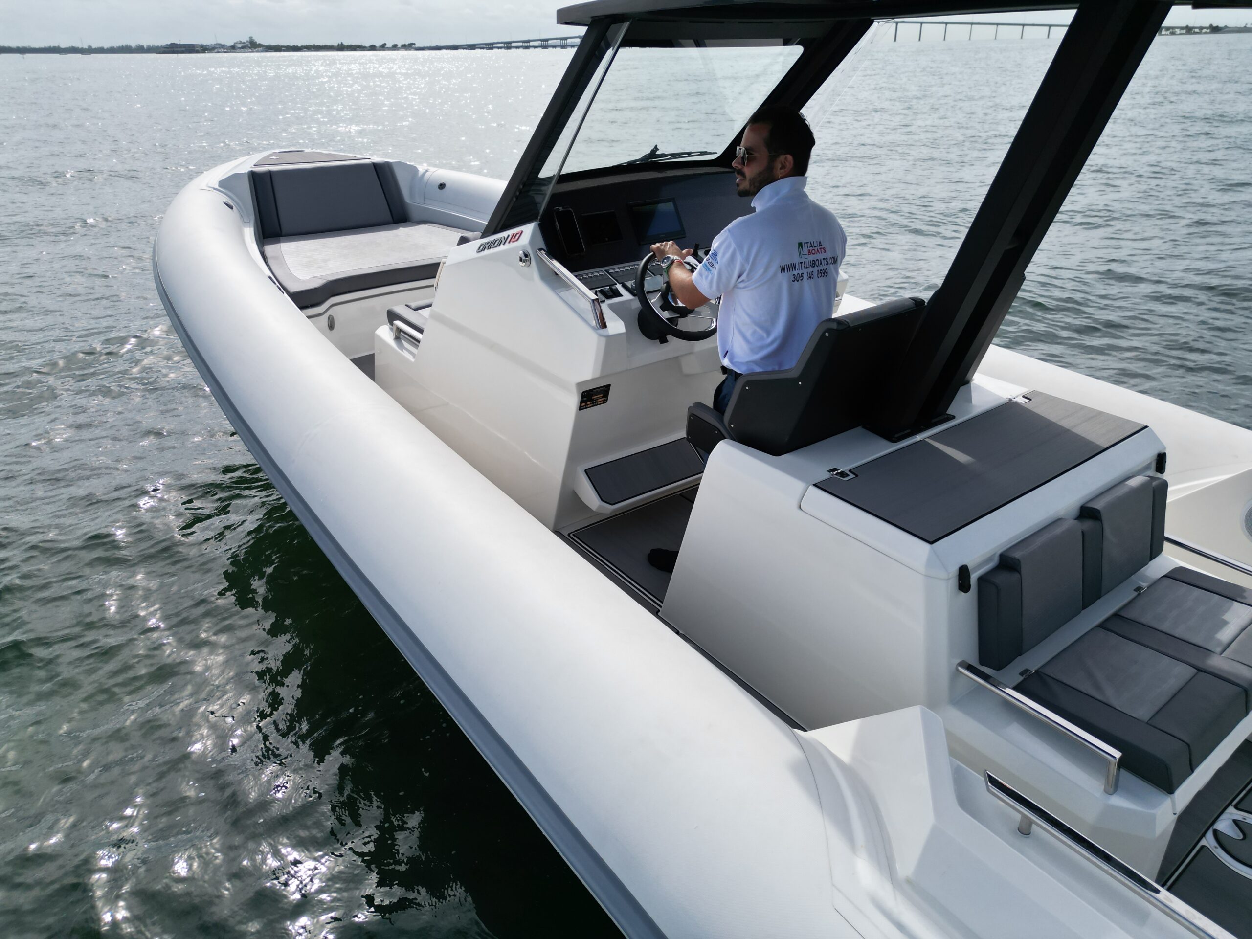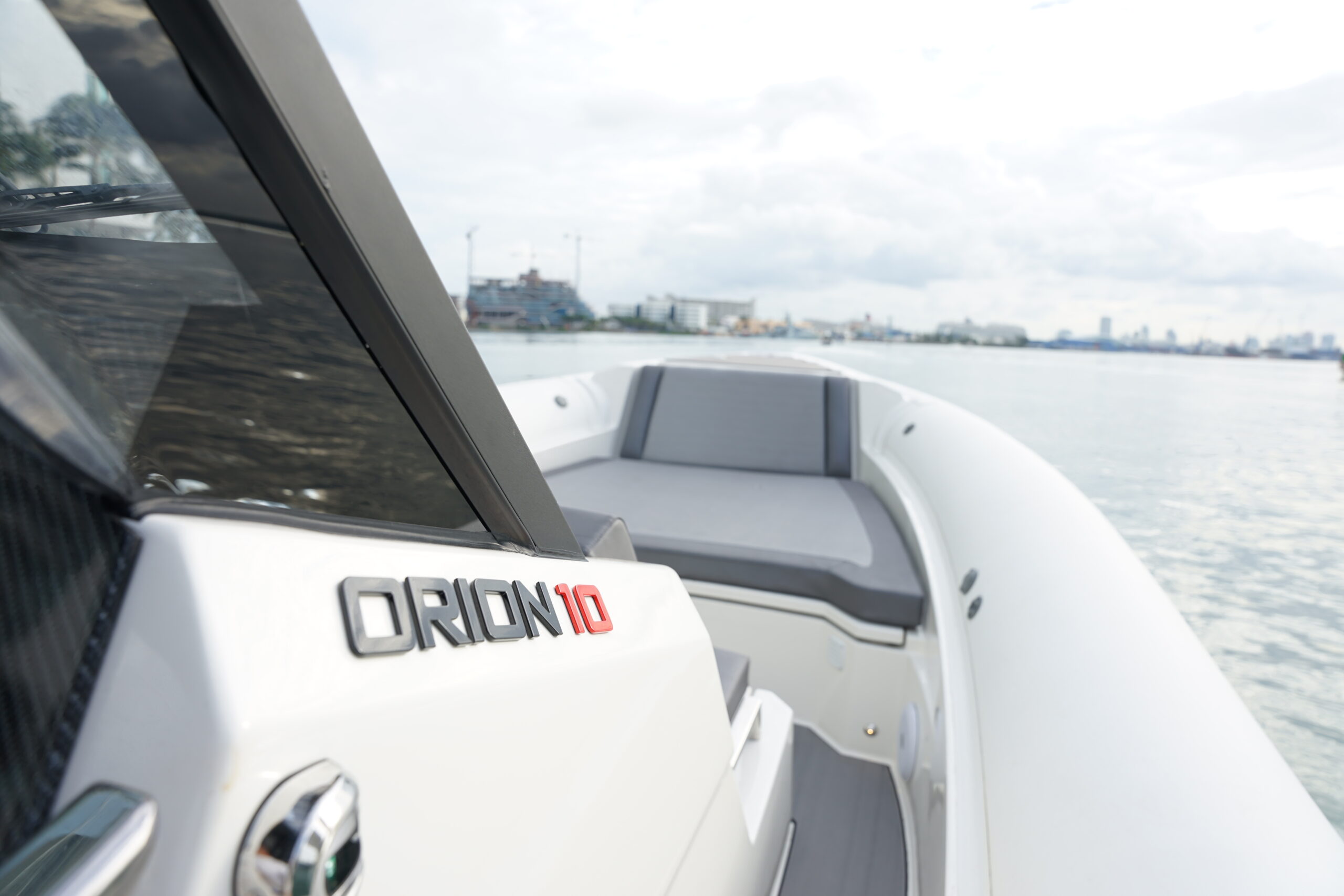Loaded with impressive standard features, the Orion 10 includes Silvertex marine upholstery, large storage compartments, acrylic glove box with USB charging socket , twin flip-up seats, Hypalon tubes, hydraulic steering system, electrical plant with navigation lights and basic lighting, foldable table and fridge, automatic bilge pumps, tempered glass windshield, swim platform, stainless steel swim ladder, telescopic cleats and stainless steel console and aft seat grab handles, bow thruster, electric head