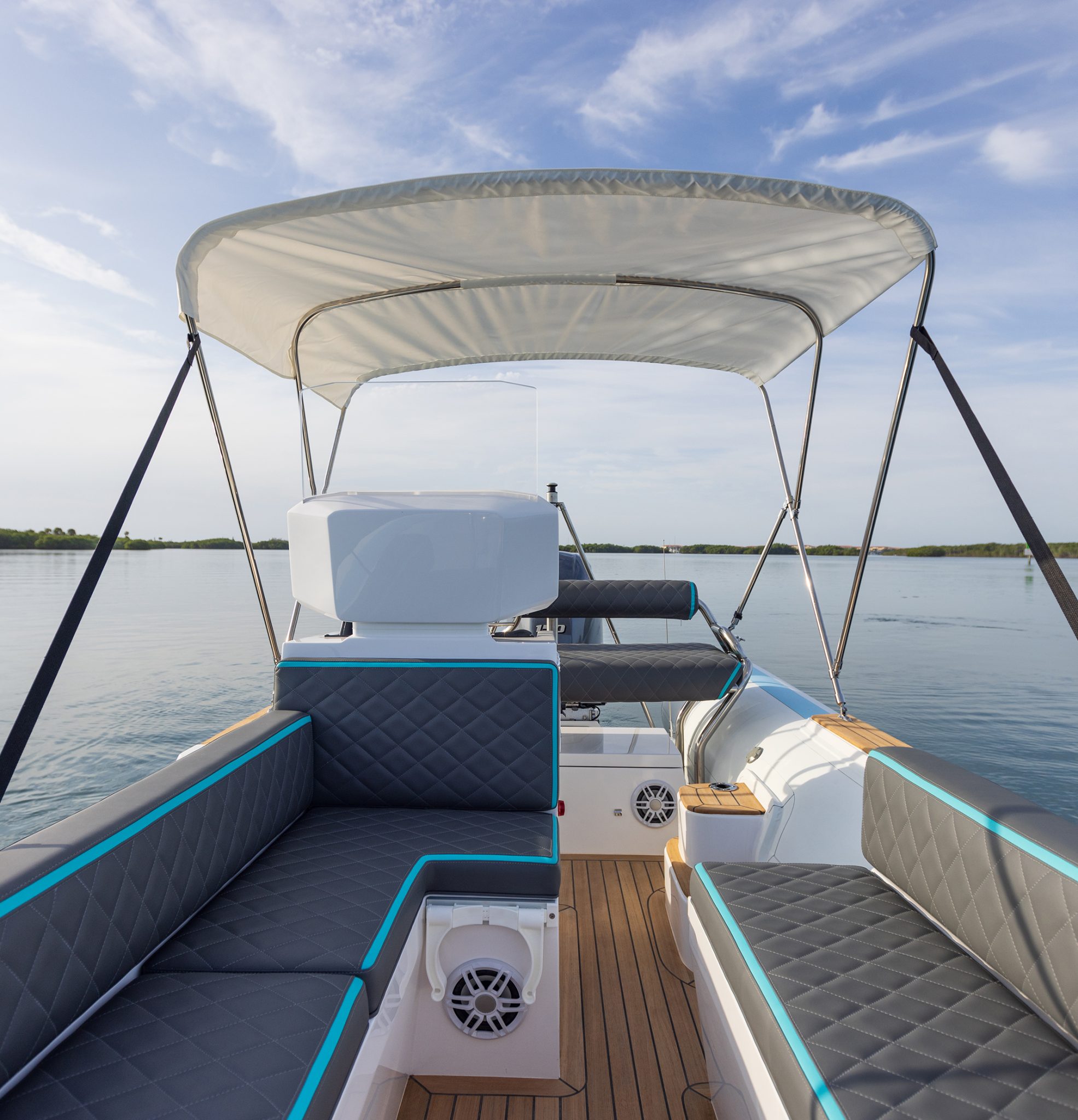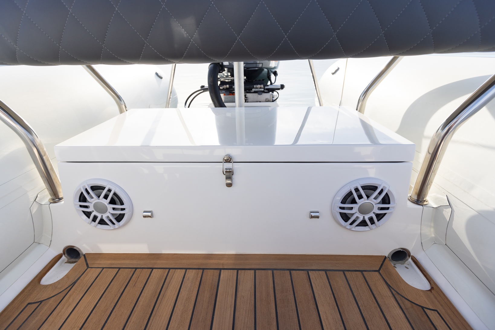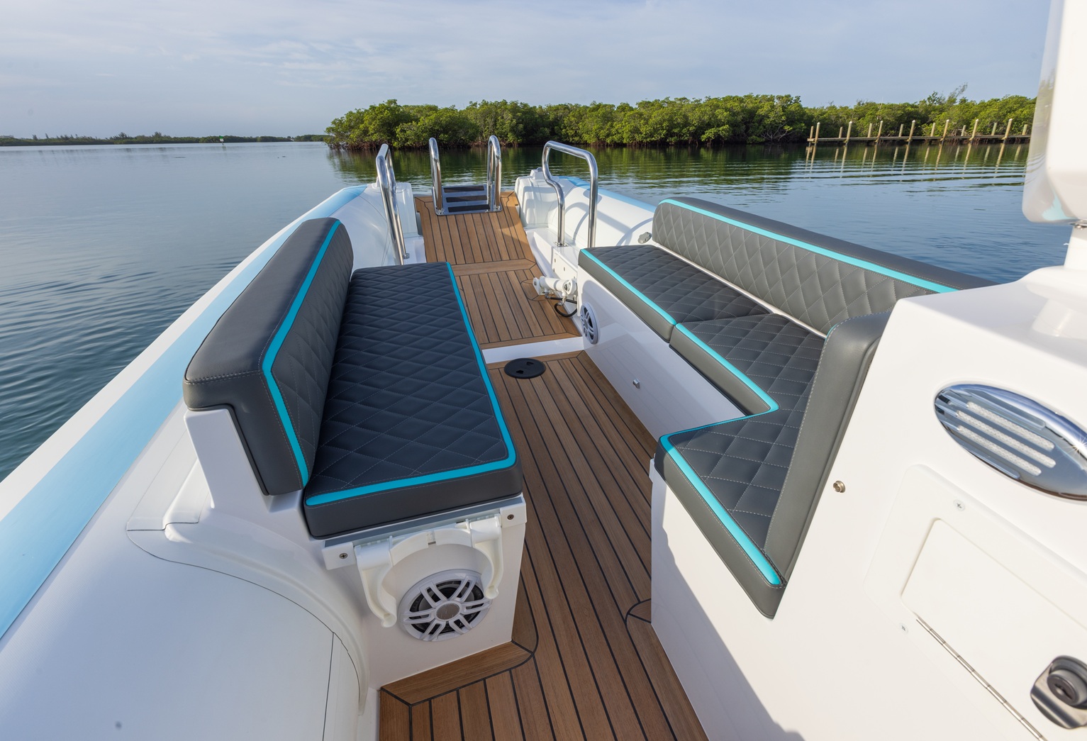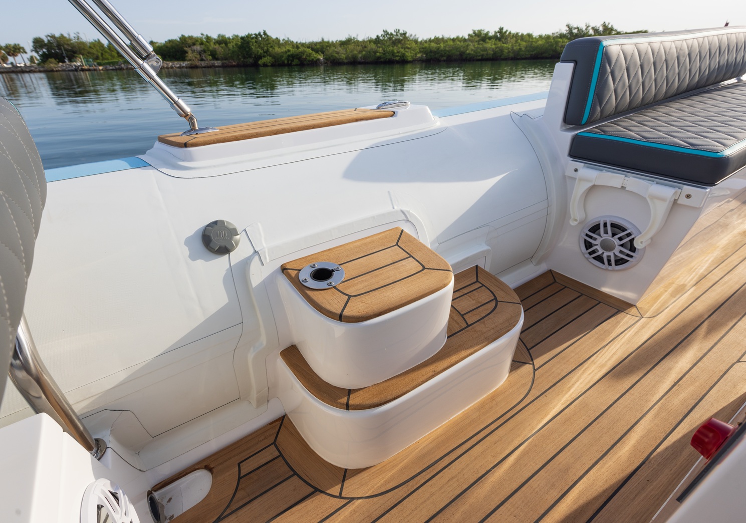 Yacht quality stainless steel hardware throughout: cleats, recessed railings, and cup holders
