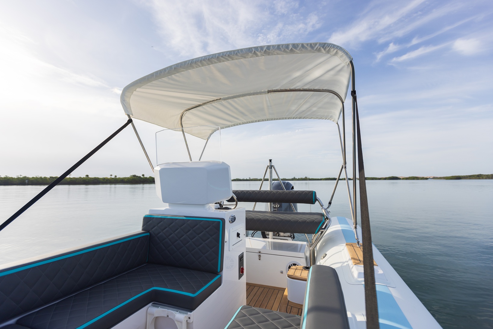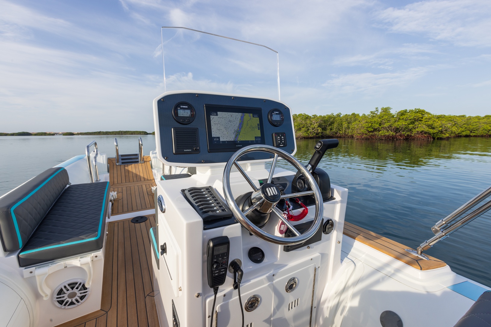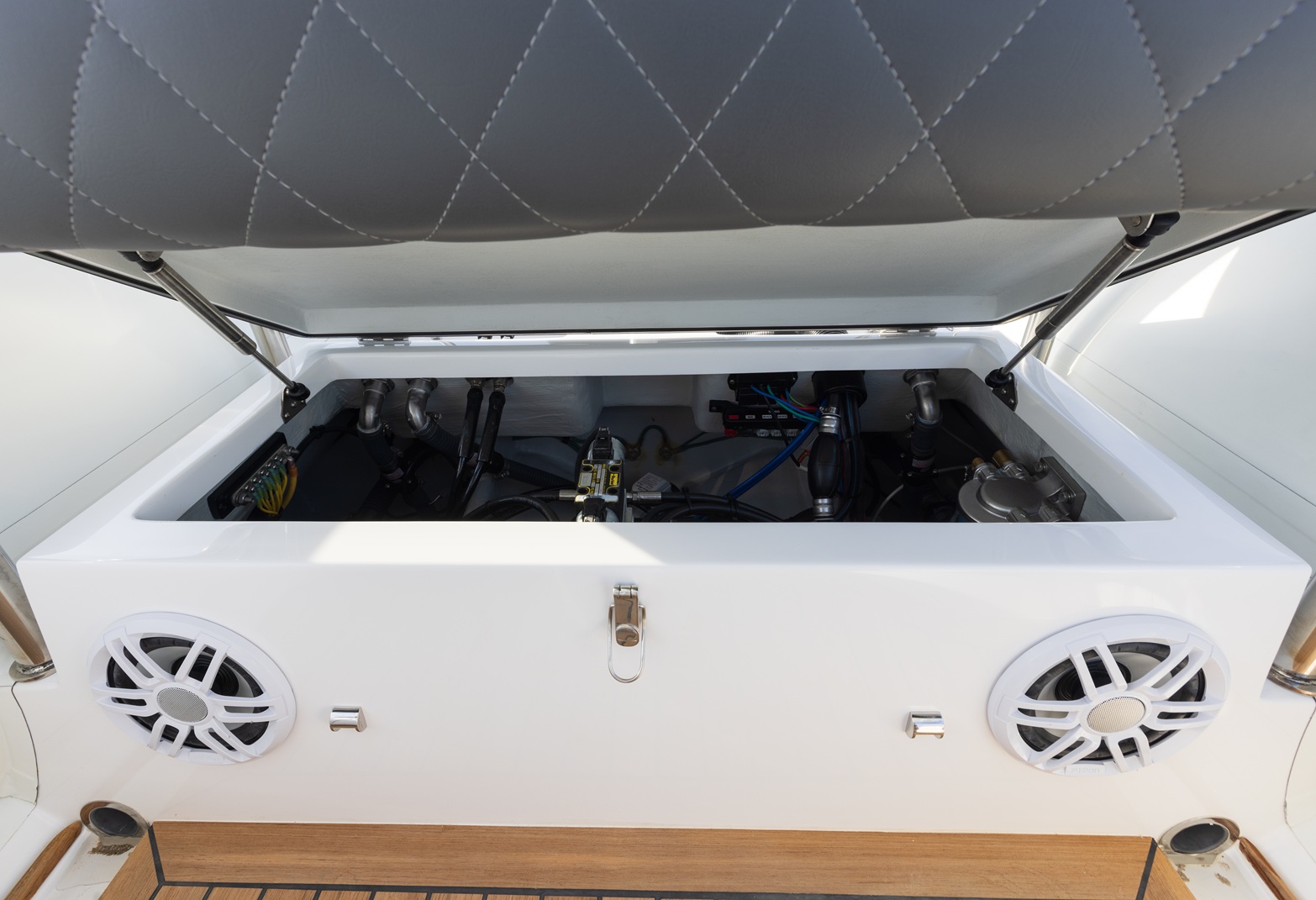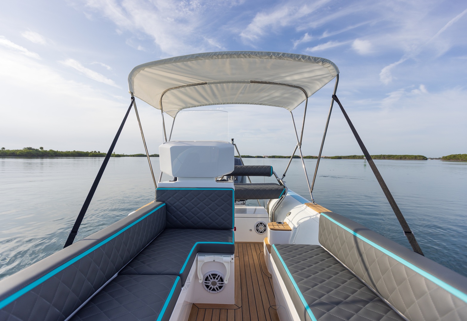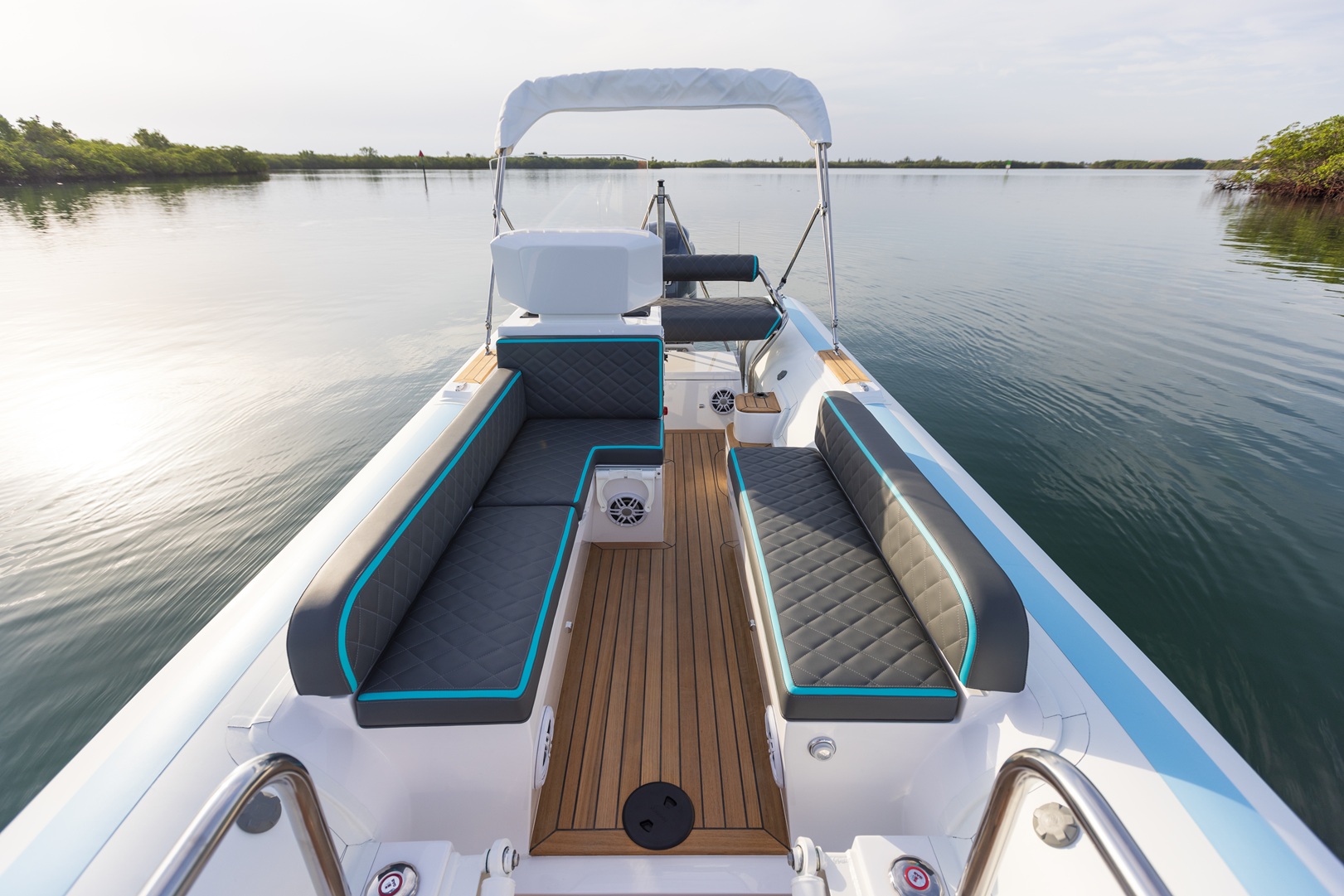 Yacht quality stainless steel hardware throughout: cleats, recessed railings, and cup holders