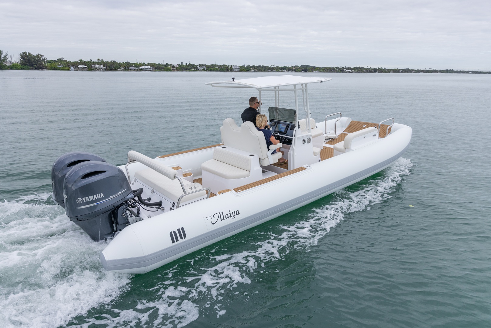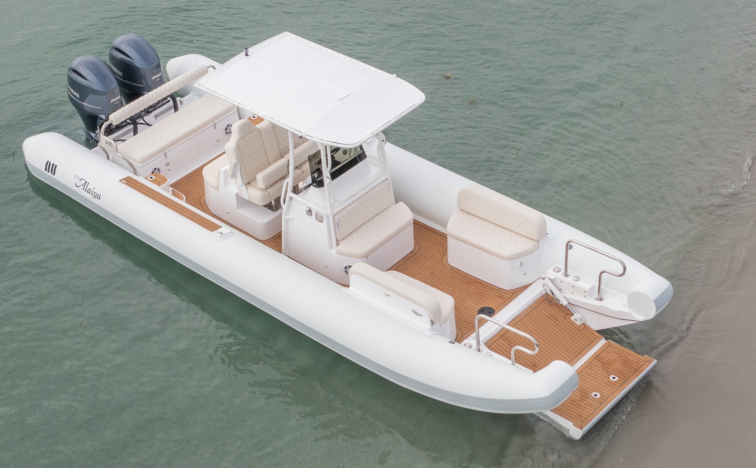 Novurania CAT 28 Tender from Inflatable Boat Pro - The Novurania CAT 28 Tender with its forward hydraulic landing craft door has an LOA or 28'7" and a beam of 10'8". Seating 14 people, and max of 400 HP (Twin 200's) , the Novurania CAT 28 from Inflatable Boat Pro is the perfect mix of style, functionality, and performance.