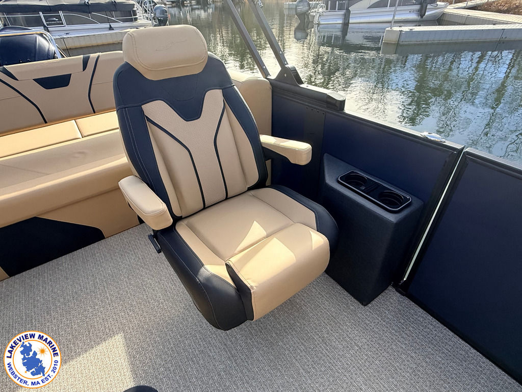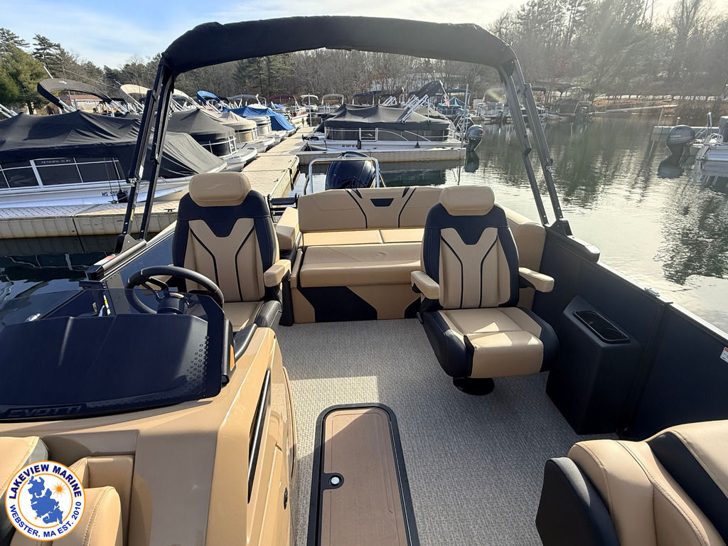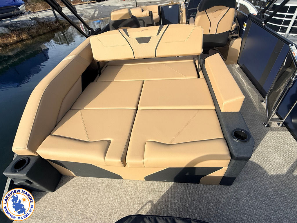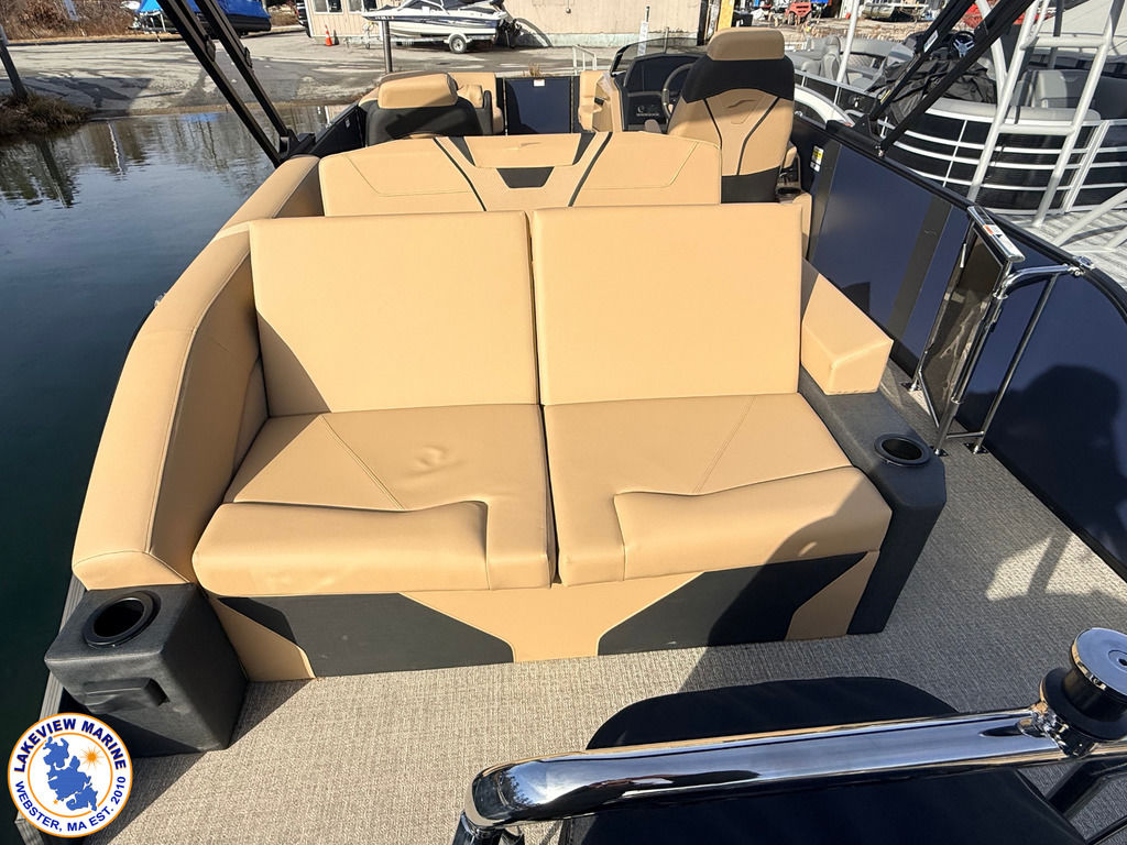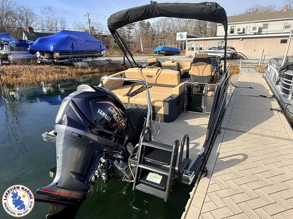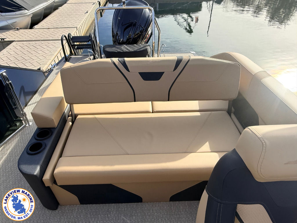 Powered by the 250hp Yamaha V-Max SHO, this Tritoon offers room for 11 passengers with two forward Chaise Loungers and a 7-Position Stern Lounger that delivers flexibility for hosting, relaxing or soaking up the sun. Features include Power Assist Steering, Flip-down Chaise Armrests, Blackout Rails, Power Bimini w/ Lights, Fiberglass Helm and In-Floor Bow Anchor Storage!