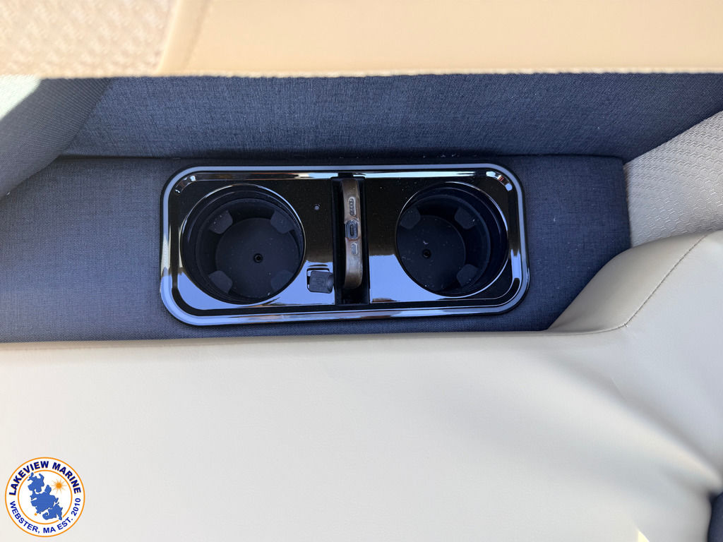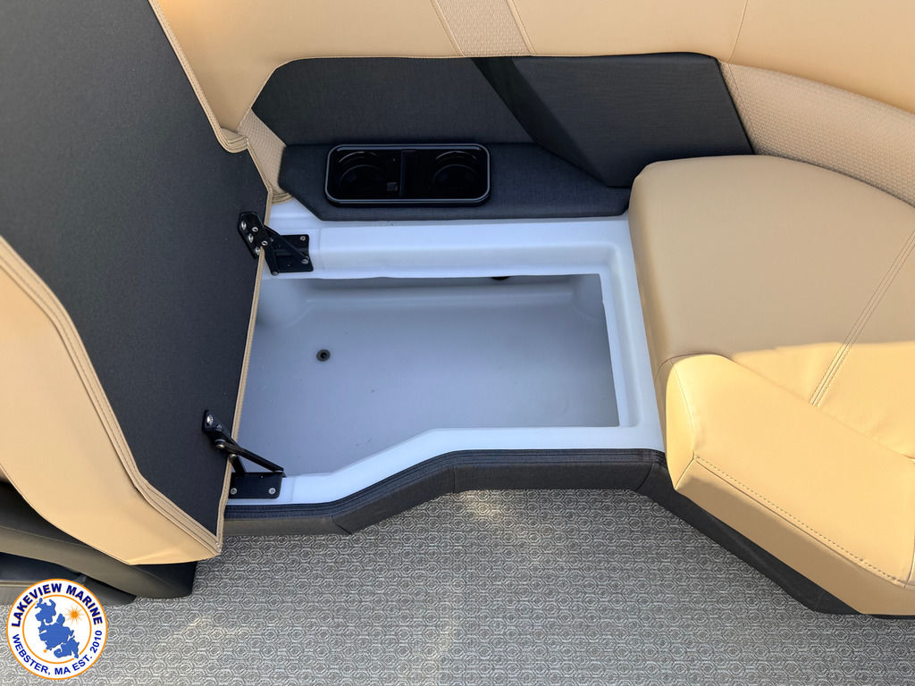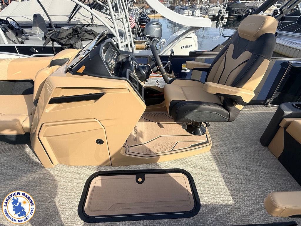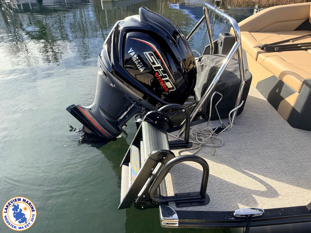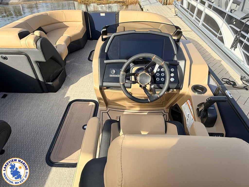 Powered by the 250hp Yamaha V-Max SHO, this Tritoon offers room for 11 passengers with two forward Chaise Loungers and a 7-Position Stern Lounger that delivers flexibility for hosting, relaxing or soaking up the sun. Features include Power Assist Steering, Flip-down Chaise Armrests, Blackout Rails, Power Bimini w/ Lights, Fiberglass Helm and In-Floor Bow Anchor Storage!