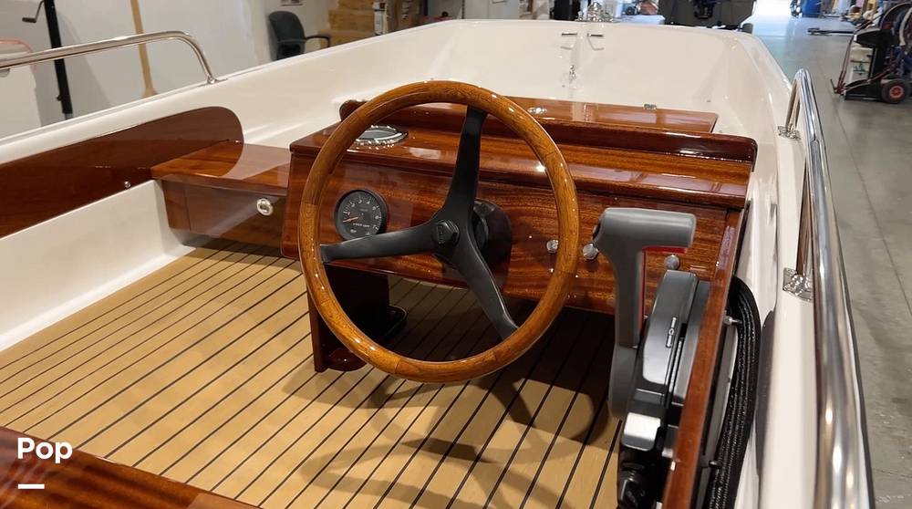What really sets this boat apart is its premium craftsmanship. The interior showcases beautiful sapele mahogany accents, giving it that rich, classic look that never goes out of style. The layout is clean and open, offering plenty of usable space while maintaining a sleek, uncluttered feel.