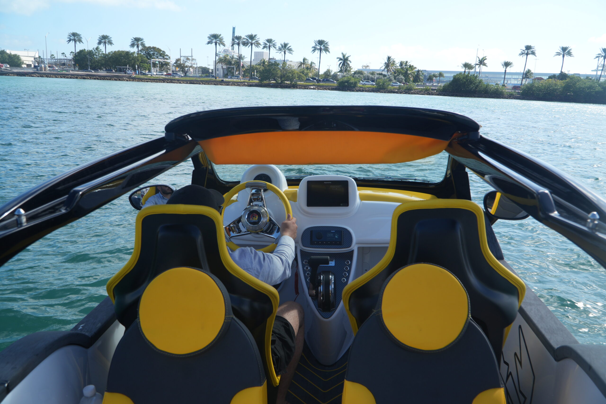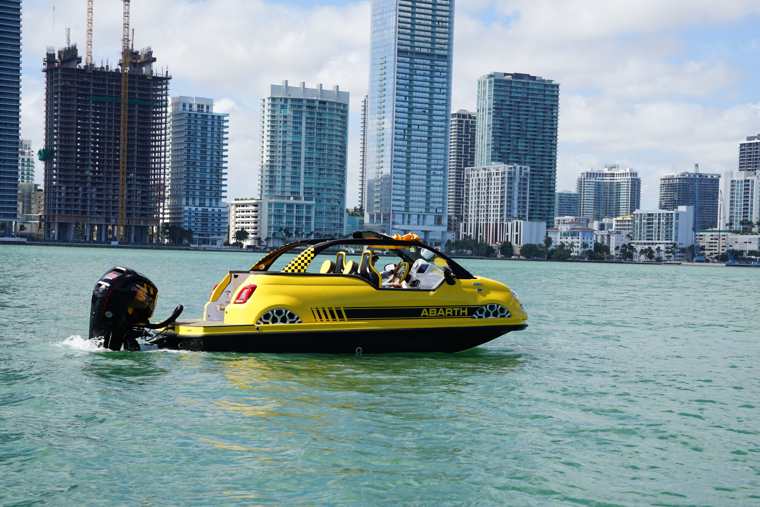 a clean classic style model with features inspired by the Fiat 500 Italian style icon. The project successfully combines luxury, efficiency, style and comfort. The natural curved lines and the absence of straight lines, offer a dynamic movement and a unique character to the design. Thus combining the beauty of boating with the comfort of driving on the road.