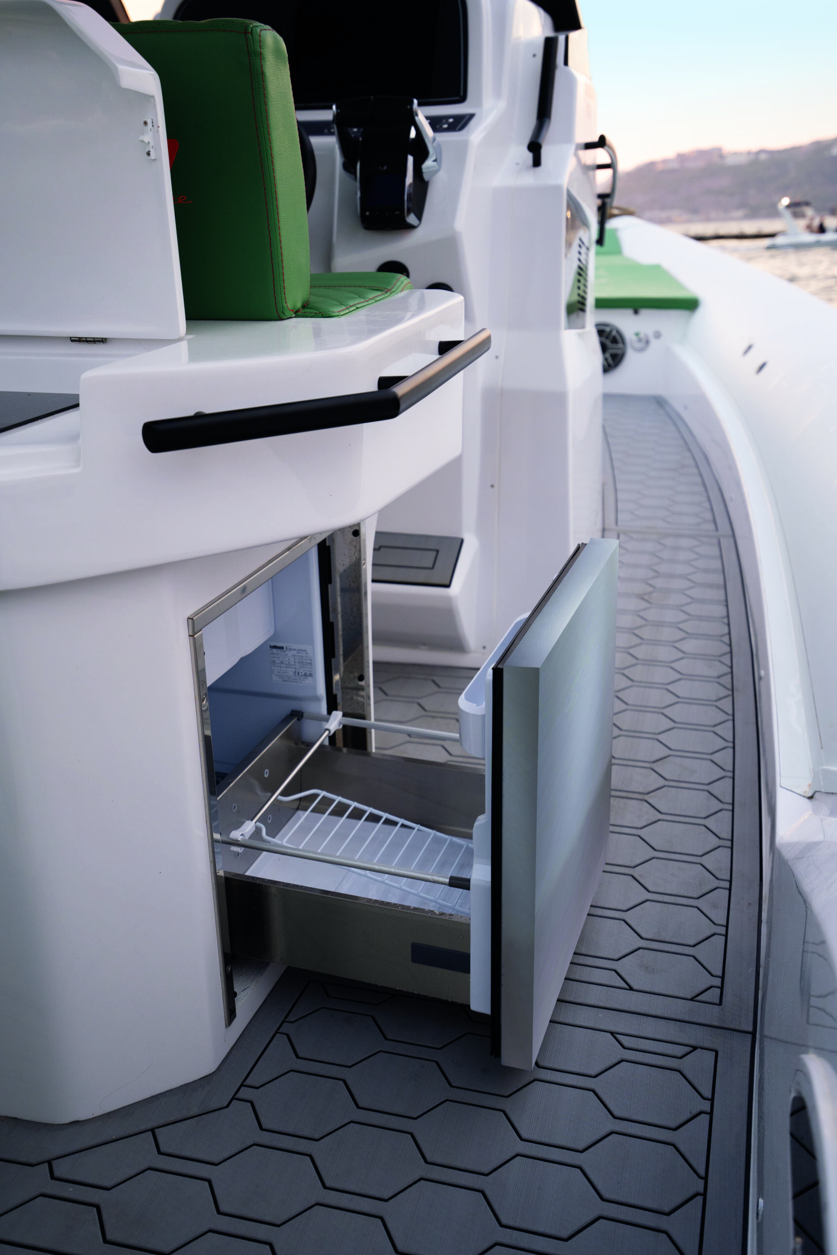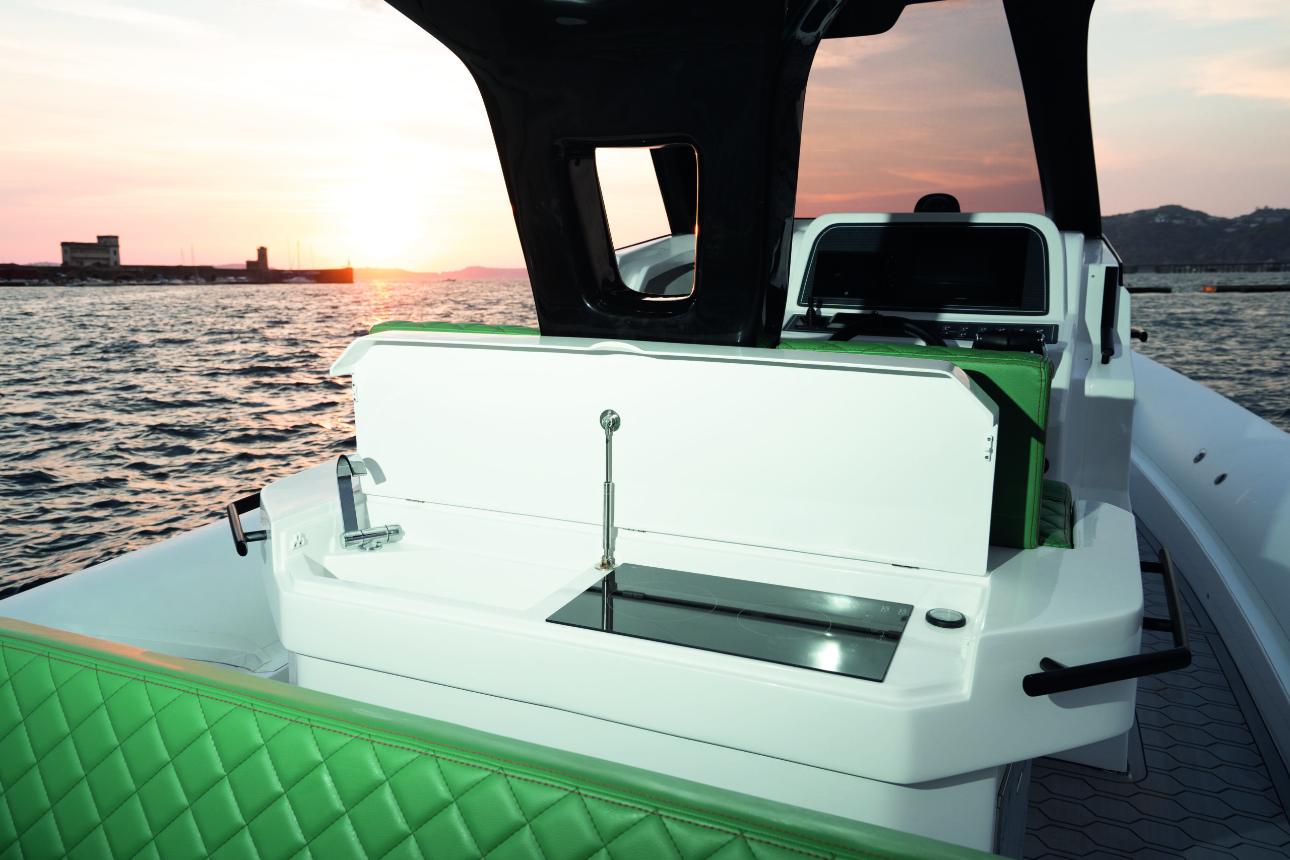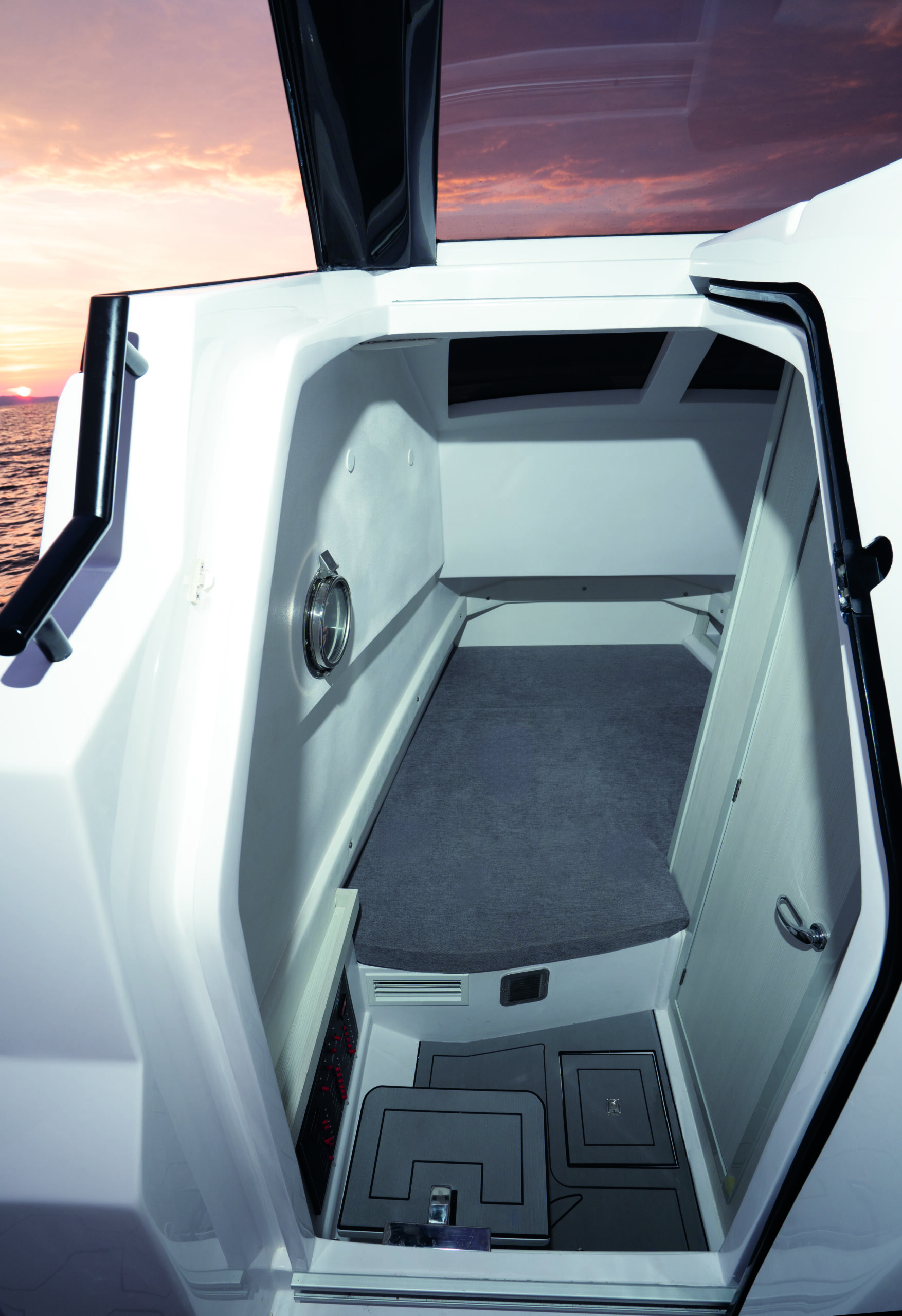 The boat also boasts a number of practical features, including an automatic cabin door, an automatic table on the bow that can be converted into a sunbed, and aft sunbeds. For even more convenience, you can add a deck ice maker, cooler, and grill. The T-top provides shade and protection from the elements.
