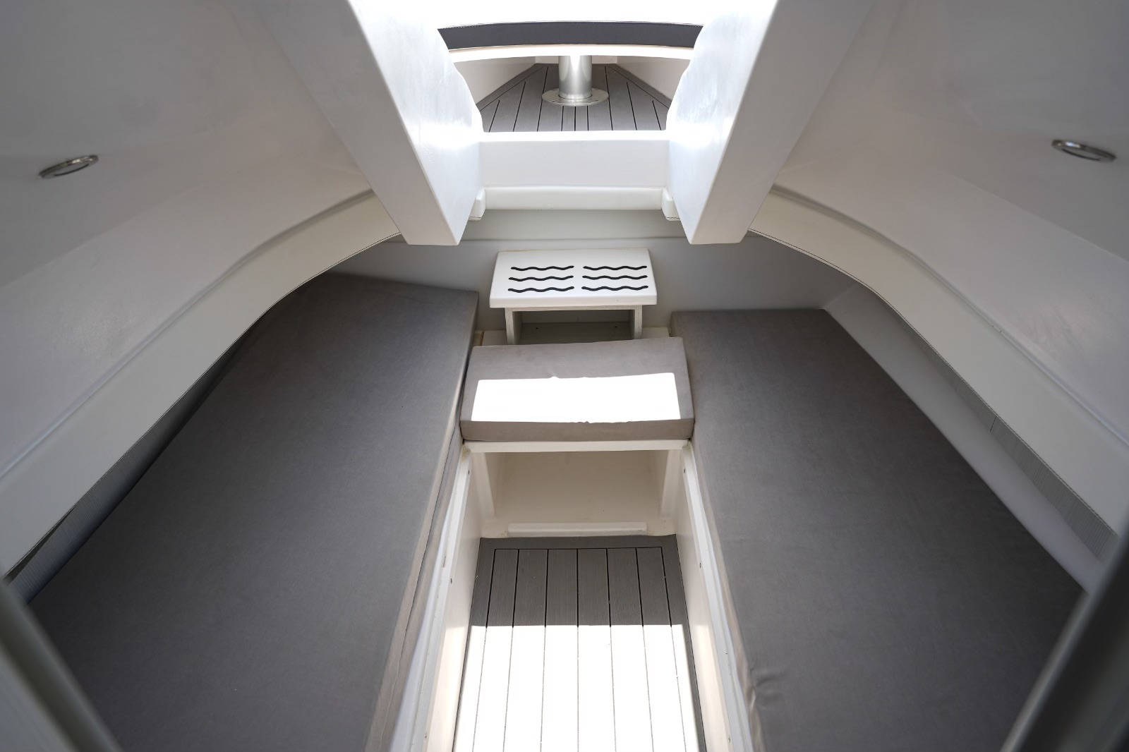 The boat also boasts a number of practical features, including an automatic cabin door, an automatic table on the bow that can be converted into a sunbed, and aft sunbeds. For even more convenience, you can add a deck ice maker, cooler, and grill. The T-top provides shade and protection from the elements.