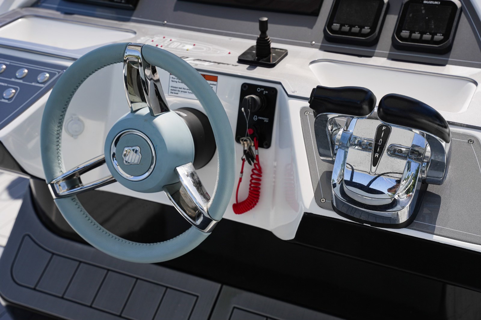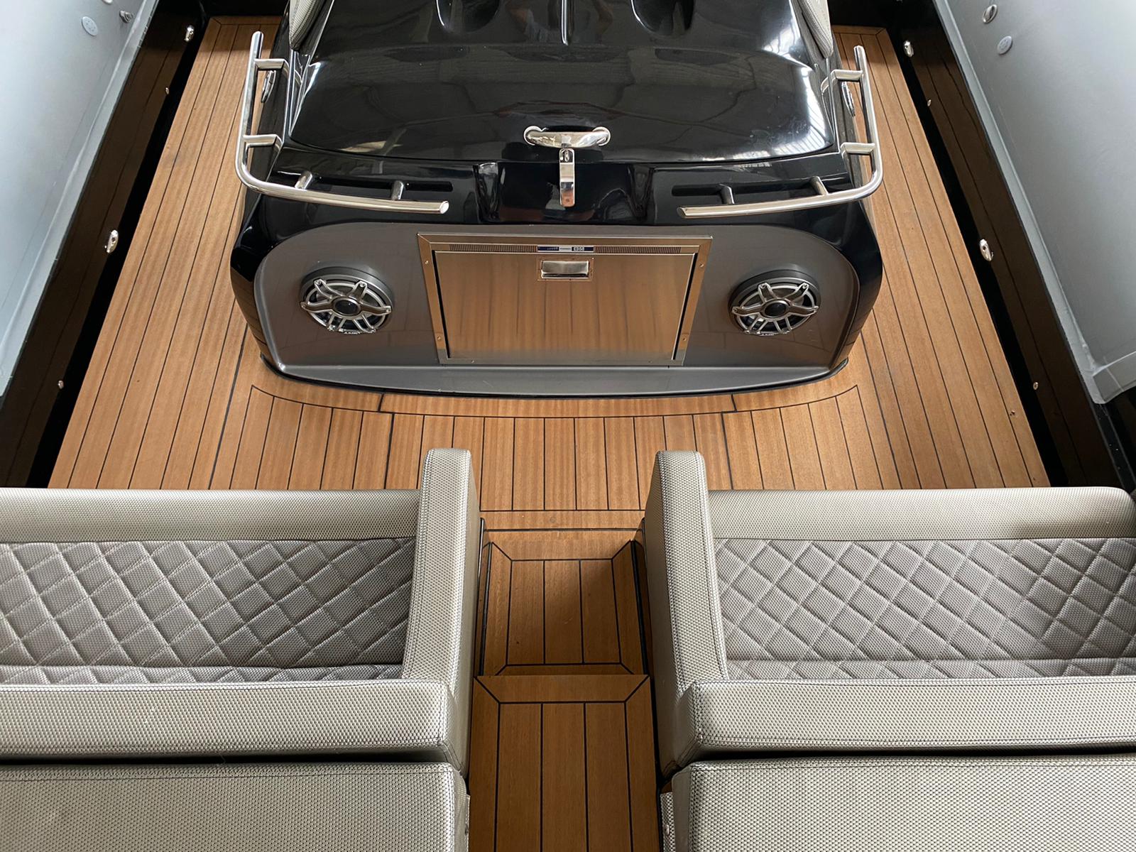 The boat also boasts a number of practical features, including an automatic cabin door, an automatic table on the bow that can be converted into a sunbed, and aft sunbeds. For even more convenience, you can add a deck ice maker, cooler, and grill. The T-top provides shade and protection from the elements.
