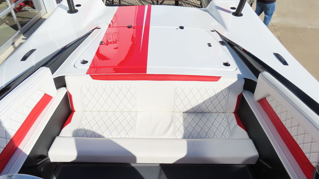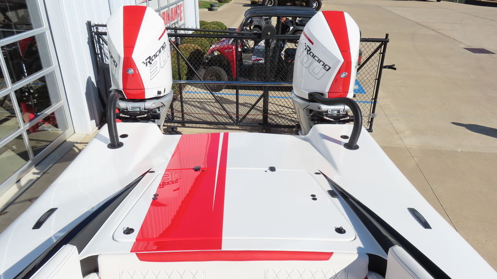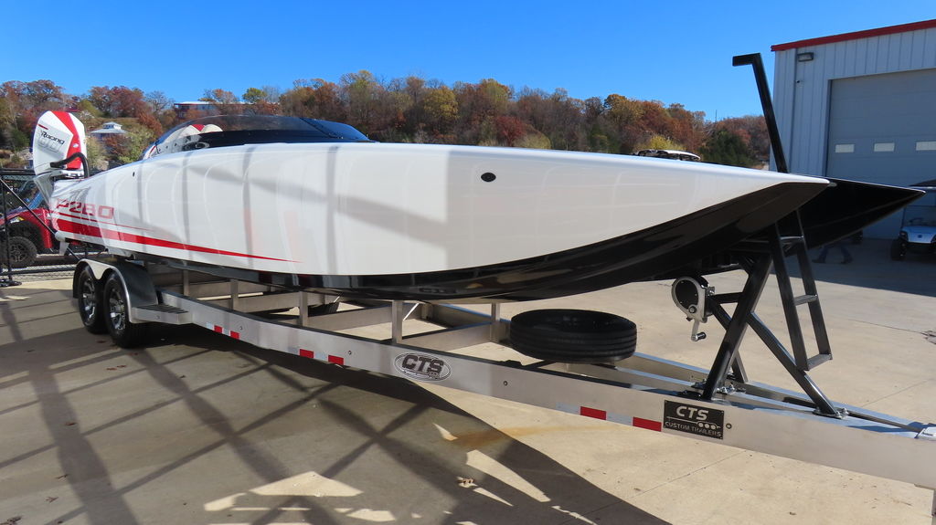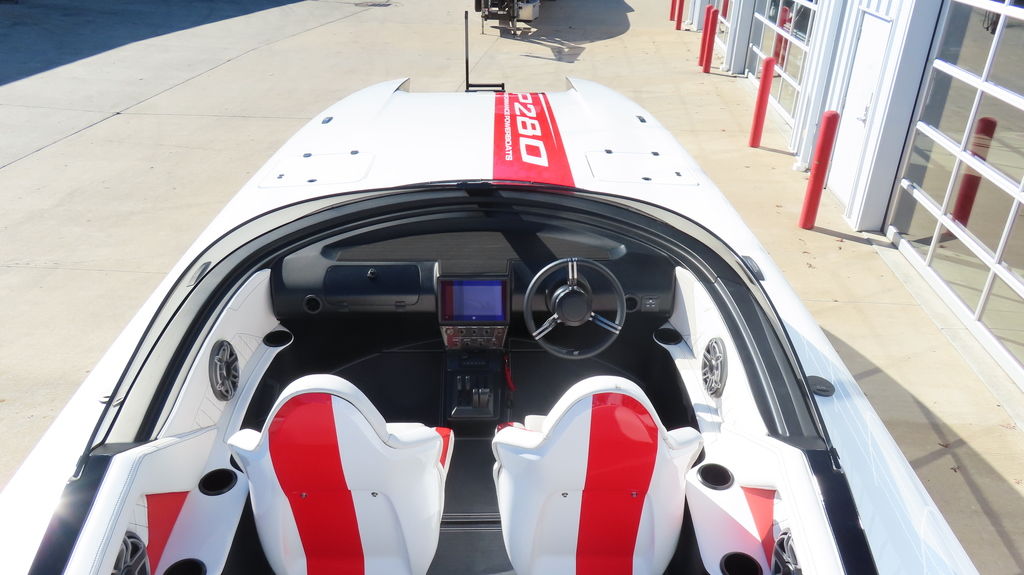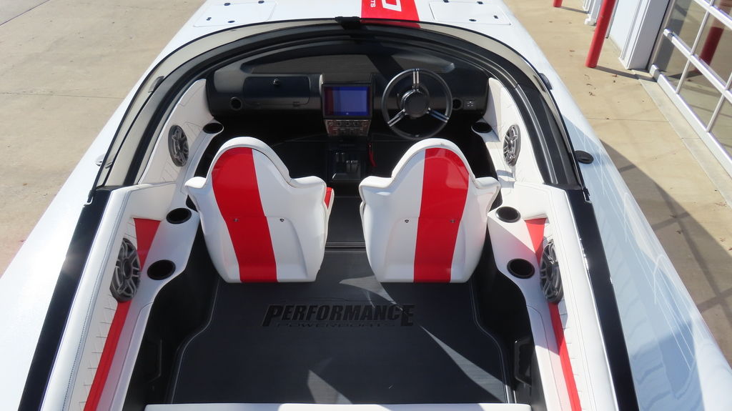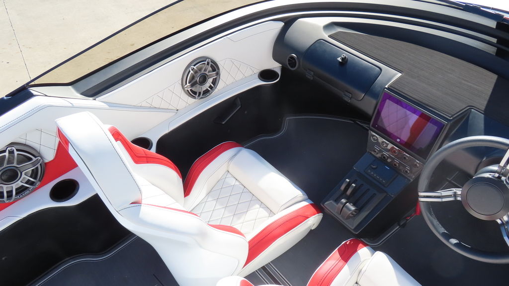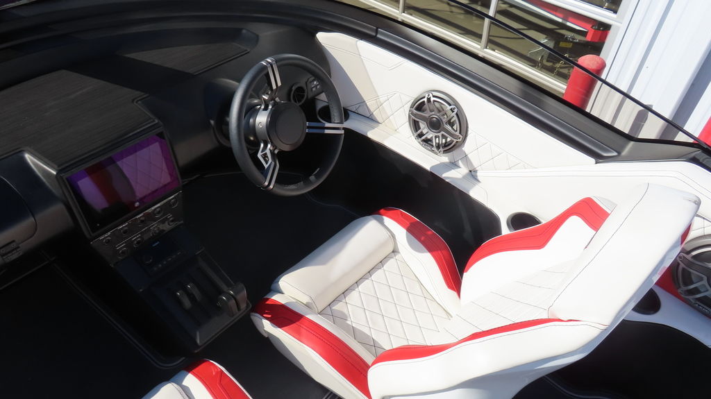 Mercury CNC 5 blade cleaver props, Mercury DTS(digital throttle/shift), Vessel View 902, Fusion/JL Audio sound system with 7.7 JL Audio components, JL Audio Subwoofer, Isotta steering wheel, Sea Deck flooring, custom interior, custom dash panels, LED navigation lights, underwater lights, AGM batteries with remotes switching, on-board charger, cockpit cover, custom paint, and Myco aluminum trailer with LED lights, Mag wheels, and surge brakes all standard equipment.