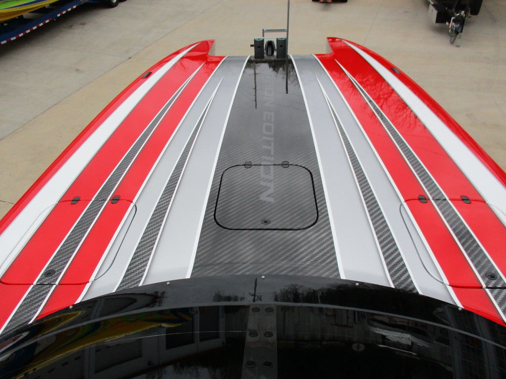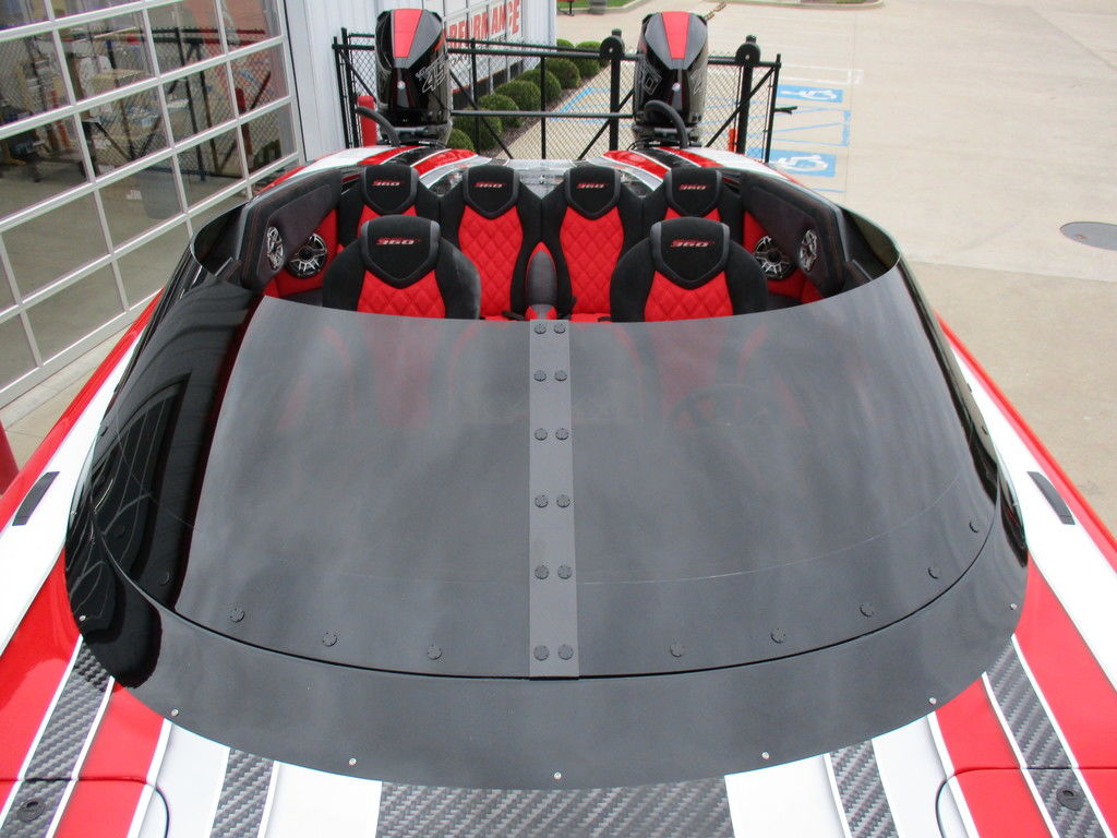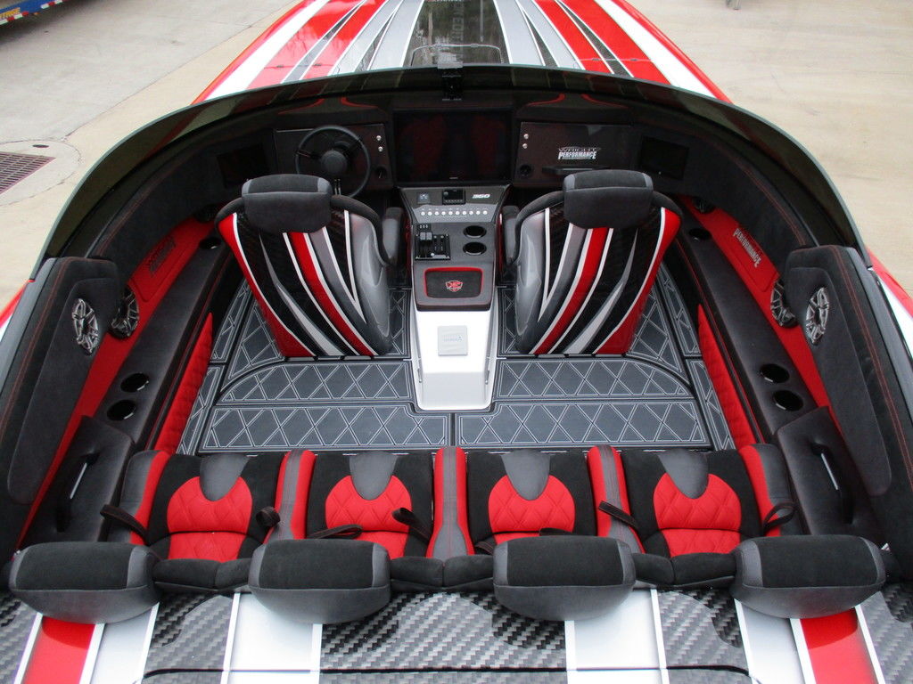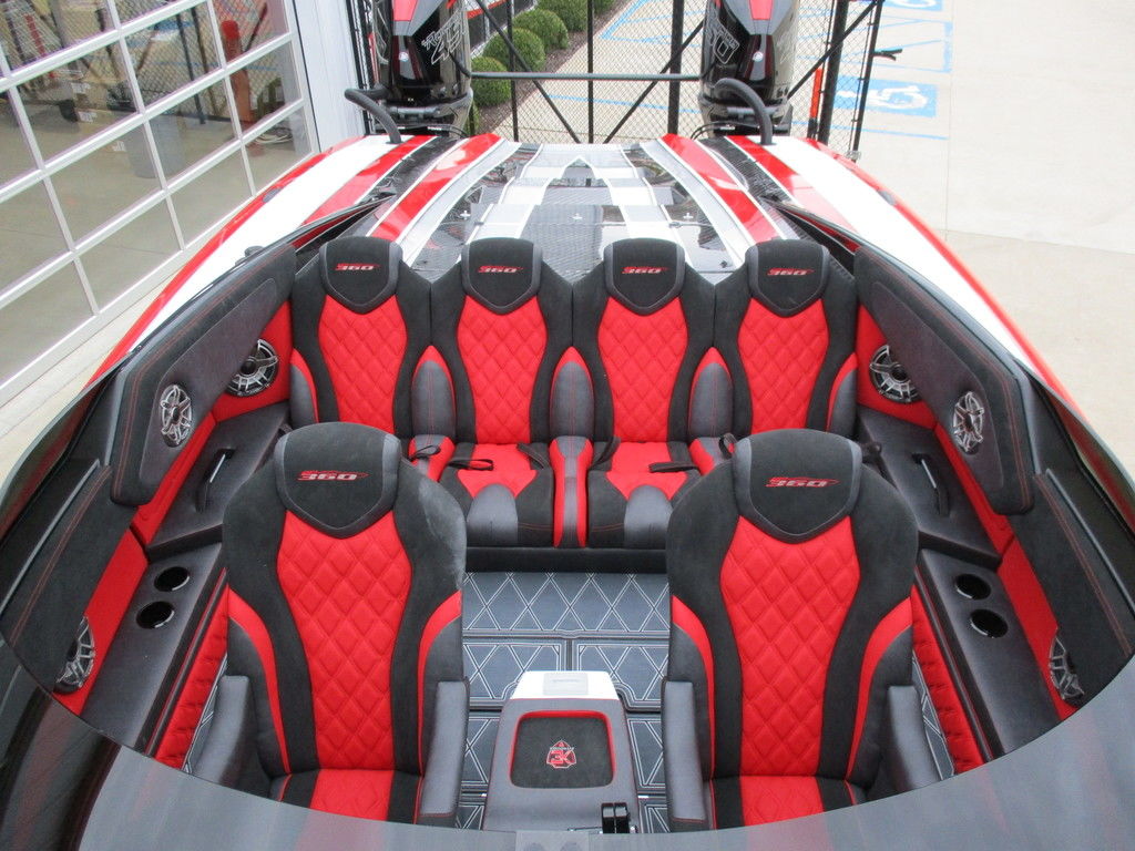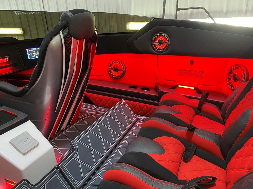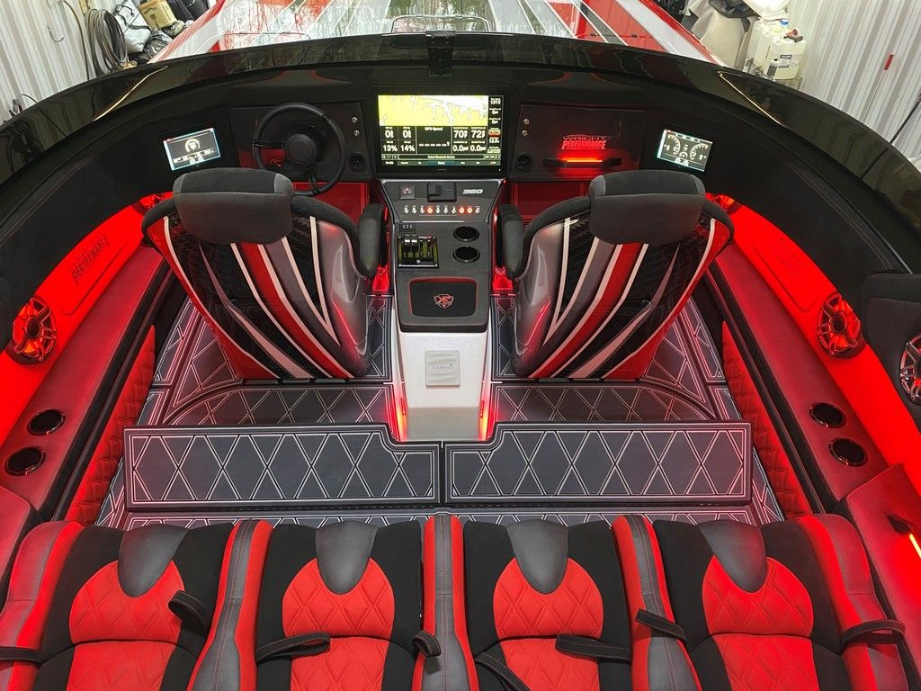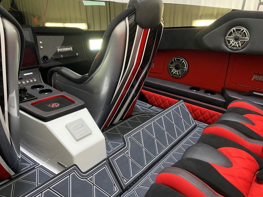 Mercury CNC 5 blade cleaver props, Garmin 8622 (22” display), Mercury DTS(digital throttle/shift), Vessel View 902, Fusion/JL Audio sound system with (6) 7.7 JL Audio components, JL Audio Subwoofer, Isotta steering wheel, Sea Deck flooring, custom interior, custom dash panels, LED navigation lights, underwater lights, (3) AGM batteries with remotes switching, on-board charger, cockpit cover, custom paint, and Myco aluminum trailer with LED lights, Mag wheels, and surge brakes all standard equipment.