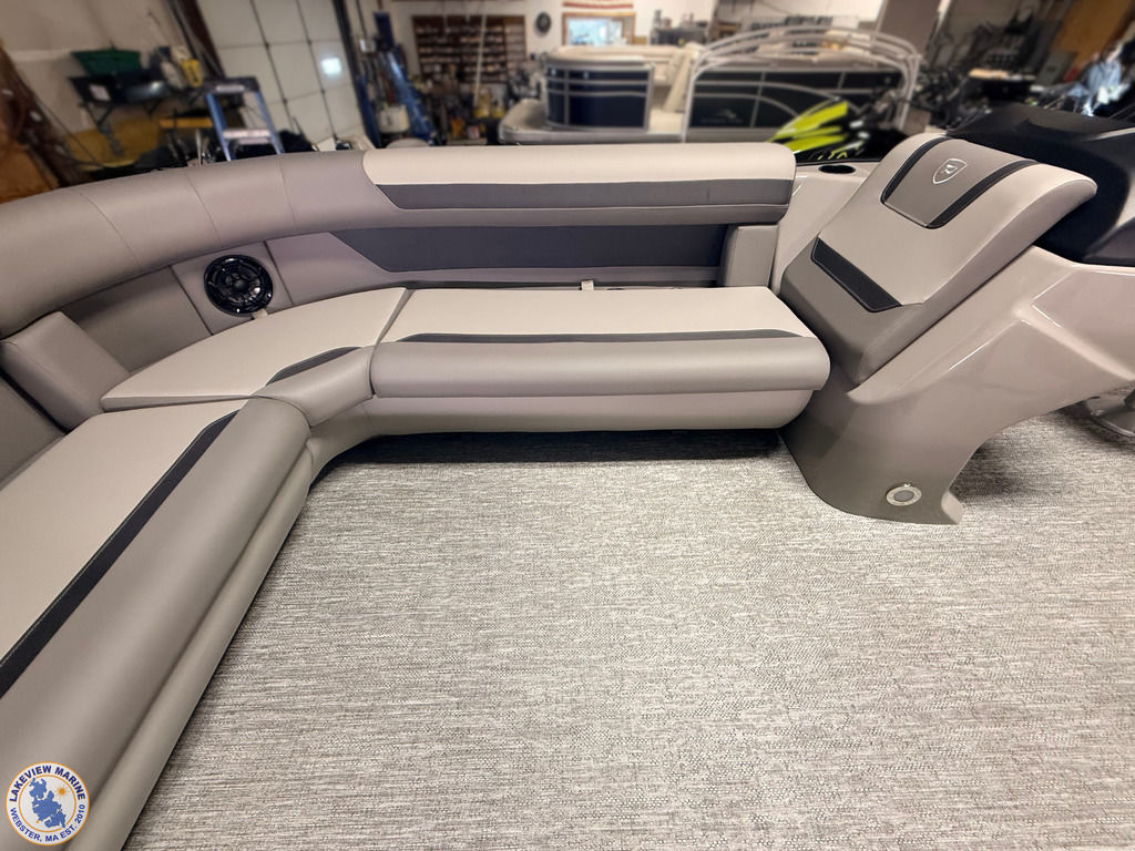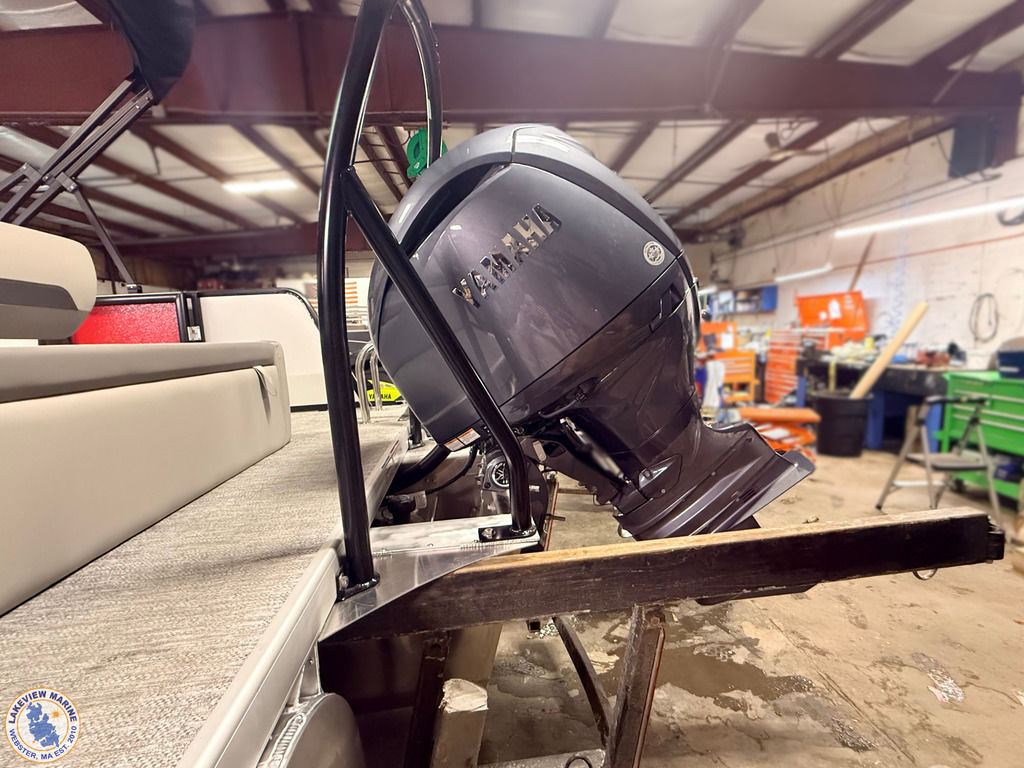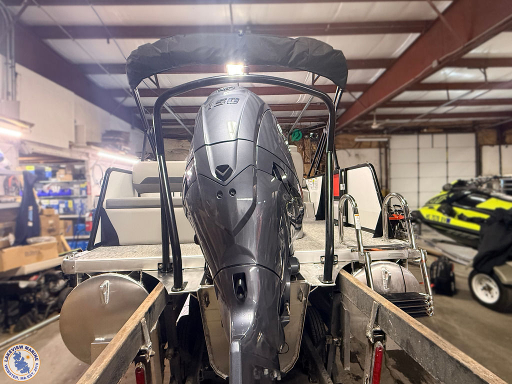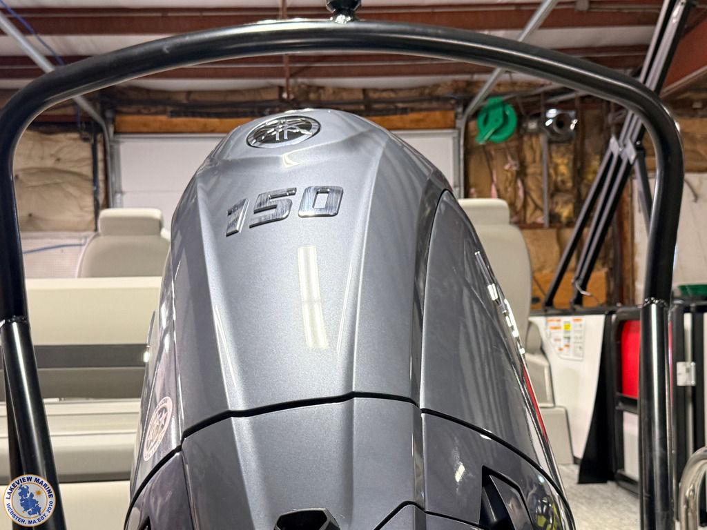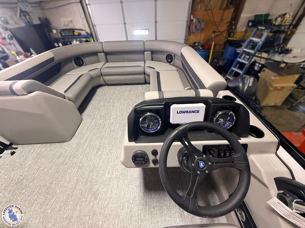 This tritoon is paired with the ultra-reliable 150hp Yamaha Outboard with Integrated Steering. Features include Captain & Co-Captain High Back Chairs, Bow Filler Couch, LED Dock Lights, Lowrance Eagle 5" Display, Mountain Grey Fiberglass Helm and Telescoping 4" wide step ladder