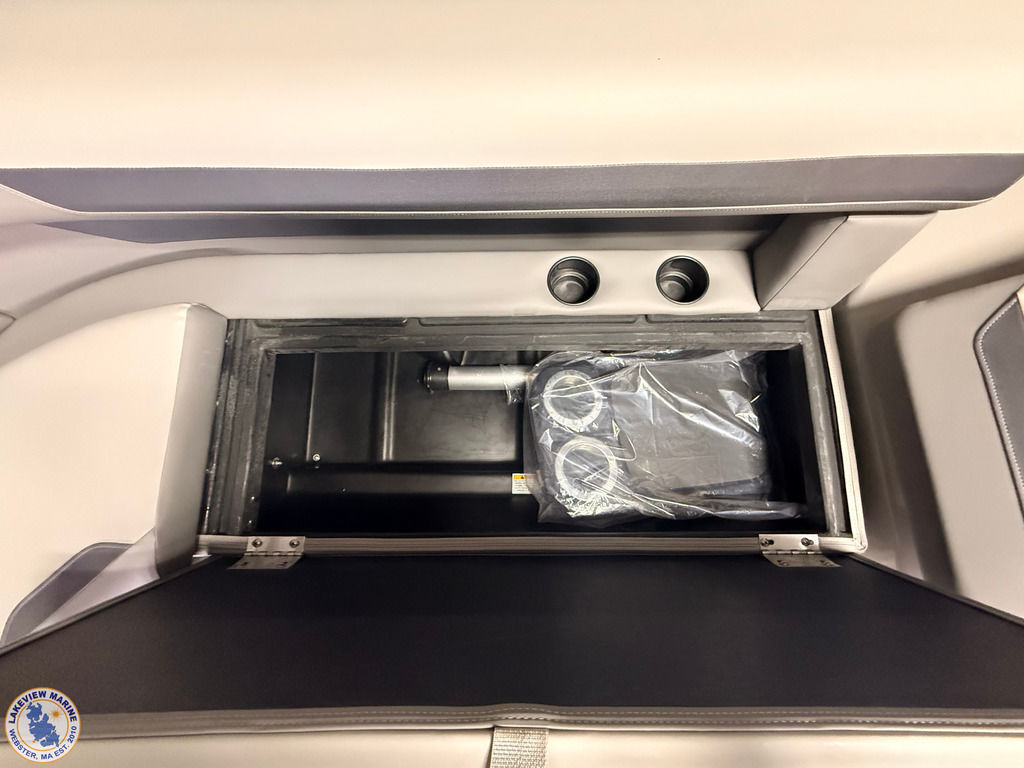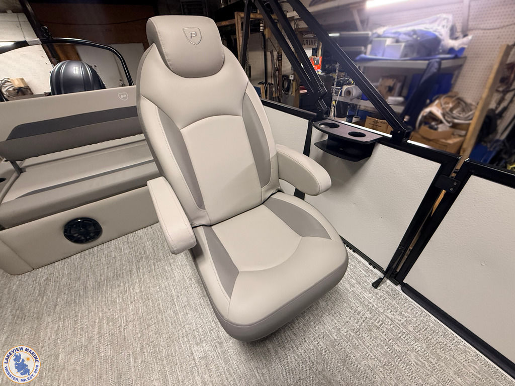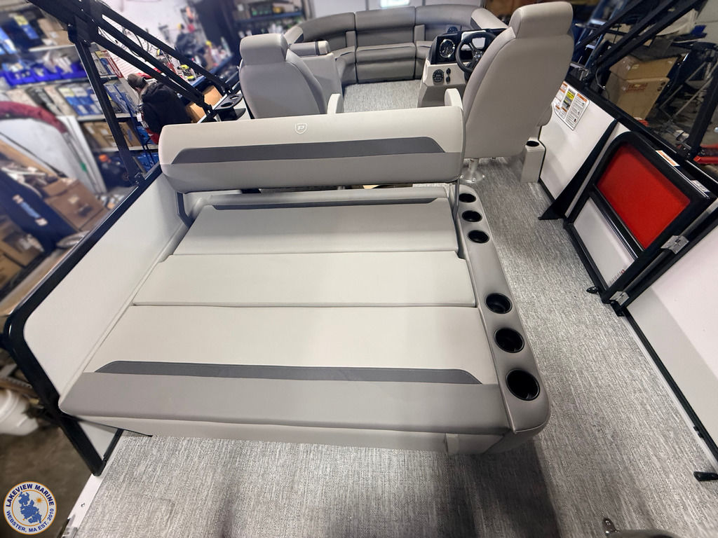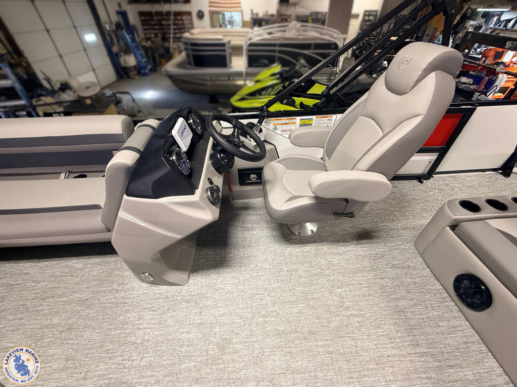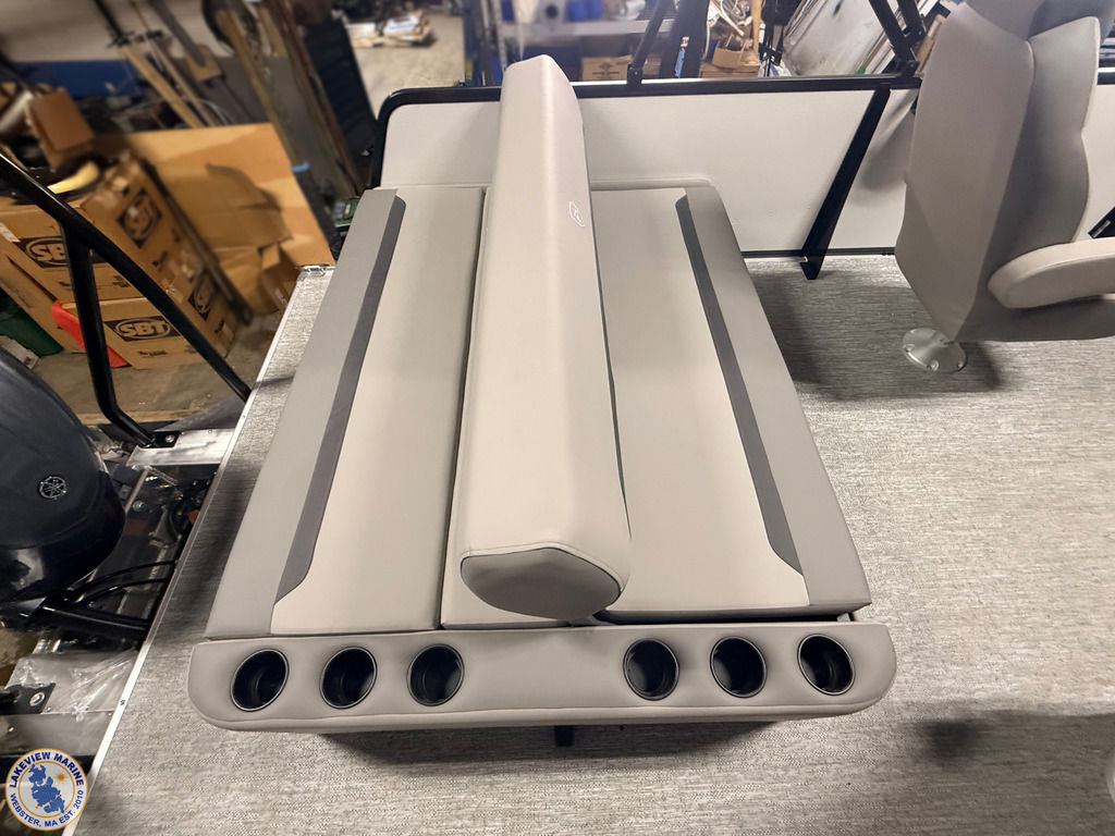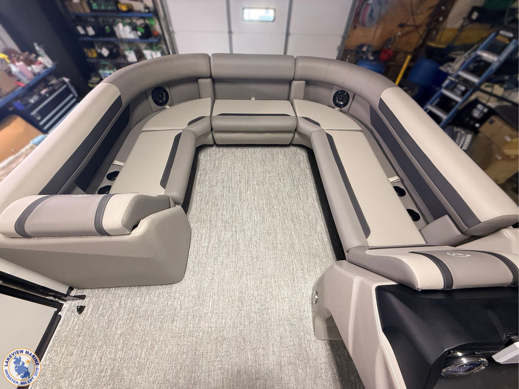 This tritoon is paired with the ultra-reliable 150hp Yamaha Outboard with Integrated Steering. Features include Captain & Co-Captain High Back Chairs, Bow Filler Couch, LED Dock Lights, Lowrance Eagle 5" Display, Mountain Grey Fiberglass Helm and Telescoping 4" wide step ladder
