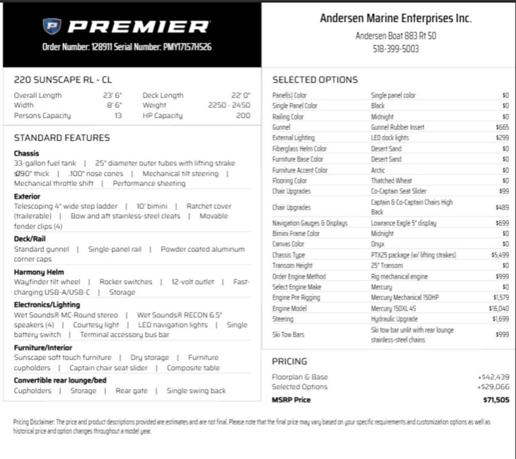 2026 Premier 220 Sunscape RL-CL PTX Tri-Toon 150hp w/Trailer