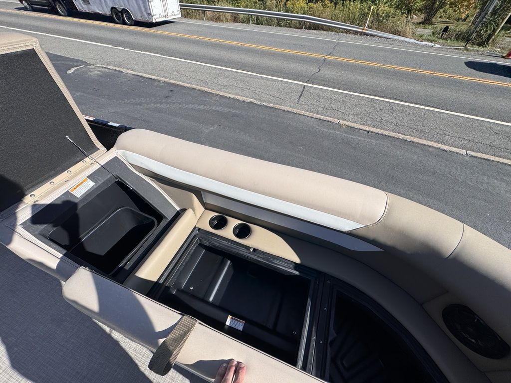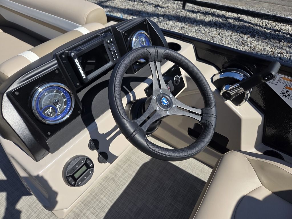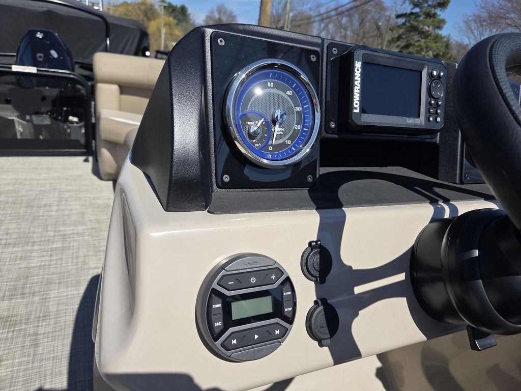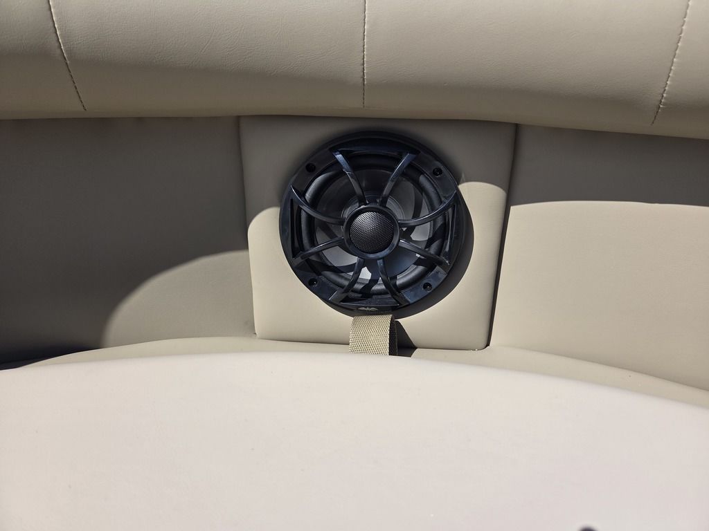 Equipped with a Lowrance Eagle 5” display for navigation and essential data. Includes fast-charging USB-A and USB-C ports at the helm. Outfitted with a Wet Sounds audio system featuring multiple speakers for an enjoyable on-water experience.
