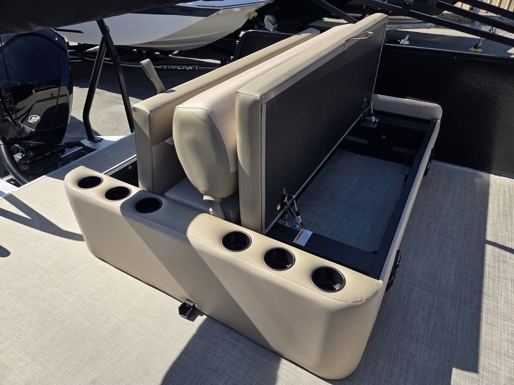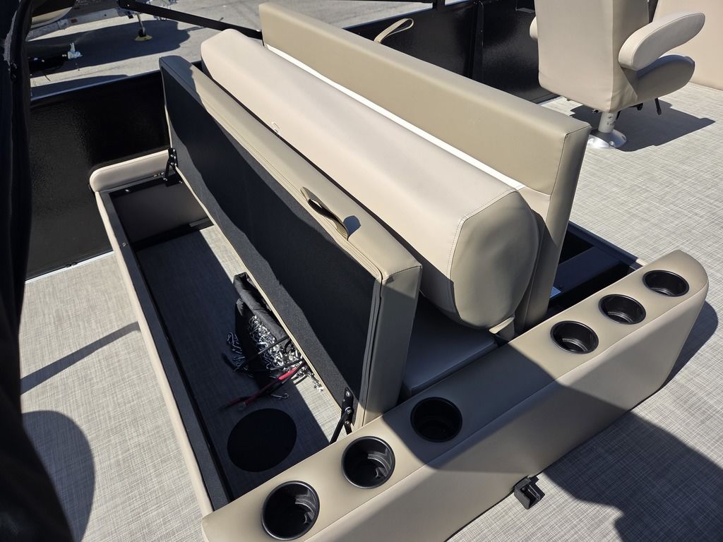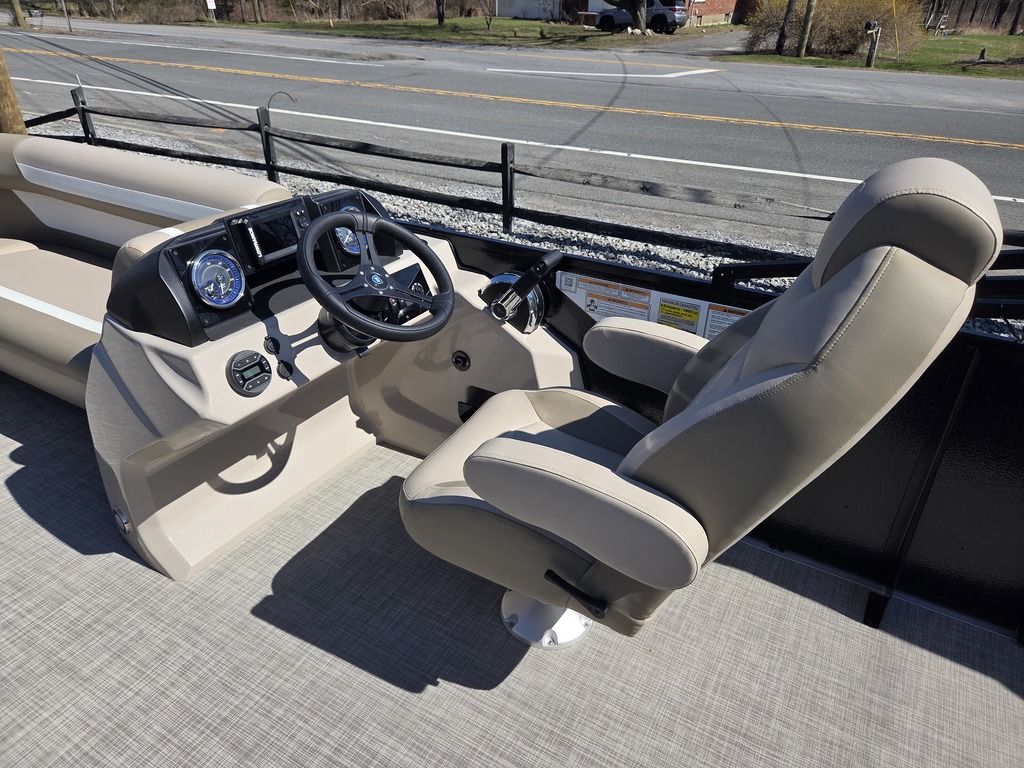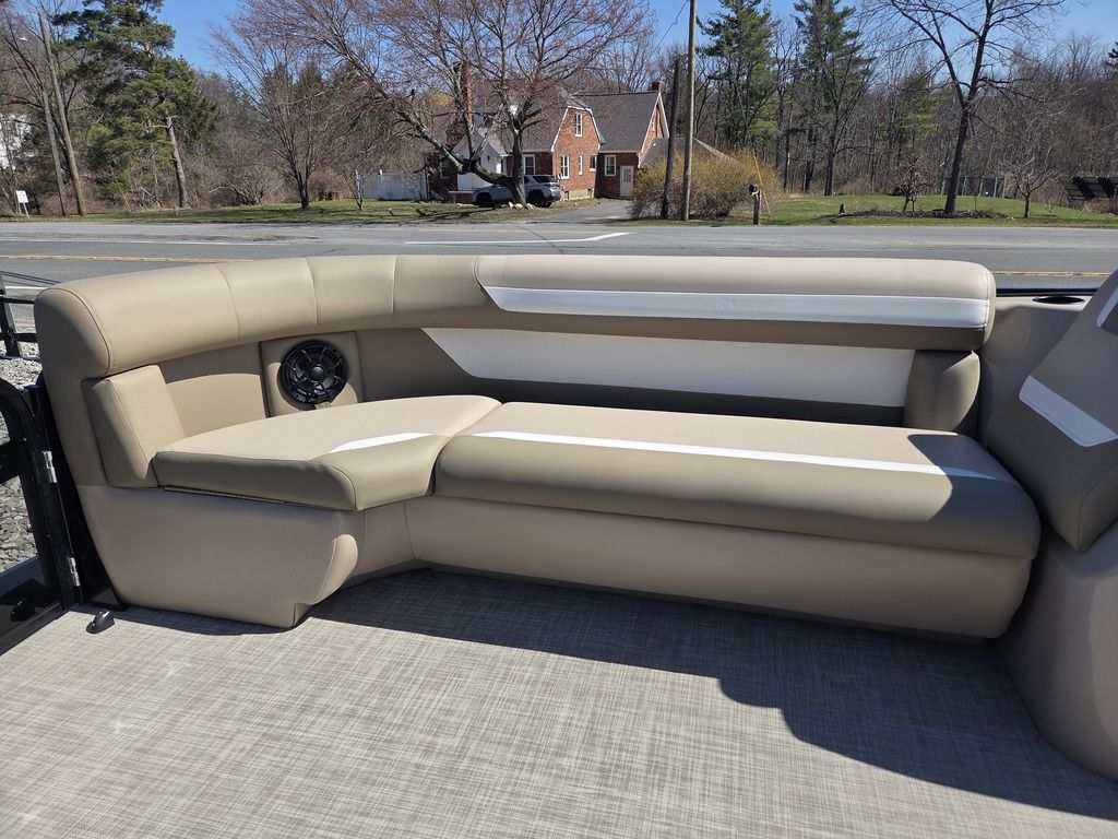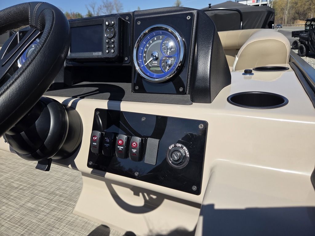 Equipped with a Lowrance Eagle 5” display for navigation and essential data. Includes fast-charging USB-A and USB-C ports at the helm. Outfitted with a Wet Sounds audio system featuring multiple speakers for an enjoyable on-water experience.