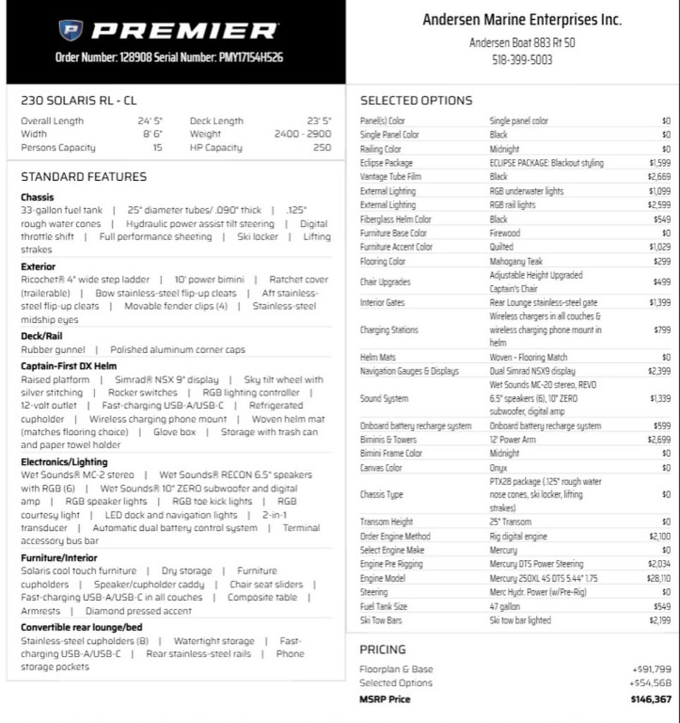 2026 Premier 230 Solaris RL-CL PTX Tri-Toon 250hp w/Trailer