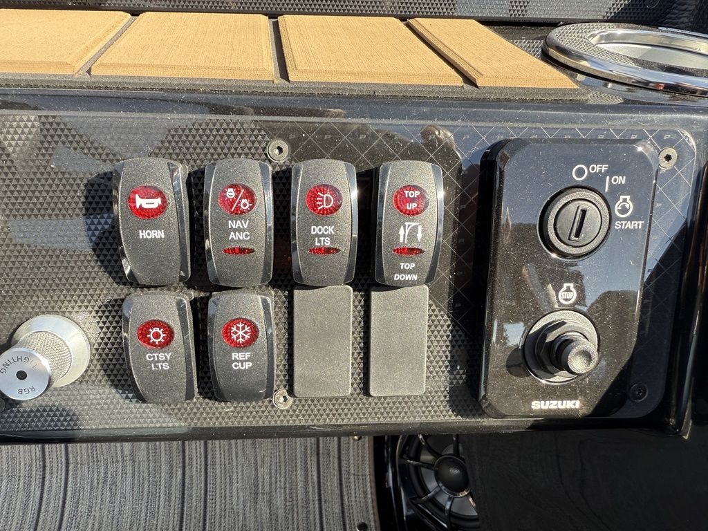 9" Simrad GPS Helm Screen, Two Tone Panel Color, 10' power Bimini Top, Eclipse Black Out Package, Double Desert Teak Flooring, 3M Vantage Tube Film, White powder Coated Rails, Full Mooring Cover, LED Ski-Tow Bar, Upgraded Fiberglass Helm Color (Black), Clear View Front Gate, Dual Battery Switch, LED Docking Lights, Cupholders (21), In-Floor Ski Locker, Refrigerated Cup Holder (Helm), Hydraulic Power Assist Steering, 47 Gallon Fuel Tank and PTX 28 Triple Tube Package