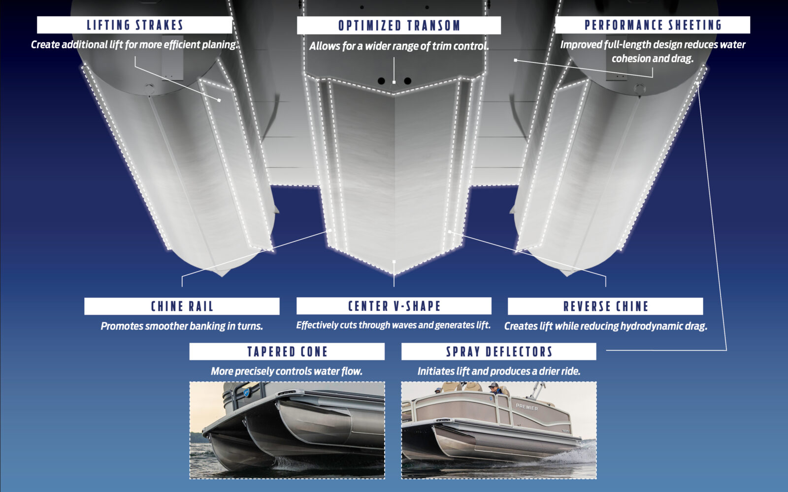 The perfect introduction to the Premier family is now even better with new on-trend furniture featuring popular dark colors and modern accent choices. Plus, with Sunsation you’ll experience the absolute best ride in the industry with the all-new supercharged PTX chassis; find the ultimate in comfort and control with our new captain-first helm; and surround yourself with our exclusive, all-new immersive audio experience.