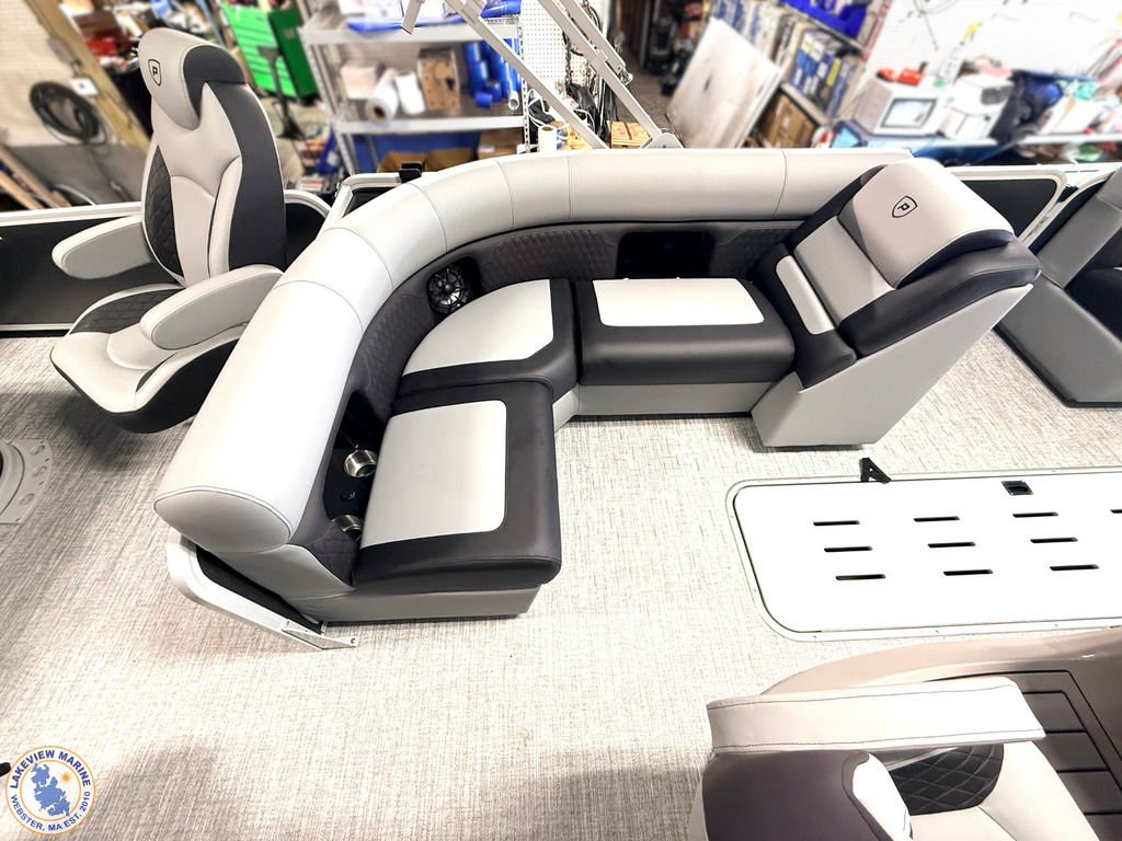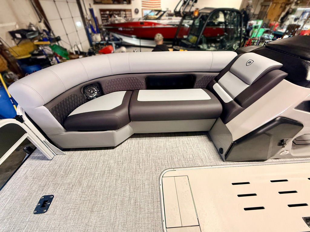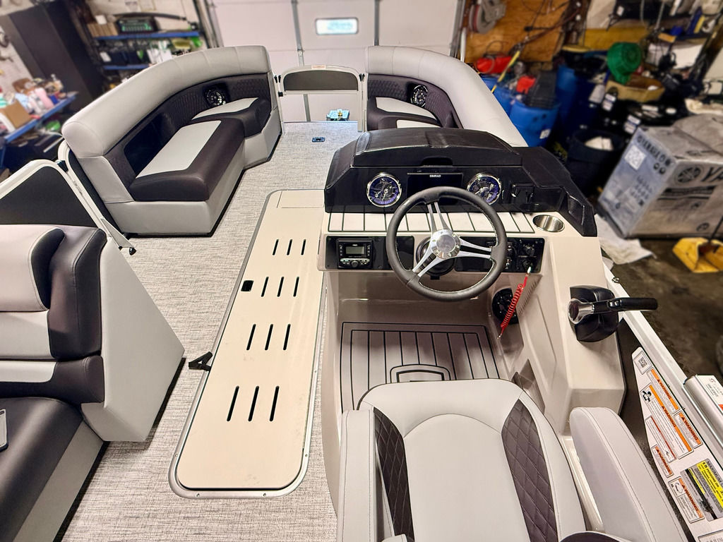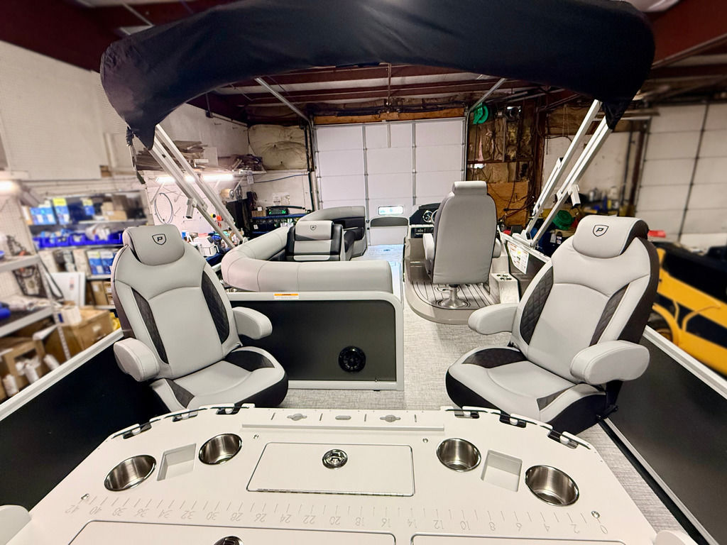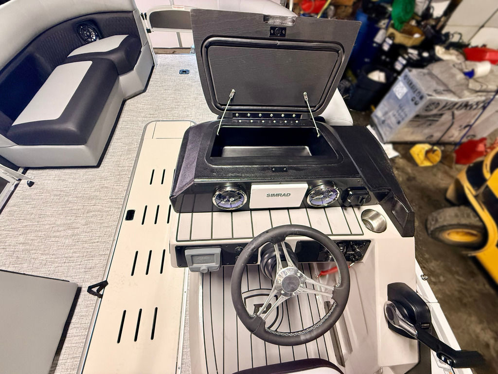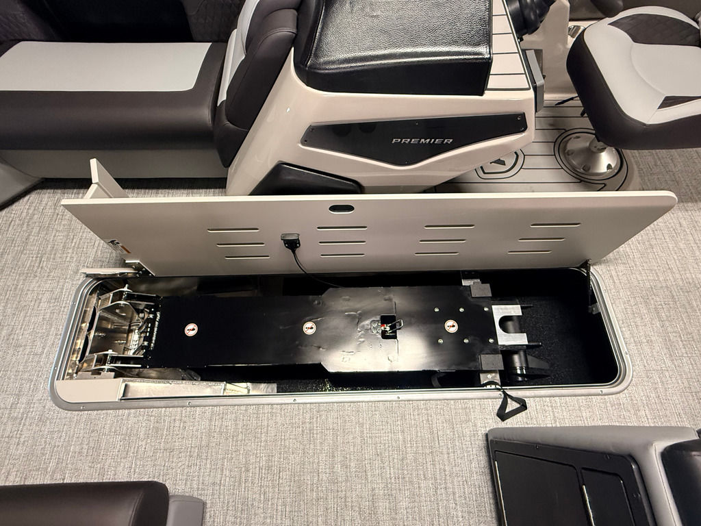 The Angler Series from Premier Pontoons is the smartest fish-ready pontoon in the industry. This tritoon is paired with the ultra-reliable Yamaha 150hp V-Max SHO Outboard and features an open water panel that easily swings open and stows out of the way, giving you direct access to the water. The Minn Kota Terrova Trolling Motor easily stows, revolutionizing the trolling motor experience! The rear fishing station features a livewell, 6 rod holders, bait bucket, fishing ruler, tackle boxes (3), 2 fishing chairs and drawer storage. We can't wait to show you this phenomenal fishing model!