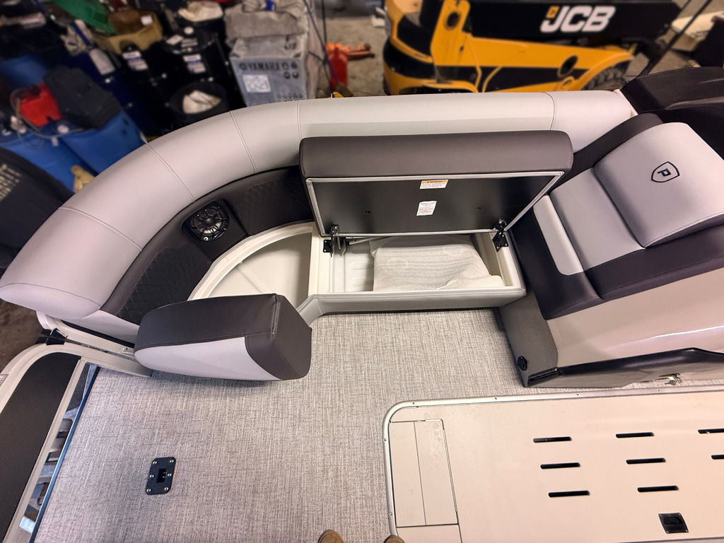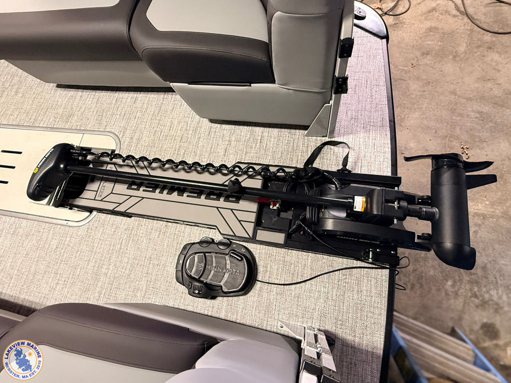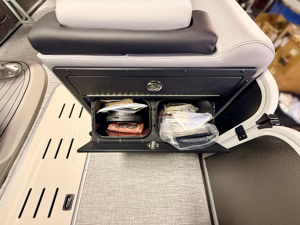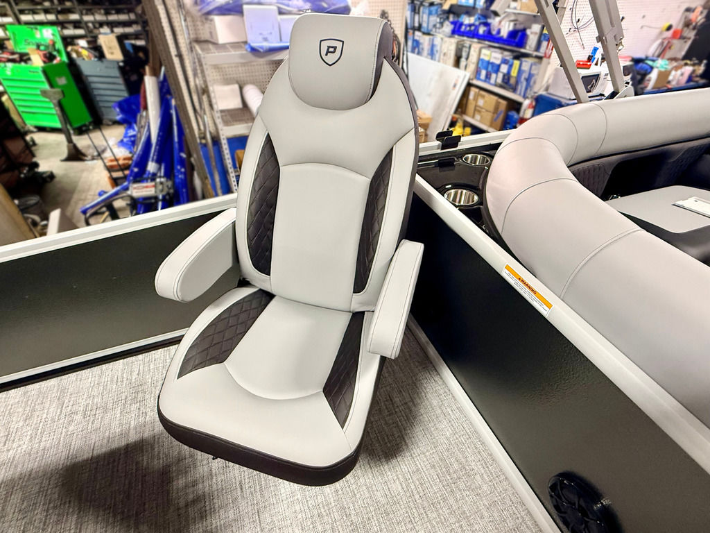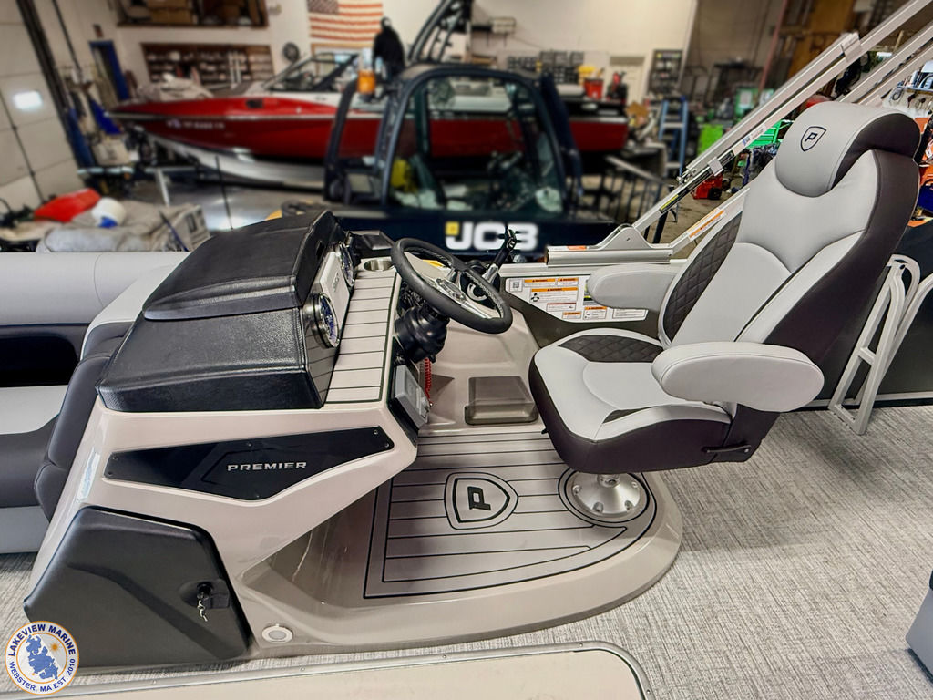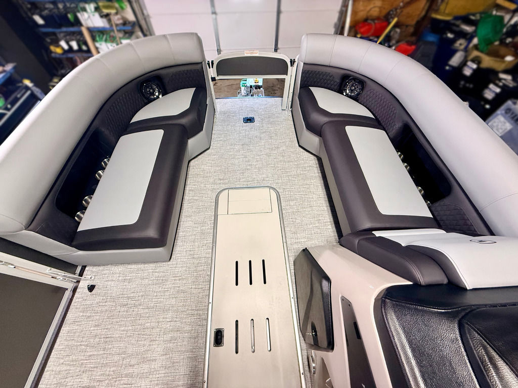The Angler Series from Premier Pontoons is the smartest fish-ready pontoon in the industry. This tritoon is paired with the ultra-reliable Yamaha 150hp V-Max SHO Outboard and features an open water panel that easily swings open and stows out of the way, giving you direct access to the water. The Minn Kota Terrova Trolling Motor easily stows, revolutionizing the trolling motor experience! The rear fishing station features a livewell, 6 rod holders, bait bucket, fishing ruler, tackle boxes (3), 2 fishing chairs and drawer storage. We can't wait to show you this phenomenal fishing model!