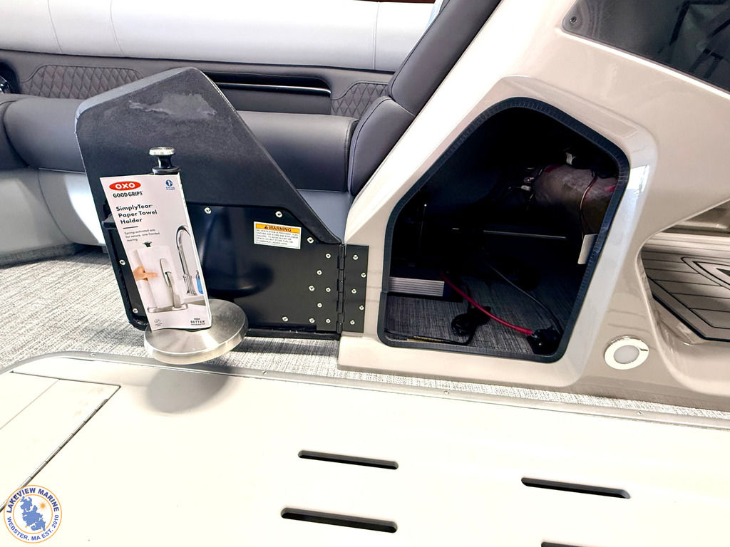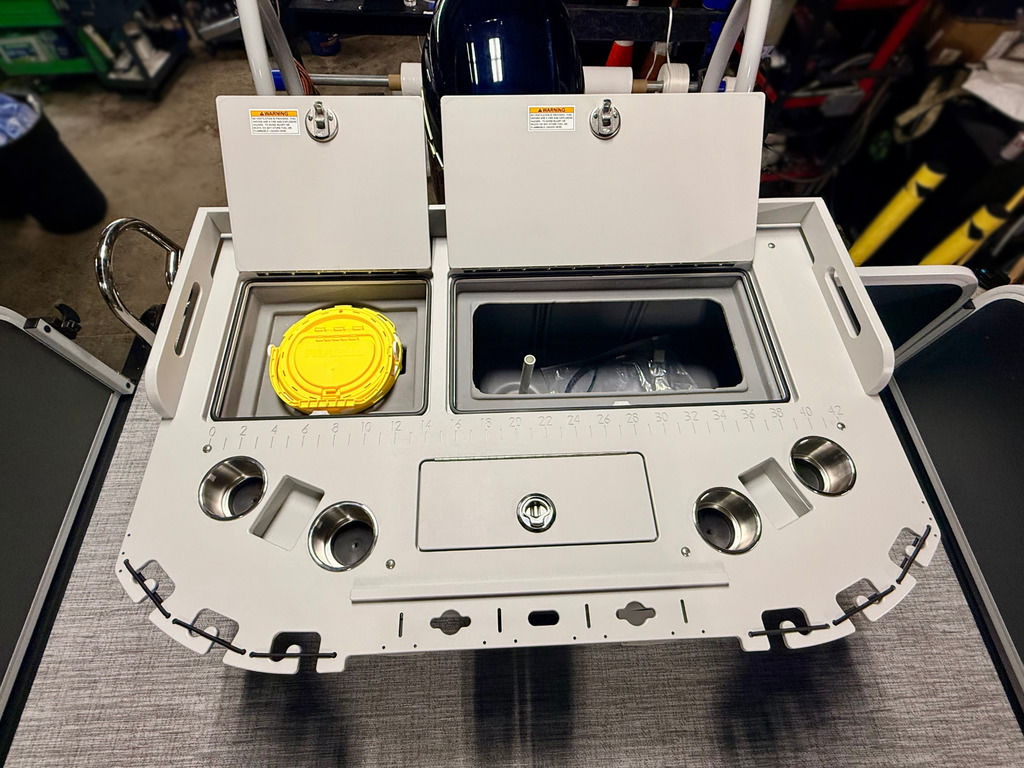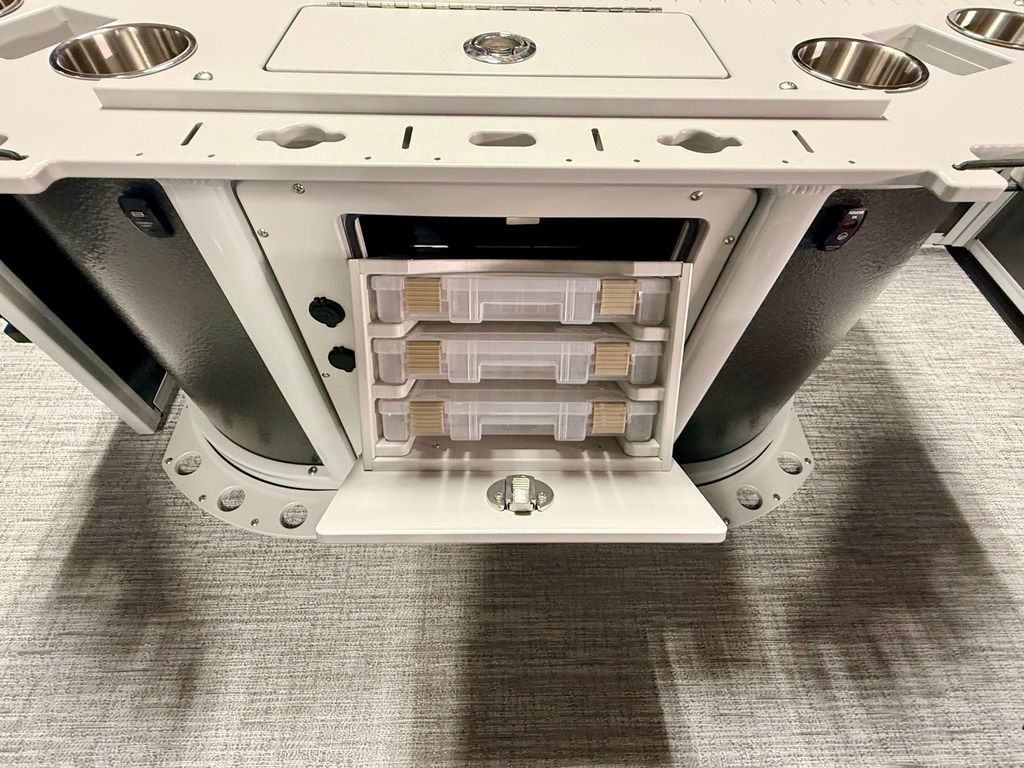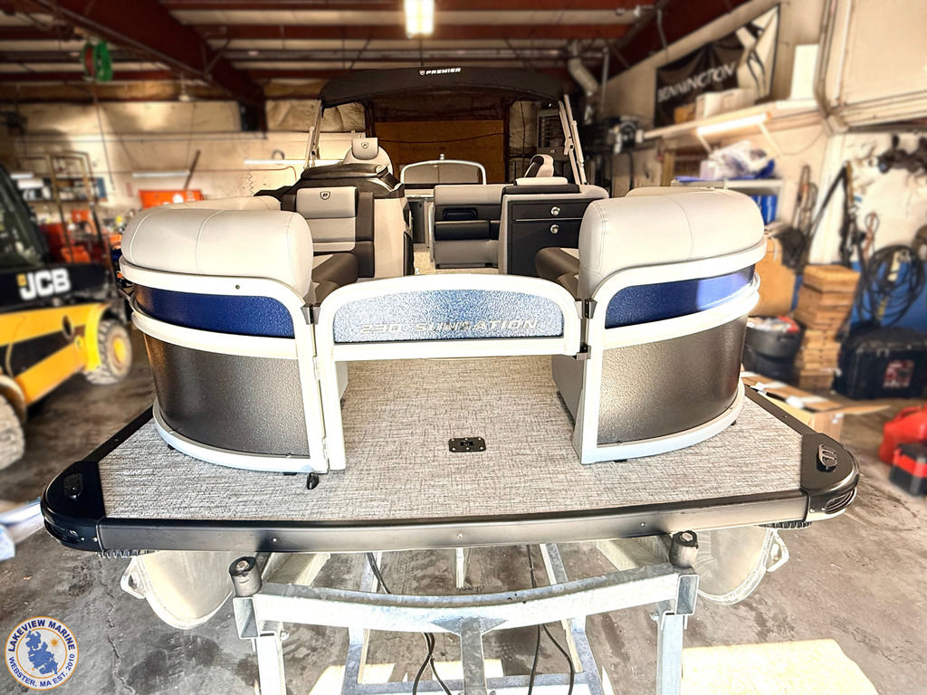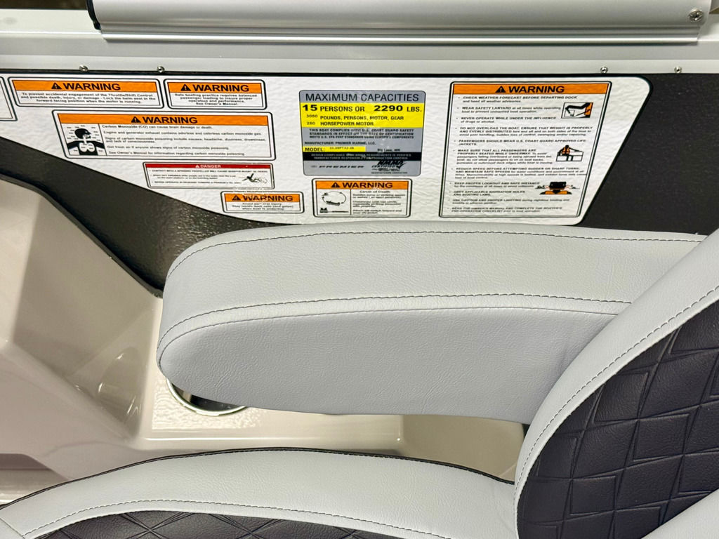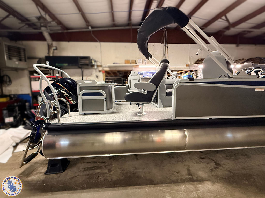 The Angler Series from Premier Pontoons is the smartest fish-ready pontoon in the industry. This tritoon is paired with the ultra-reliable Yamaha 150hp V-Max SHO Outboard and features an open water panel that easily swings open and stows out of the way, giving you direct access to the water. The Minn Kota Terrova Trolling Motor easily stows, revolutionizing the trolling motor experience! The rear fishing station features a livewell, 6 rod holders, bait bucket, fishing ruler, tackle boxes (3), 2 fishing chairs and drawer storage. We can't wait to show you this phenomenal fishing model!