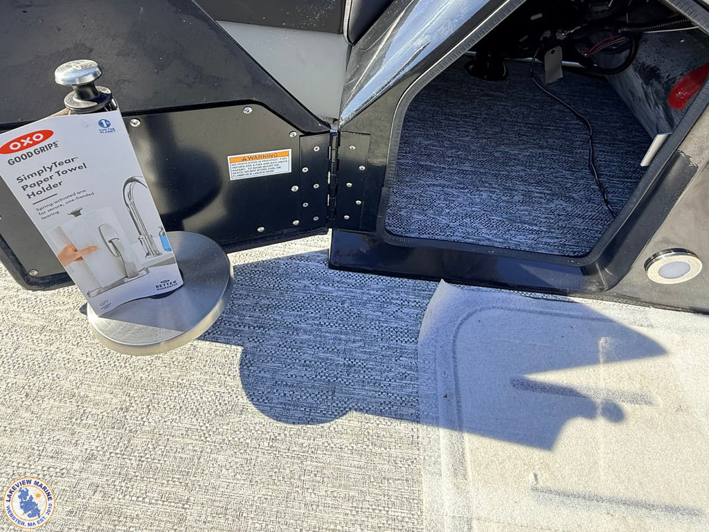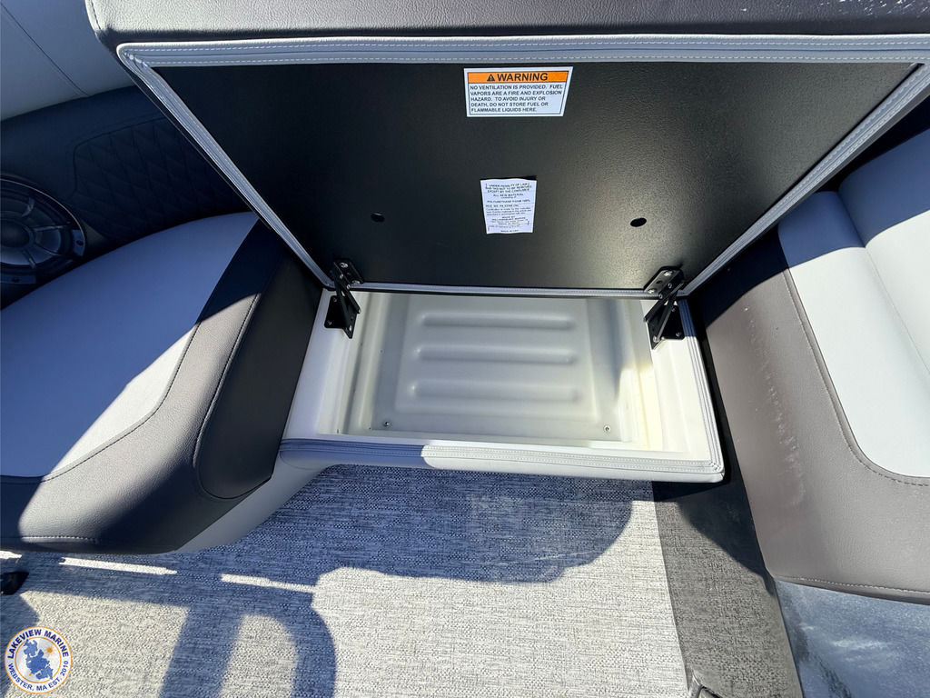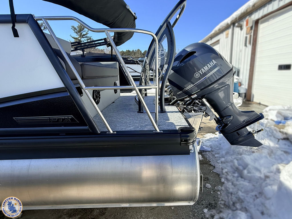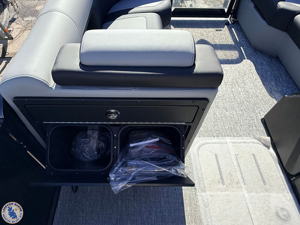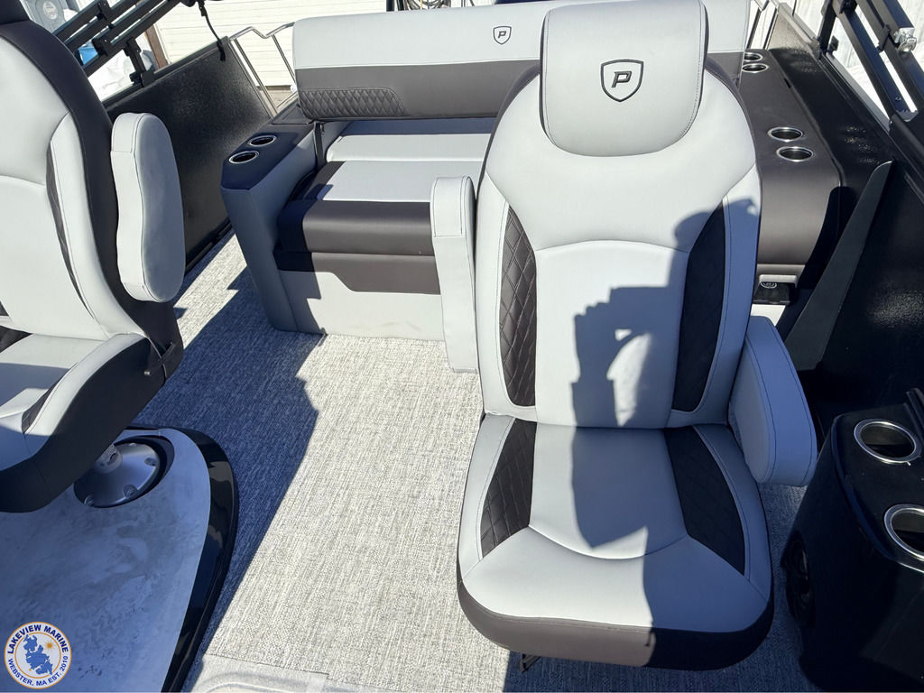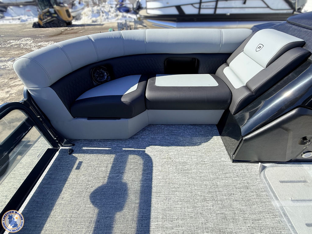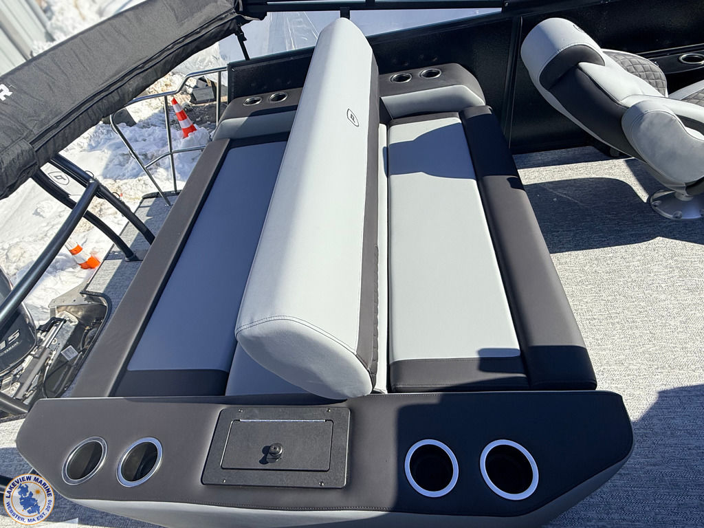 This Tritoon offers a convertible rear lounge/bed with bow starboard & port side couches and is paired with the Yamaha 115hp Outboard. Features include Hydraulic Steering, 4" Wide Ricochet Ladder that automatically retracts when you initiate forward movement, Lighted Ski Tow Bar, Black Fiberglass Helm, Dual Analog Gauges & Simrad NSX 7 Display, 10' Power Bimini, Couch Toe Kick Lights and more!
