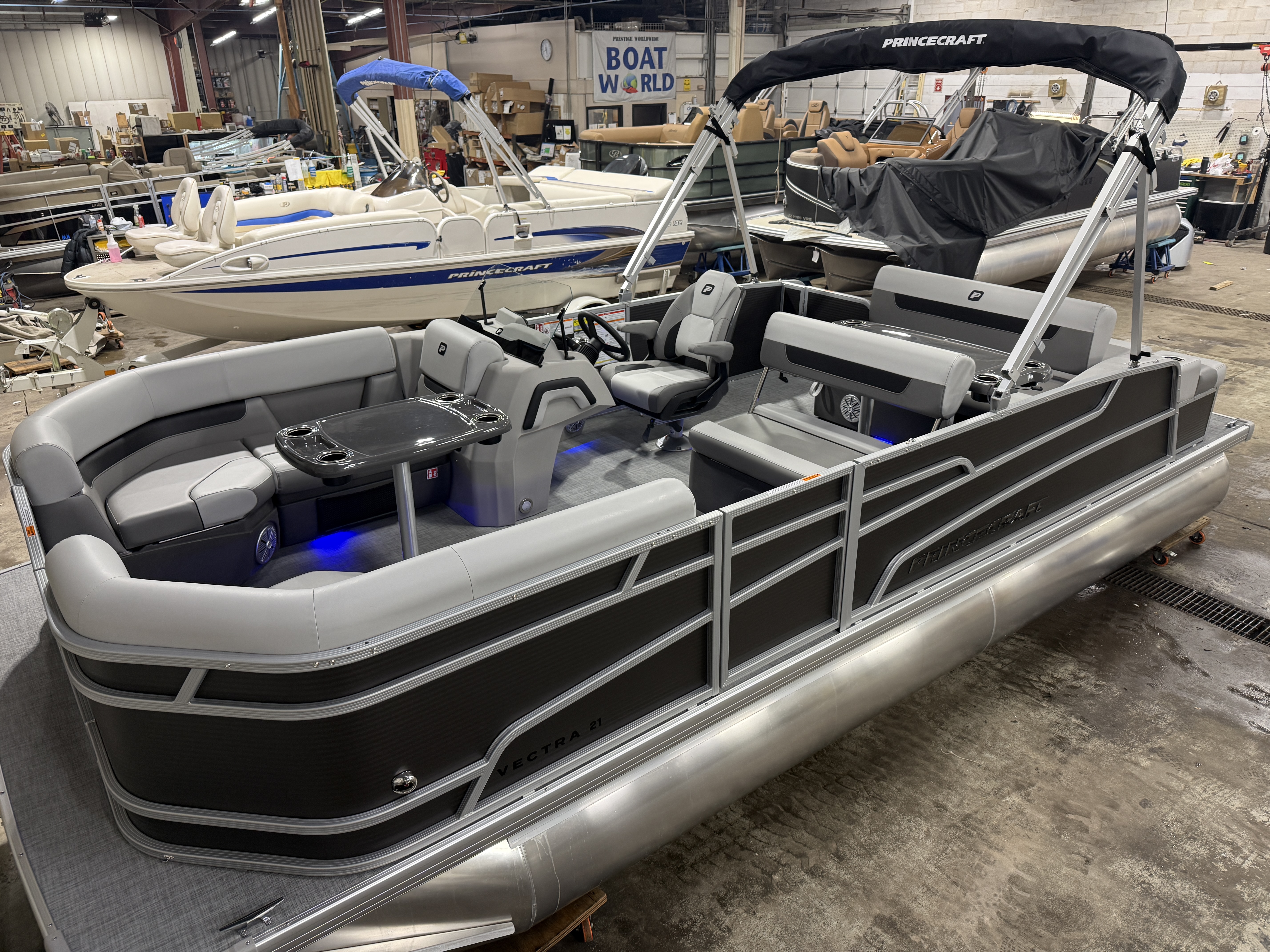 2026 Princecraft Vectra 21 RL & Mercury 4-Stroke EFI. This 20' Rear Lounger Pontoon Has Lounge Seating Up Front With Storage, Rear Facing Lounge Seating With Storage, Flip Seat With Cooler, Captain's Seat, All Vinyl Floor, Bluetooth Radio/MP3 Player With 4 Speakers, Multiple Cup Holders, New Battery, Bimini Top, Mooring Cover, Two Tables, Built-In 29 Gallon Gas Tank, LED NAV Lights, LED Docking Lights, Mood Package, Tilt Steering, Helm Storage, Huge Rear Swim Deck With 4 Step Stainless Steel Ladder, Nice Front Deck, 25" Tubes. Rated For 10 People.