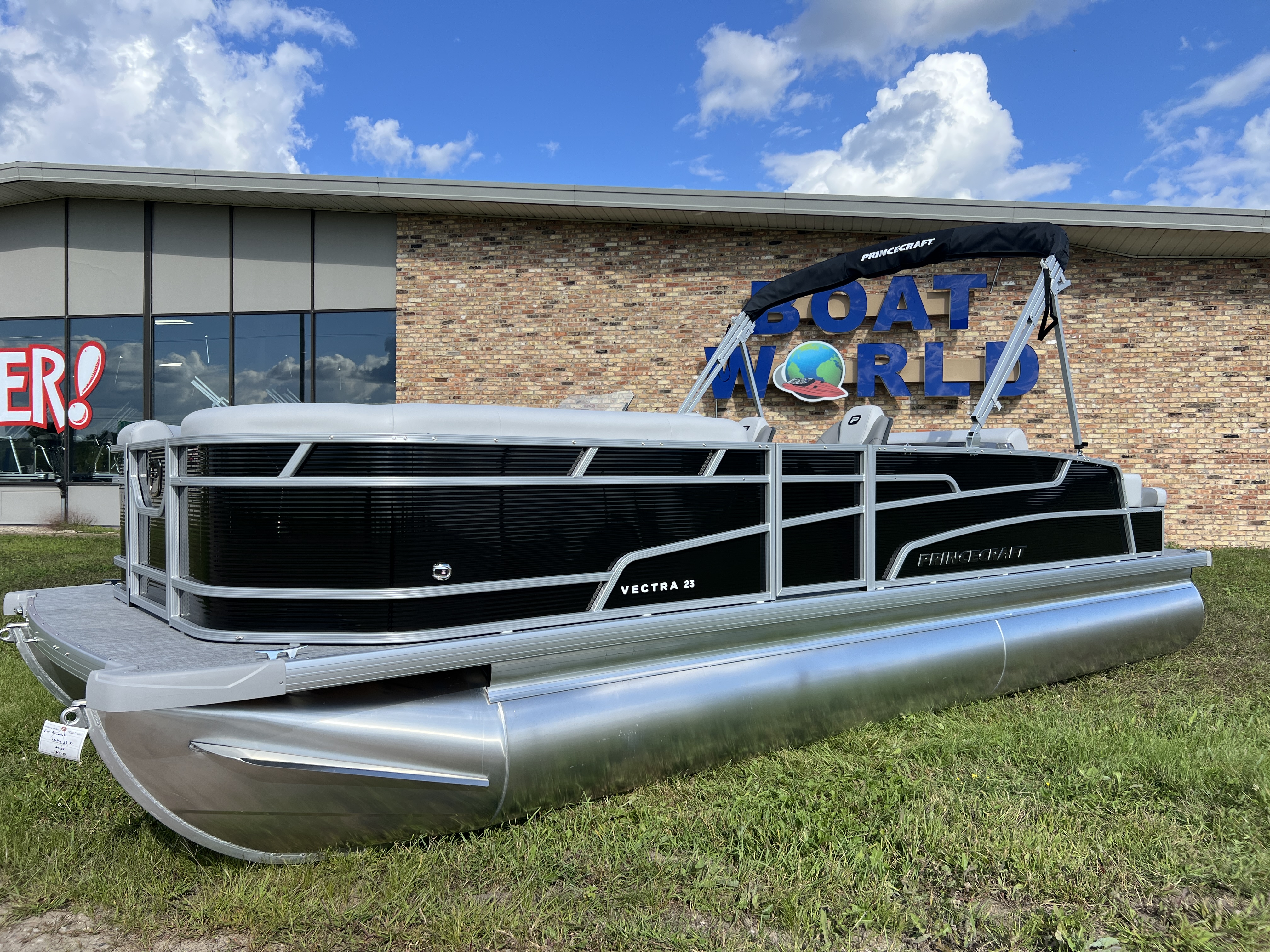 2026 Princecraft Vectra 23 RL Side By Side Swingback Pontoon & Mercury 4-Stroke EFI. This 22' Rear Lounger Pontoon Has Lounge Seating Up Front With Storage, Rear Facing Lounge Seating With Storage, Side By Side Captain's Chairs, All Vinyl Floor, Bluetooth Radio/MP3 Player With 4 Speakers, Multiple Cup Holders, Mood Package, New Battery, Bimini Top, Mooring Cover, LED Docking Lights, LED Nav Lights, Two Tables, Built-In 29 Gallon Gas Tank, Tilt Steering, Helm Storage, Huge Rear Swim Deck With 4 Step Stainless Steel Ladder, Nice Front Deck, 25" Tubes. Rated For 12 People.