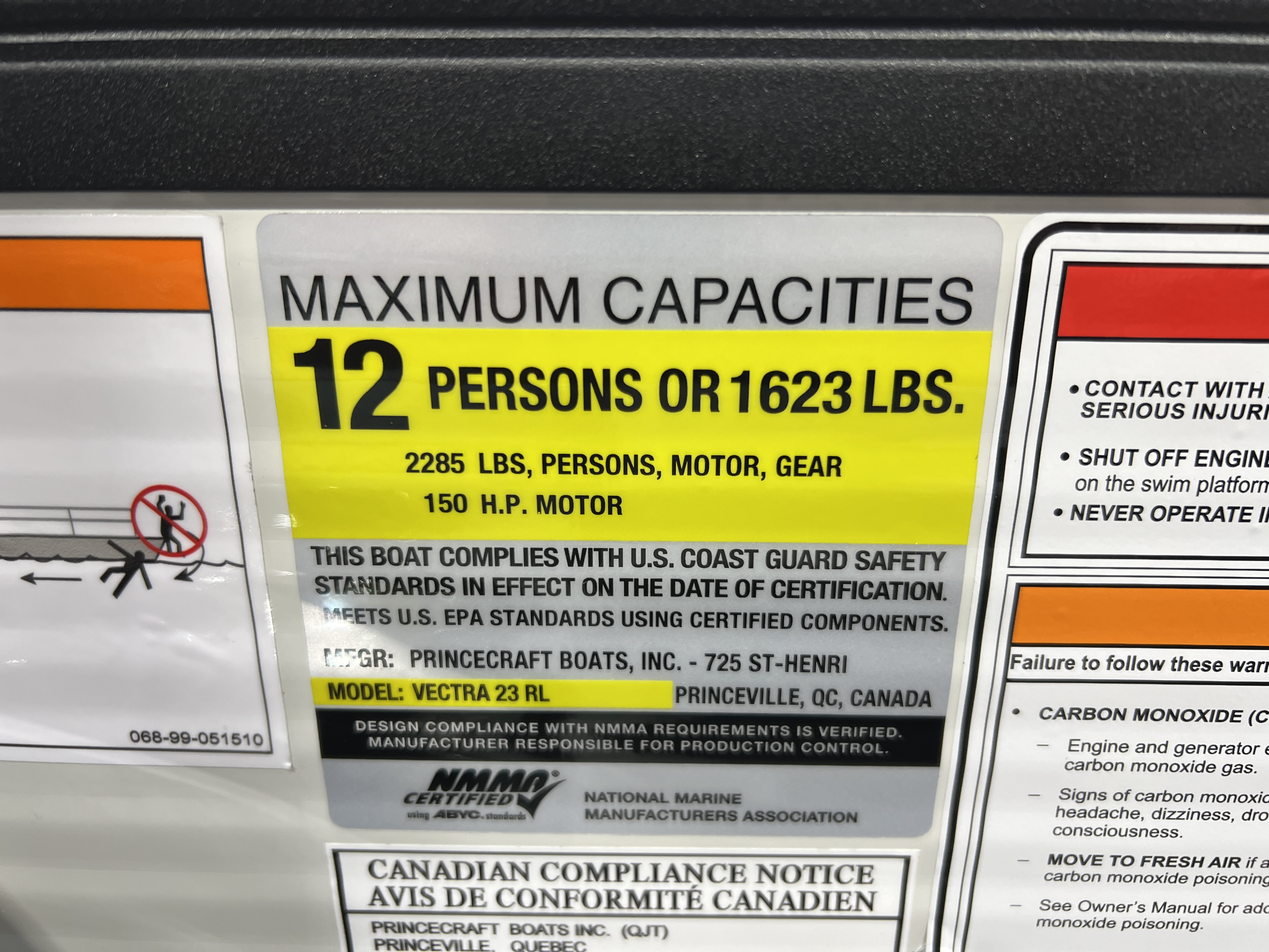 2026 Princecraft Vectra 23 RL Side By Side Swingback Pontoon & Mercury 4-Stroke EFI. This 22' Rear Lounge Swingback Pontoon Has Lounge Seating Up Front With Storage, Rear Facing Lounge Seating With Storage, Side By Side Captain's Chairs, All Vinyl Floor, Bluetooth Radio/MP3 Player With 4 Speakers, Multiple Cup Holders, Blackout Package, Mood Package, New Battery, Bimini Top, Mooring Cover, LED Docking Lights, LED Nav Lights, Two Tables, Built-In 29 Gallon Gas Tank, Tilt Steering, Helm Storage, Huge Rear Swim Deck With 4 Step Stainless Steel Ladder, Nice Front Deck, 25" Tubes. Rated For 12 People.