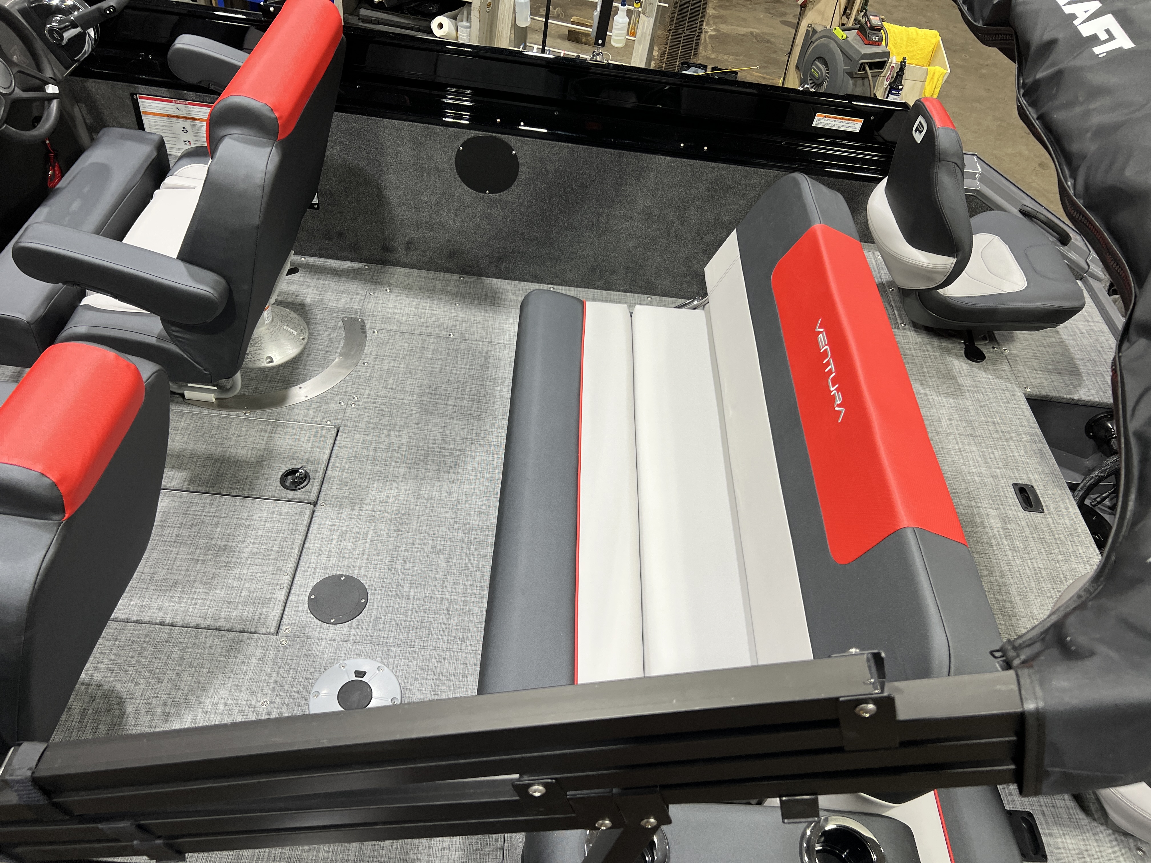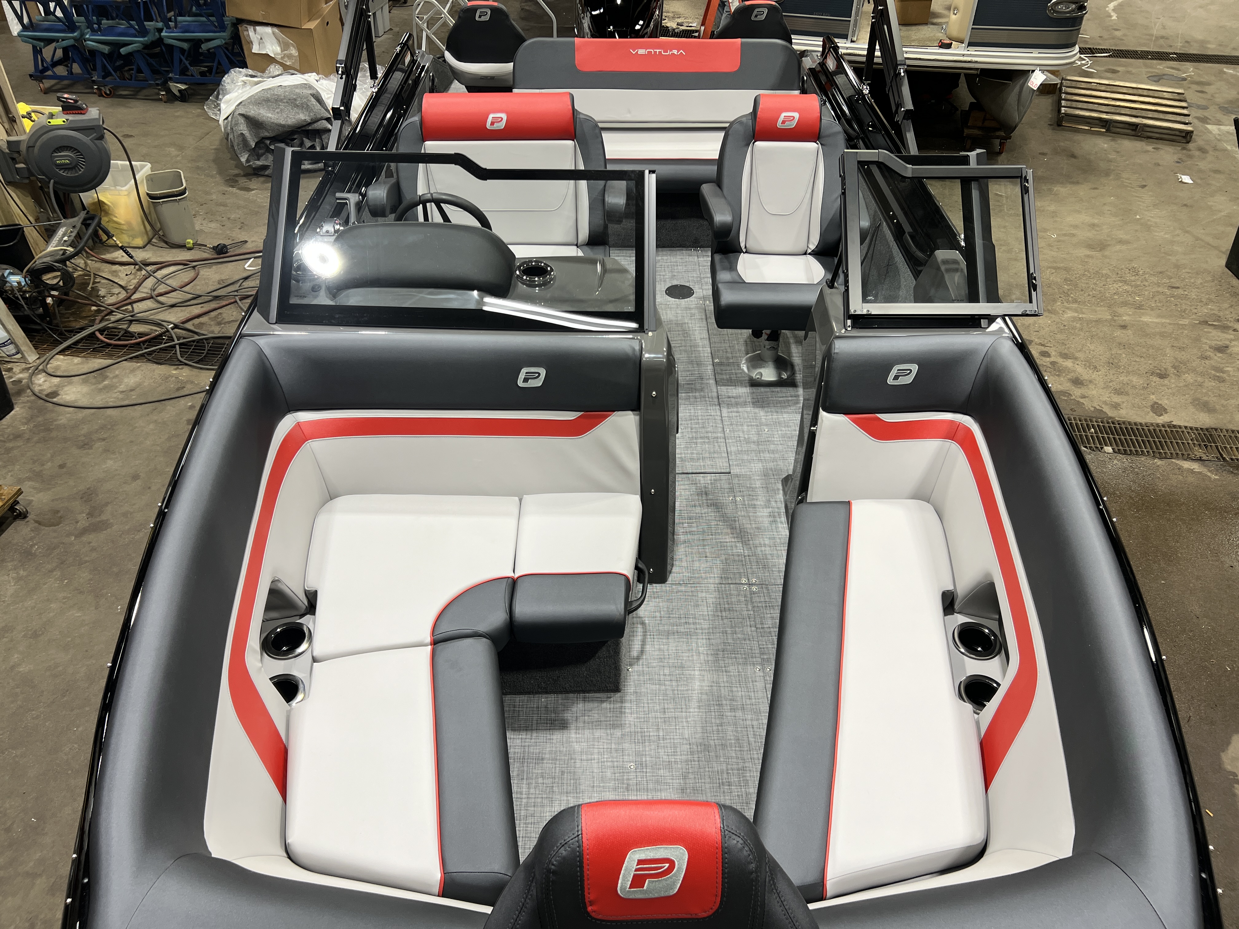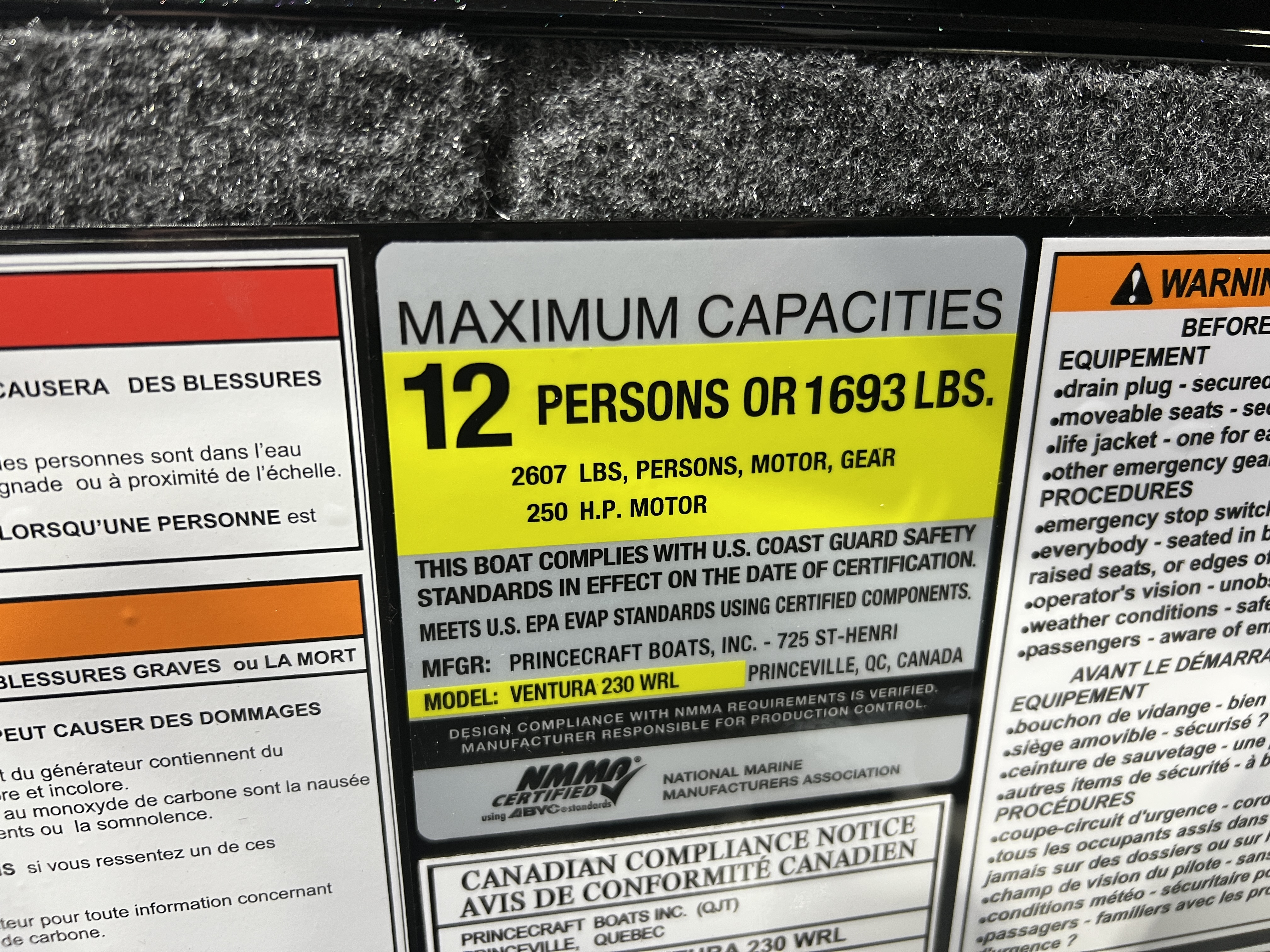 2026 Princecraft Ventura 230 WRL Swingback Fishing Deckboat & Mercury 4-Stroke EFI. This 22' Walk Through Windshield Deck Boat Has A Front Deck Wired For Trolling Motor (Not Included But Available) & Fishing Seat, Front Deck Storage Compartment w/ 3 Battery Trays & Battery Charger, Front Bench Seating (1 Chaise Lounge) With Storage, Side By Side Huge Captain's Seats w/Bolsters, Swingback Lounge Seating w/Storage, 2 Rear Fishing Seats, Rear Storage, Stern Seat Cushion, Rear Livewell/Baitwell, NAV Lights, LED Docking Lights, Floor Storage w/Rod Storage, All Vinyl Flooring, Protective Cover, Built-In 46 Gallon Gas Tank, New Battery, Entertainment Package (Ski Tow Bar, Swim Platform, Bolster Captain's Chair), Seastar Hydraulic Steering w/Tilt, Simrad Depthfinder w/Total Scan (Side Imaging), Black Bimini Top, Pop Up Privacy Enclosure, Premium High Power Stereo System, Rod Holder Support (Starport Track Mount Included), Bait Board & Acc Tray, Storage System, Platform Accessory, Battery Switch, 2 Quick Release Fender Hangers, Multiple Cup Holders, Table. Rated For 12 People.