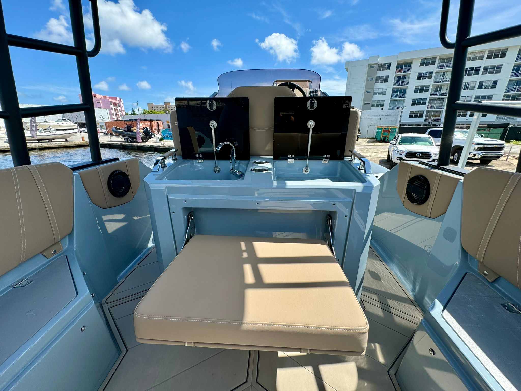 Powered by a maximum of 600 horsepower, the Cayman 28.0 Executive can reach high speeds while maintaining stability and control. The sleek and sporty design of the boat enhances its performance and adds to its overall aesthetic appeal.
