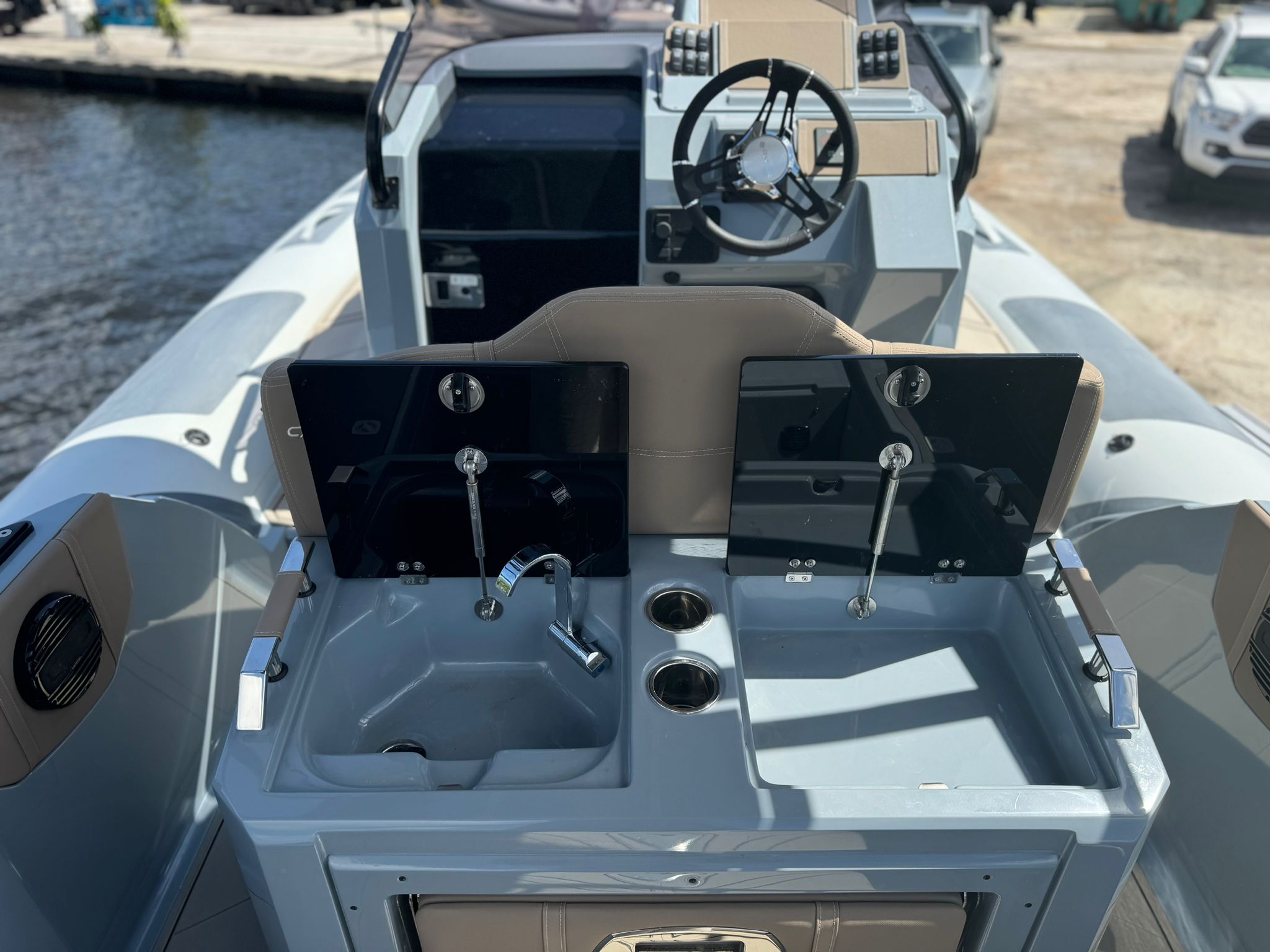 Inside the cabin, there are two beds that provide comfortable sleeping arrangements for passengers who want to spend the night on board. The dinette space is equipped with a table and electric grill, making it perfect for serving meals or hosting social gatherings.