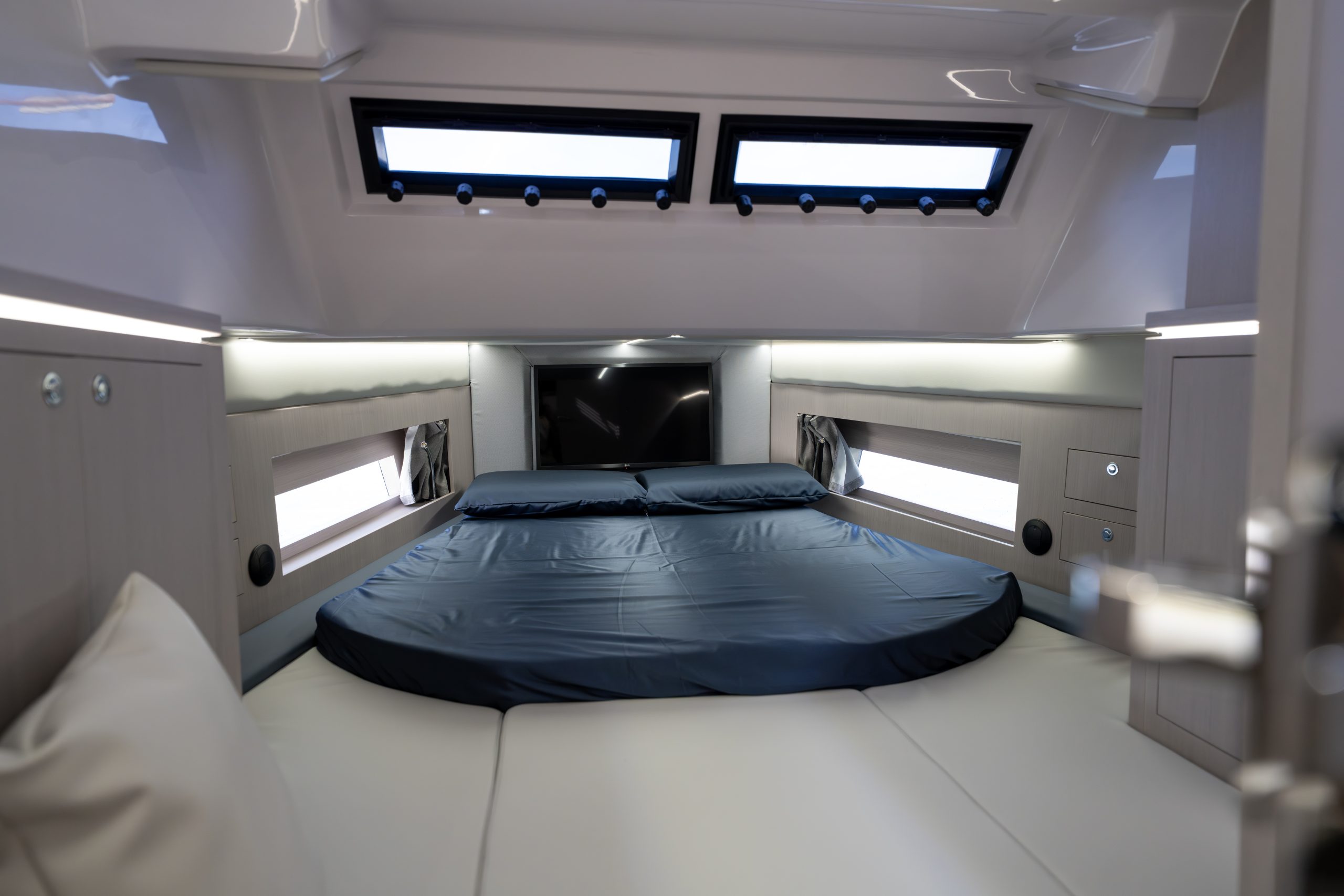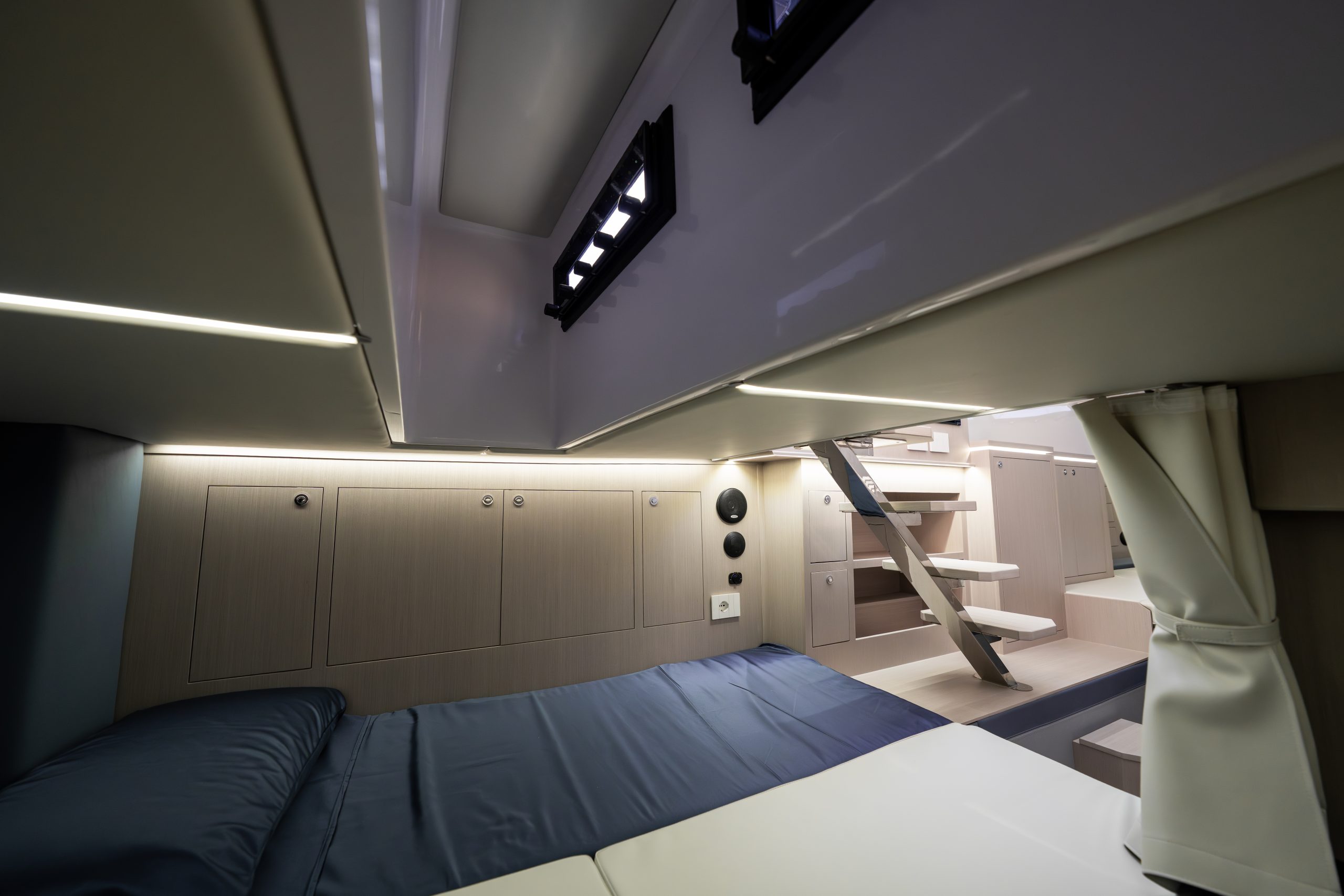 The interior of the yacht is designed with comfort and luxury in mind, featuring a spacious salon with a U-shaped sofa and a fully equipped galley (kitchen) with high-end appliances. The yacht can accommodate up to 4 guests in two cabins, each with its own en-suite bathroom. The master cabin is located in the bow and features a queen-size bed, while the guest cabin is located amidships and features two twin beds that can be converted into a double bed.