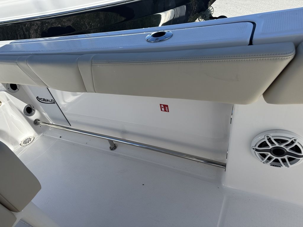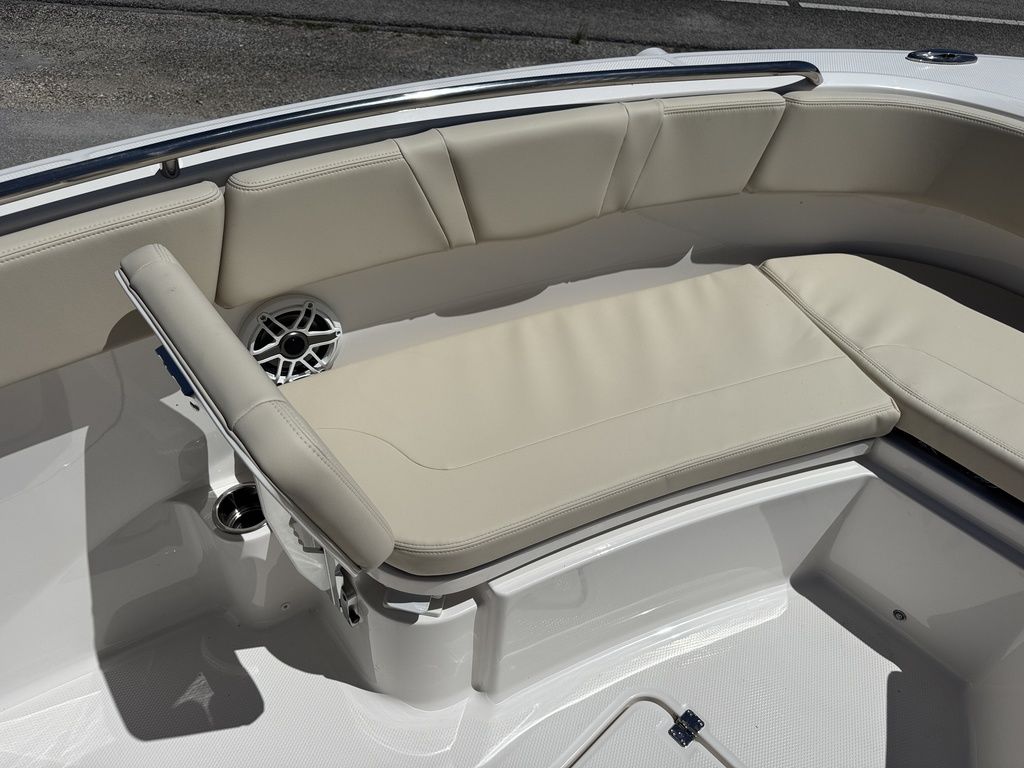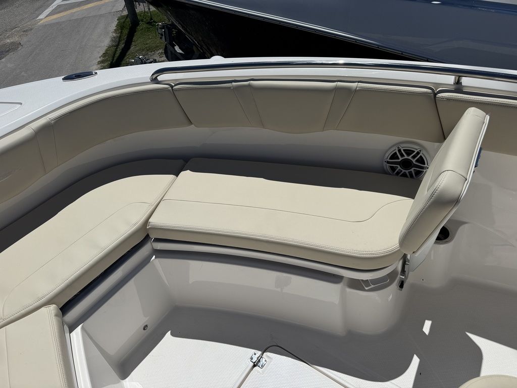 - Factory-Installed Options: White Hull, Garmin GPSMap 1243XSV, Garmin NMEA 2000 Starter Package with Audio Interface, Trim Tabs, JL Audio Premium Sound Package, Marine Head with Gravity Overboard Discharge, Deluxe Leaning Post, Removable Bow Seating Backrests, Cockpit Tackle Storage, Custom Anchor, Fresh Water Shower, Dual Batteries, Aluminum Trailer, 5-Year Premium Level Limited Warranty.