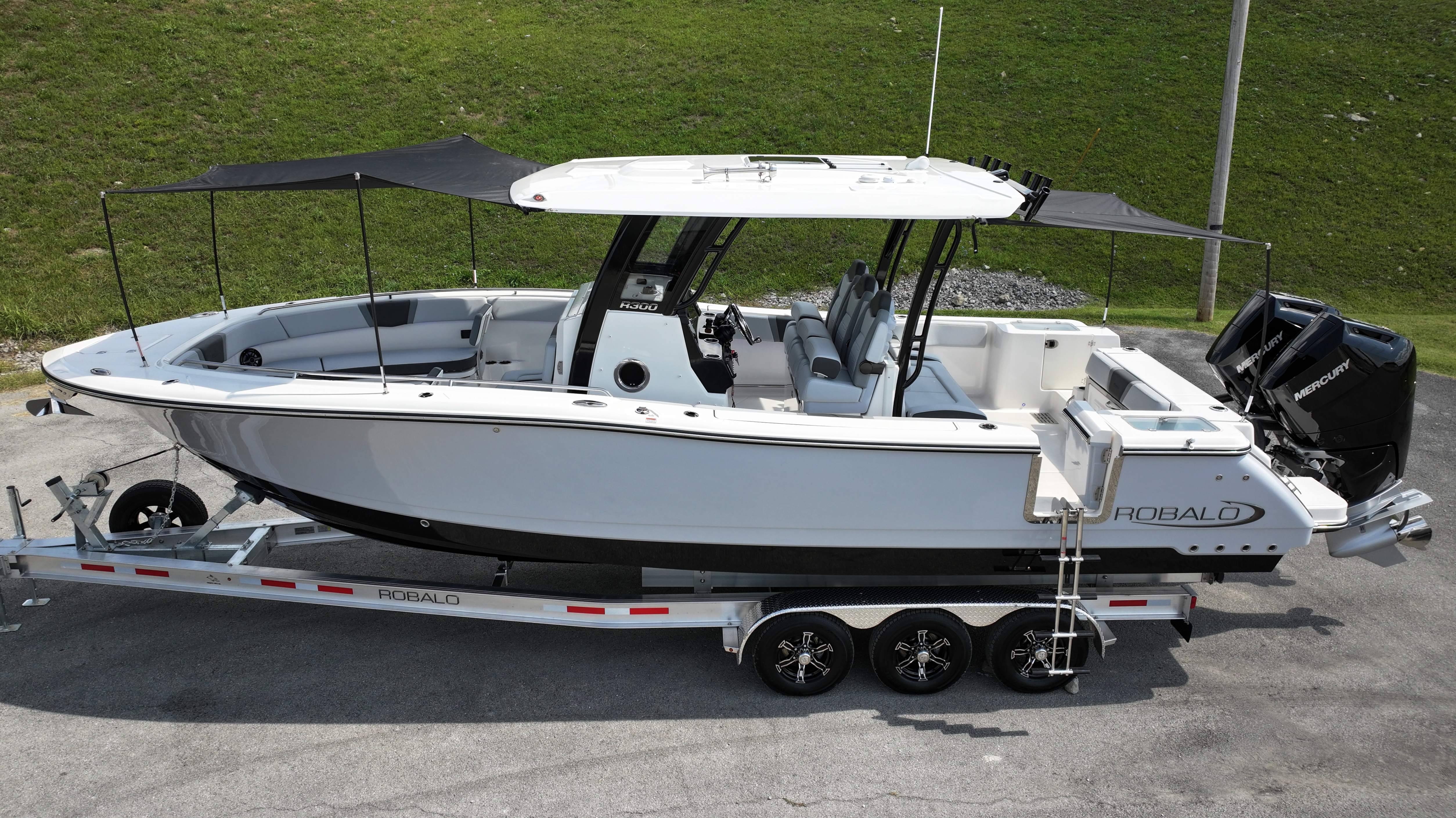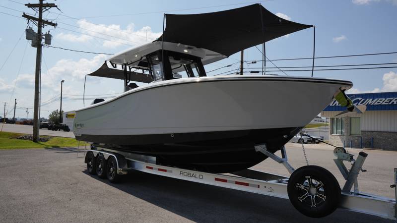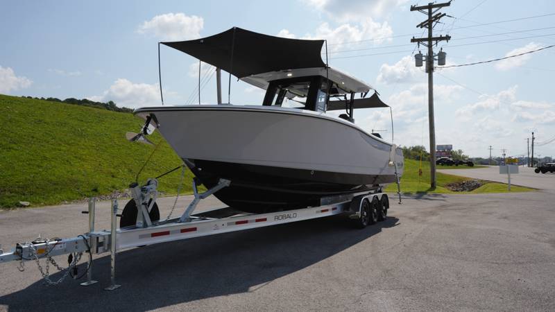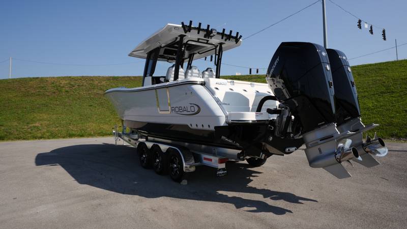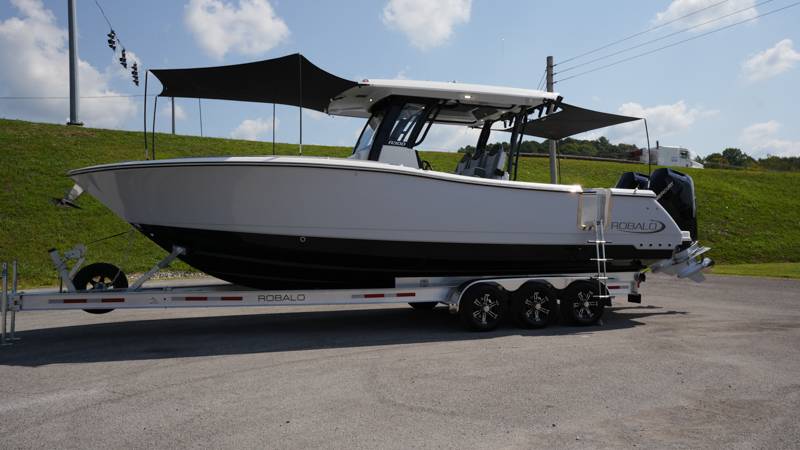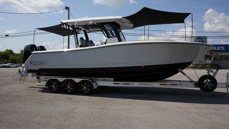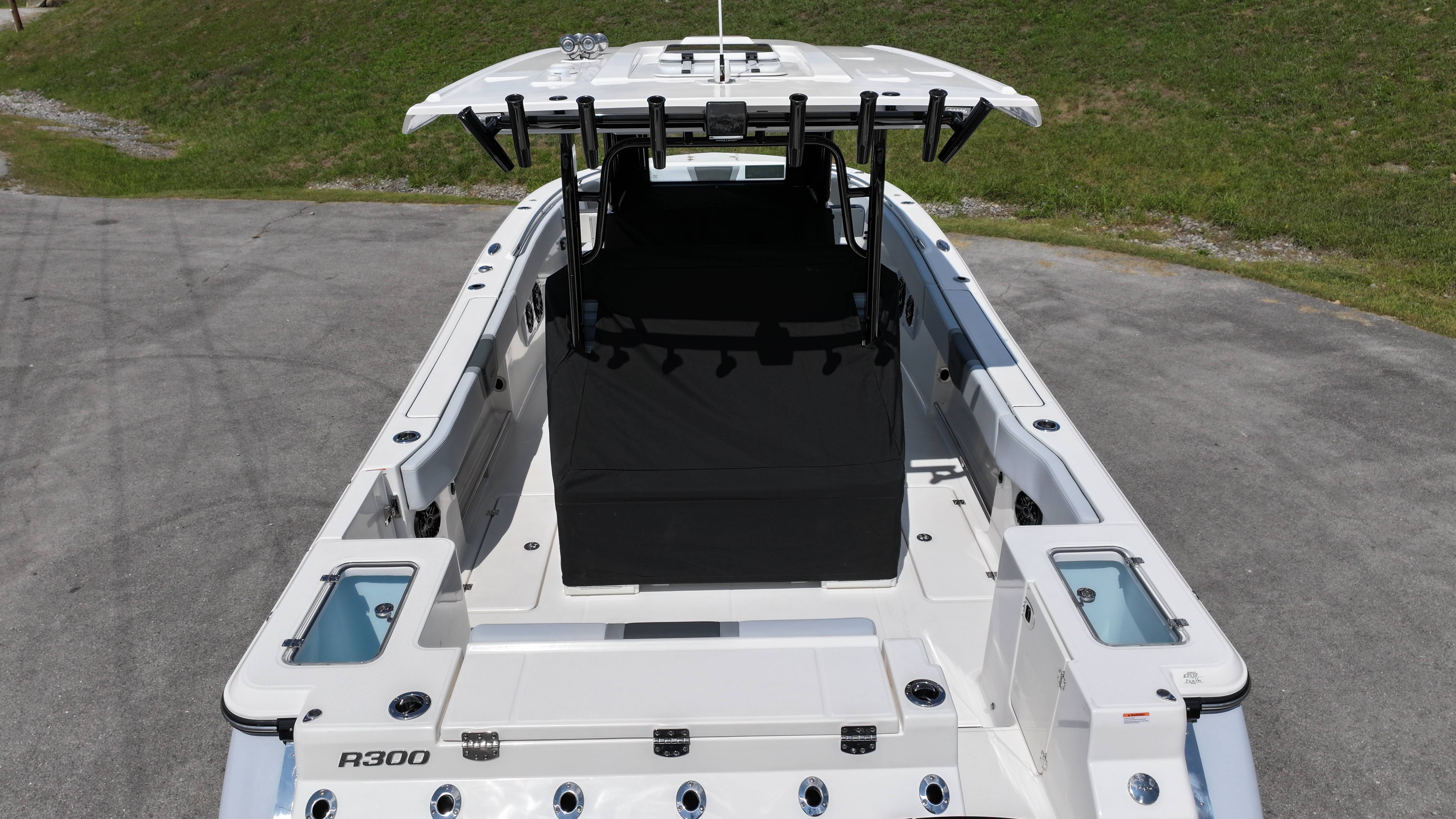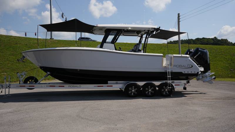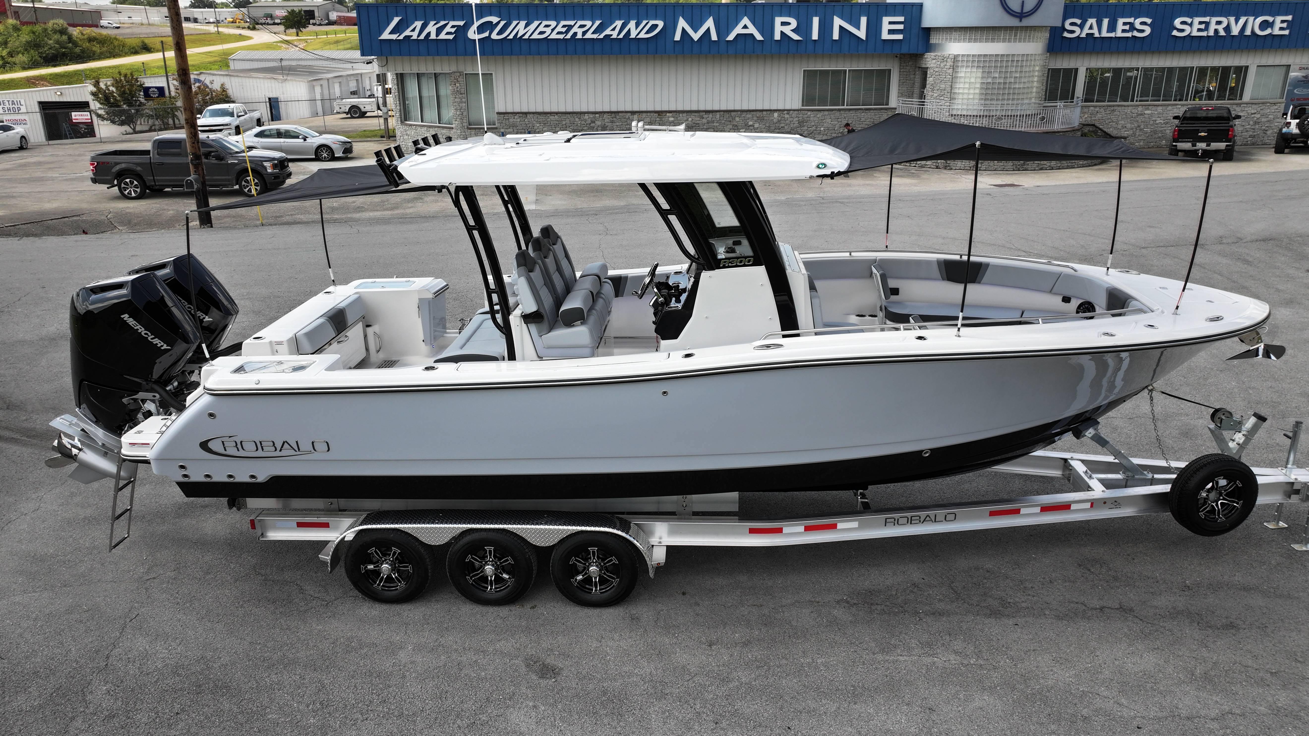 2026 Robalo R300 UNIQUE KEY FEATURES • Aft Cockpit Insulated Fish Boxes (70 Gallons) with Overboard Drains and Discharge Pumps • Aft Facing Bench Seat with Stainless Steel Drink Holders and Carry On 65 Qt Yeti Cooler • Bow Casting Platform Converts to U-Shaped Seating with Removable RTM Fiberglass Filler • Bow Cushions - (Removable) • Cockpit Table and Bow Filler with Dedicated Storage • Custom Bonded Electric Folding Front Windshield and Side Windshield Glass with Integrated Wiper • Electric Freshwater Toilet (Porcelain) Head System with 9 Gallon Holding Tank • Fiberglass Console Door - Friction Hinged with Lockable Latch • Fiberglass Hardtop with Custom Powder Coated Frame (Black or White) Includes: Overhead Sky Light, Rod Holders (8), Electronics Box, Tri Color Map Lights (4), Spreader Lights with •Dual Color (White and Blue - Dimmable) (5), Blue Overhead Courtesy Lighting, Speakers (2), Fresh Water Washdown Shower, and LED Cast Robalo Logo • Fresh Water System with Overhead Shower in Hardtop • Full Transom Seat Folds Flush into Transom Wall • JL Audio includes: (8) Speakers and (2) 10" Subwoofers with LED Lighting, 600 Watt/Mono Channel Amplifier, 800 Watt/8 Channel Amplifier, Volume Knob, and Sirius Satelite • Kevlar Reinforced Hull • Limited Lifetime Hull Warranty • Port Cockpit Side Entry Door with Custom Stainless Steel Frame and Hardware • Premium Stain Resistant Silicone Cockpit Fabric • Self Bailing Cockpit with Integrated Drain System • Stainless Steel Rod Holders Mounted on Deck Gunnels (8) • Stainless Steel Rod Holders Mounted on Transom Wall (6) • Trim Tabs with Indicator Switch • Triple Forward Facing Helm Seats w/ Flip-Up Bolsters and Fold Down Armrests (Includes Center Seat Electric Forward/Aft Control) • Twin Insulated Livewells (28 Gallons) with Specific Livewell Pumps, LED Lighting, Blue Gelcoat Finish, Adjustable Flow Valves, and Clear Plexiglass Lids • Windlass Package Includes: 250' of Rope, 15' Chain, Anchor Windlass with Lanyard, Bow and Helm Control Hull Bottom Gelcoat - Deepwater Black Hull Side Gelcoat - Alloy Gray Cockpit Interior - Harbor Mist Hard Top Complete (Black Powder Coated) Hardtop Underside Gel Color - Alloy Gray Console Cover and Helm Seat Cover - Black Forward Canvas Fly - Black Canvas AFT Canvas Fly - Black Canvas Garmin GPSMap 1643XSV Dual Screens Transducer B175M Upgrade Lenco Pro Trim Tab System Dual Color LED Underwater Lights (2 each) Seadek Helm Mat - White Overboard Discharge Cabin Wood Flooring Stainless Steel Drink/Rod Holders (4) Tackle Storage 12 Volt DC Electric Reel Receptacle Polished Stainless Steel Anchor Gray Water System Pre-Wire for Trolling Motor 5 Year Premium Level Limited Component Warranty Trailer - with Aluminum Wheels and Spare Tire