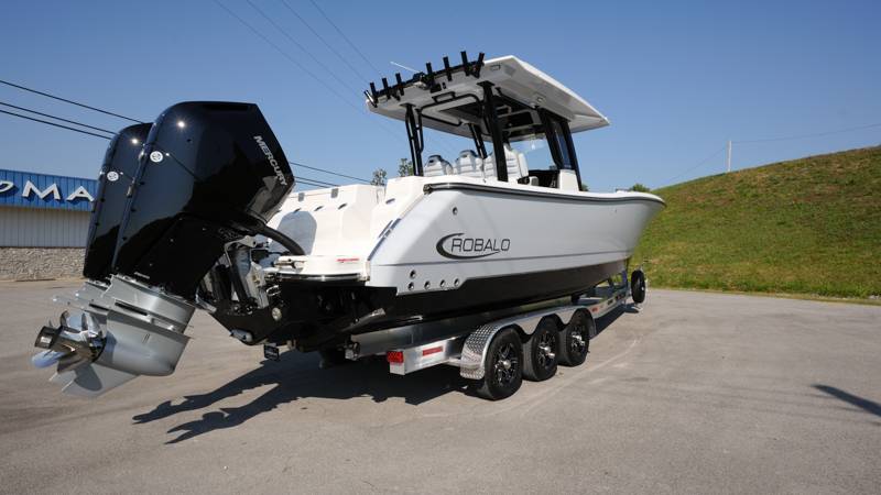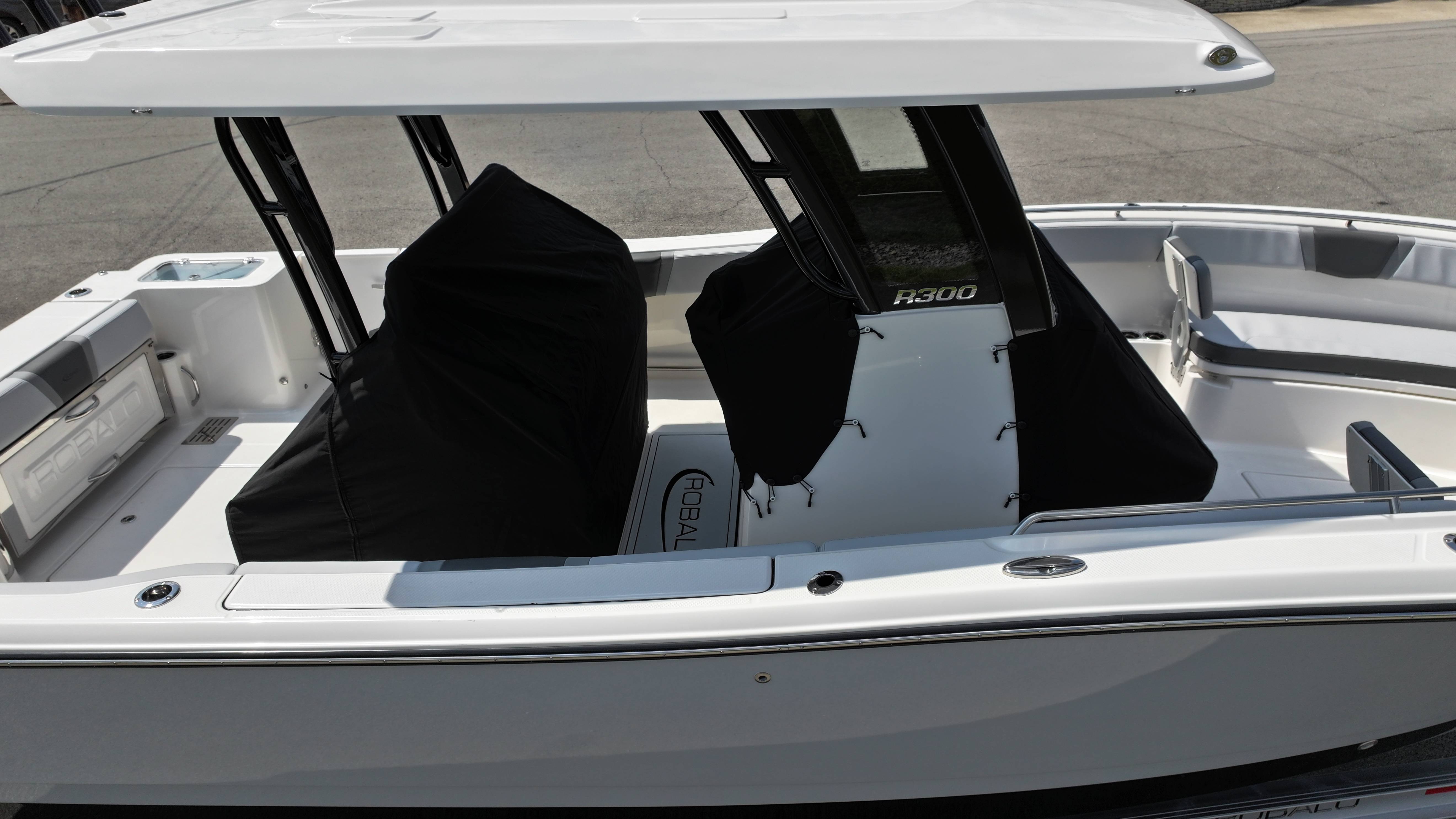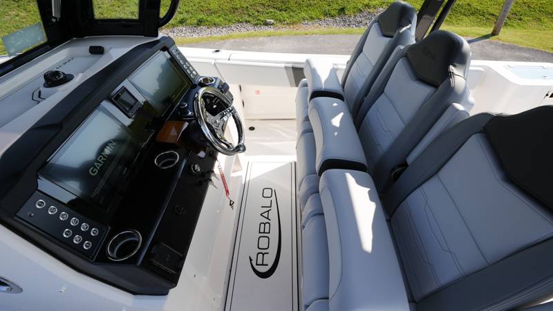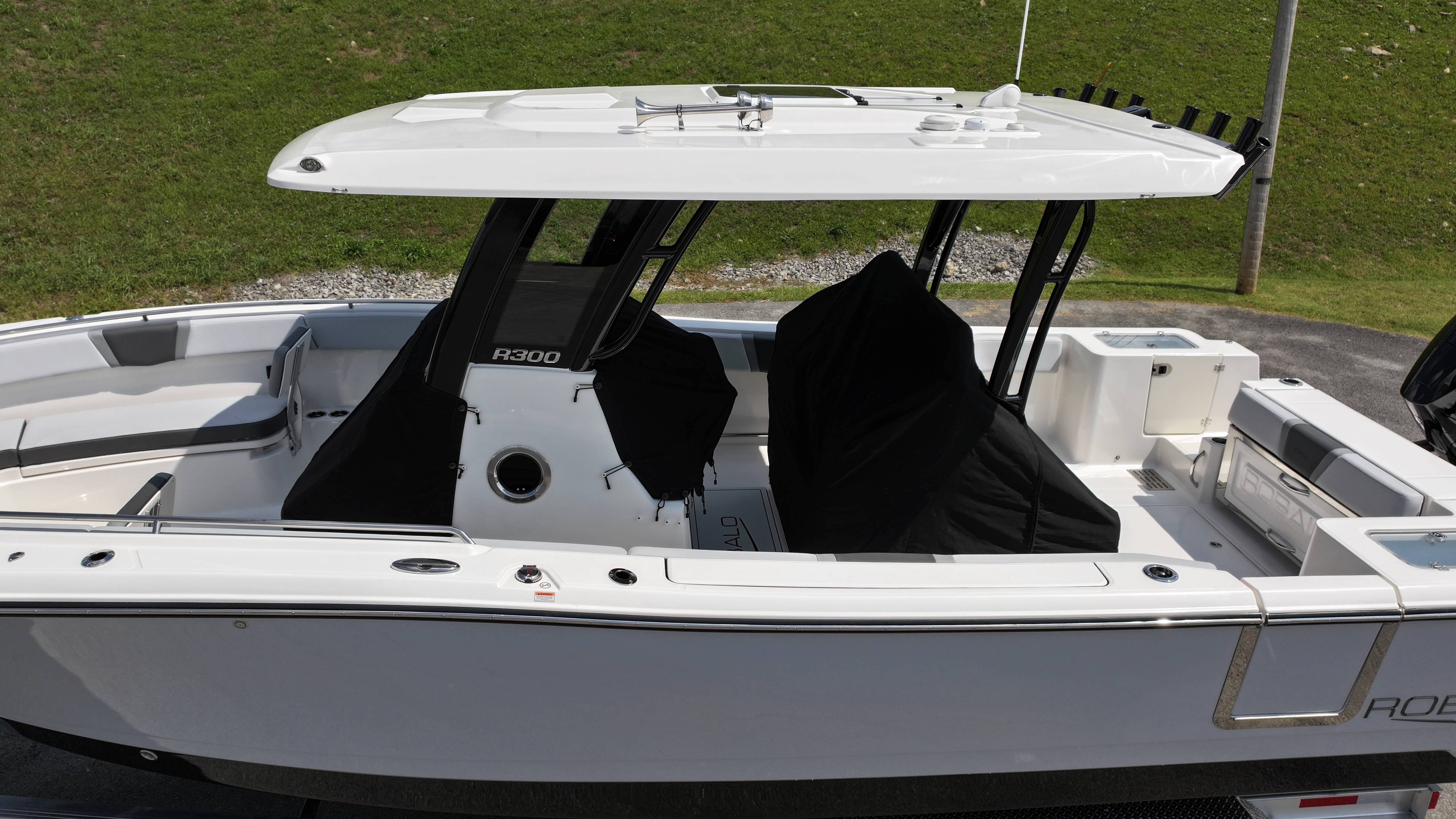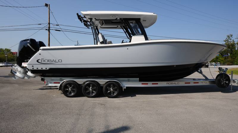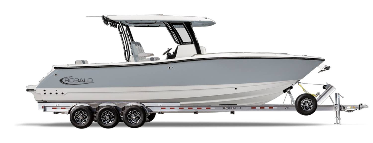2026 Robalo R300 UNIQUE KEY FEATURES • Aft Cockpit Insulated Fish Boxes (70 Gallons) with Overboard Drains and Discharge Pumps • Aft Facing Bench Seat with Stainless Steel Drink Holders and Carry On 65 Qt Yeti Cooler • Bow Casting Platform Converts to U-Shaped Seating with Removable RTM Fiberglass Filler • Bow Cushions - (Removable) • Cockpit Table and Bow Filler with Dedicated Storage • Custom Bonded Electric Folding Front Windshield and Side Windshield Glass with Integrated Wiper • Electric Freshwater Toilet (Porcelain) Head System with 9 Gallon Holding Tank • Fiberglass Console Door - Friction Hinged with Lockable Latch • Fiberglass Hardtop with Custom Powder Coated Frame (Black or White) Includes: Overhead Sky Light, Rod Holders (8), Electronics Box, Tri Color Map Lights (4), Spreader Lights with Dual Color (White and Blue - Dimmable) (5), Blue Overhead Courtesy Lighting, Speakers (2), Fresh Water Washdown Shower, and LED Cast Robalo Logo • Fresh Water System with Overhead Shower in Hardtop • Full Transom Seat Folds Flush into Transom Wall • JL Audio includes: (8) Speakers and (2) 10" Subwoofers with LED Lighting, 600 Watt/Mono Channel Amplifier, 800 Watt/8 Channel Amplifier, Volume Knob, and Sirius Satelite • Kevlar Reinforced Hull • Limited Lifetime Hull Warranty • Port Cockpit Side Entry Door with Custom Stainless Steel Frame and Hardware • Premium Stain Resistant Silicone Cockpit Fabric • Self Bailing Cockpit with Integrated Drain System • Stainless Steel Rod Holders Mounted on Deck Gunnels (8) • Stainless Steel Rod Holders Mounted on Transom Wall (6) • Trim Tabs with Indicator Switch • Triple Forward Facing Helm Seats w/ Flip-Up Bolsters and Fold Down Armrests (Includes Center Seat Electric Forward/Aft Control) • Twin Insulated Livewells (28 Gallons) with Specific Livewell Pumps, LED Lighting, Blue Gelcoat Finish, Adjustable Flow Valves, and Clear Plexiglass Lids • Windlass Package Includes: 250' of Rope, 15' Chain, Anchor Windlass with Lanyard, Bow and Helm Control Hull Side Gelcoat - Alloy Gray Cockpit Interior - Harbor Mist Hard Top Complete (Black Powder Coated) Hardtop Underside Gel Color - Alloy Gray Console Cover and Helm Seat Cover - Black Forward Canvas Fly - Black Canvas AFT Canvas Fly - Black Canvas Garmin GPSMap 1643XSV Dual Screens Transducer B175M Upgrade Lenco Pro Trim Tab System Dual Color LED Underwater Lights (2 each) Seadek Helm Mat - White Overboard Discharge Cabin Wood Flooring Stainless Steel Drink/Rod Holders (4) Tackle Storage 12 Volt DC Electric Reel Receptacle Polished Stainless Steel Anchor Gray Water System Pre-Wire for Trolling Motor 5 Year Premium Level Limited Component Warranty Trailer - with Aluminum Wheels and Spare Tire