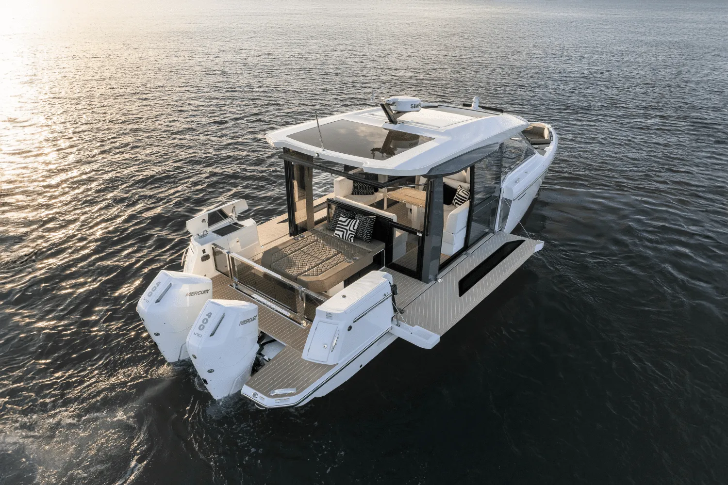 Equipped with twin outboard engines, the 400 GTC offers exceptional speed and agility, ensuring you can navigate waters with ease and efficiency. Its stable yet agile hull design effortlessly cuts through waves for a smooth ride, while its lightweight construction enhances fuel efficiency without compromising strength.